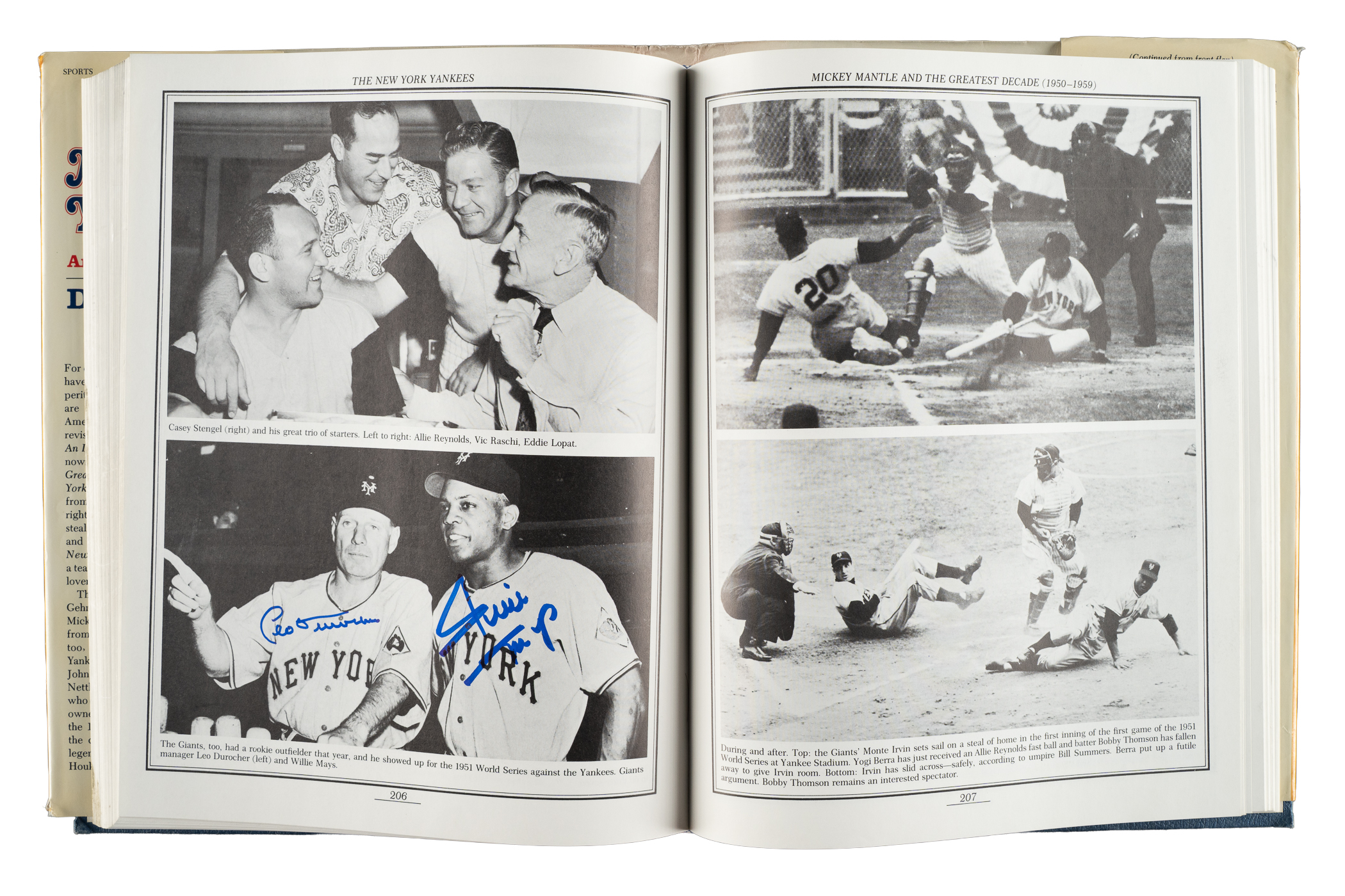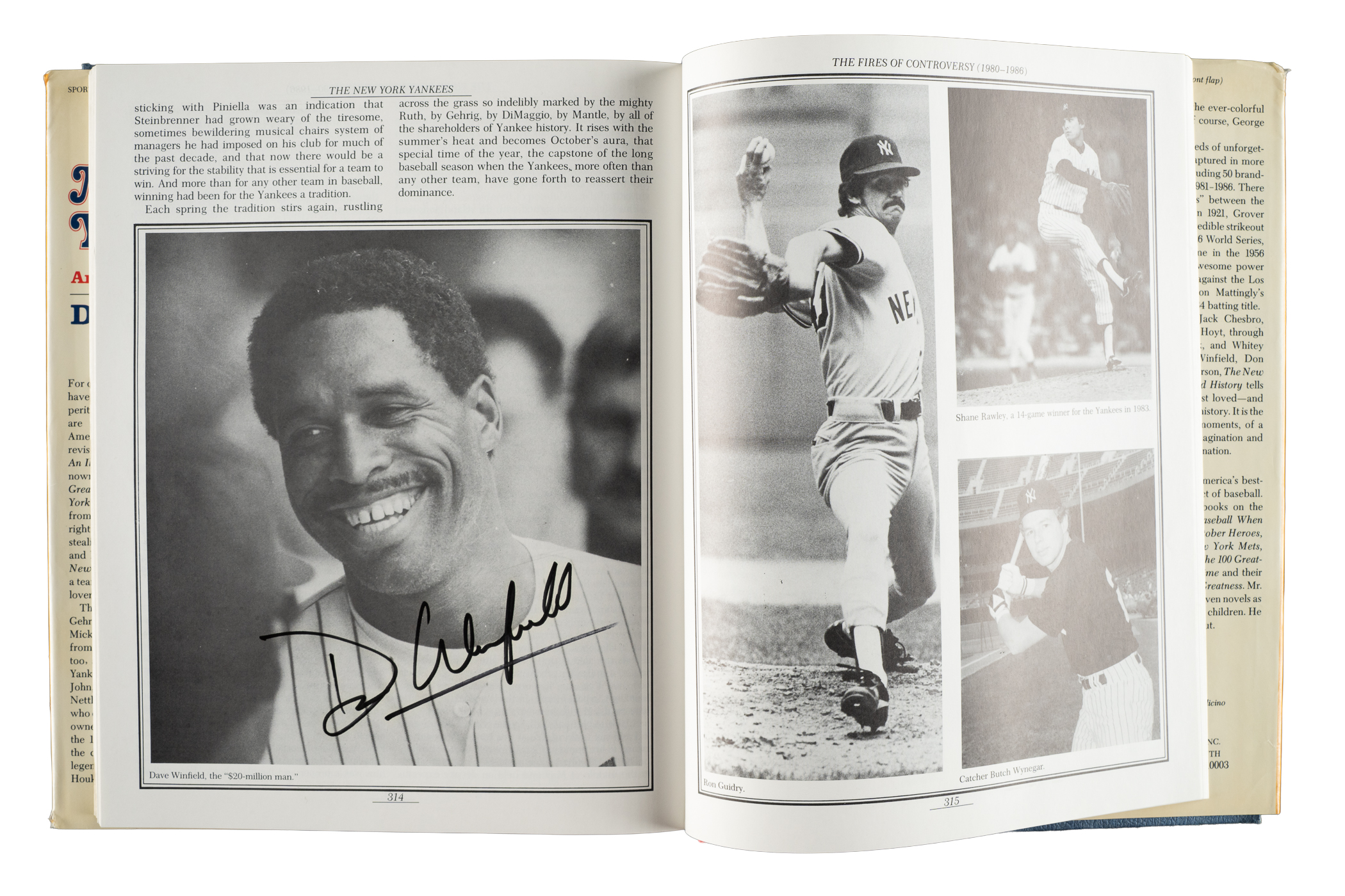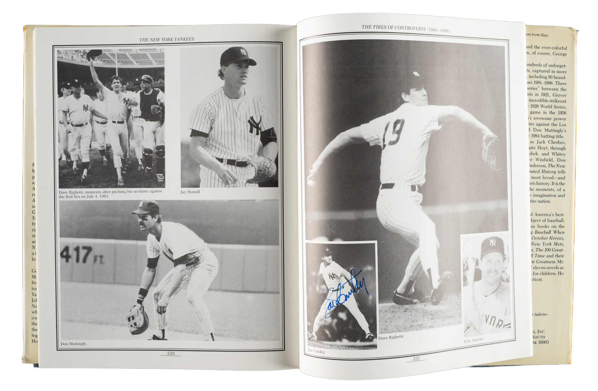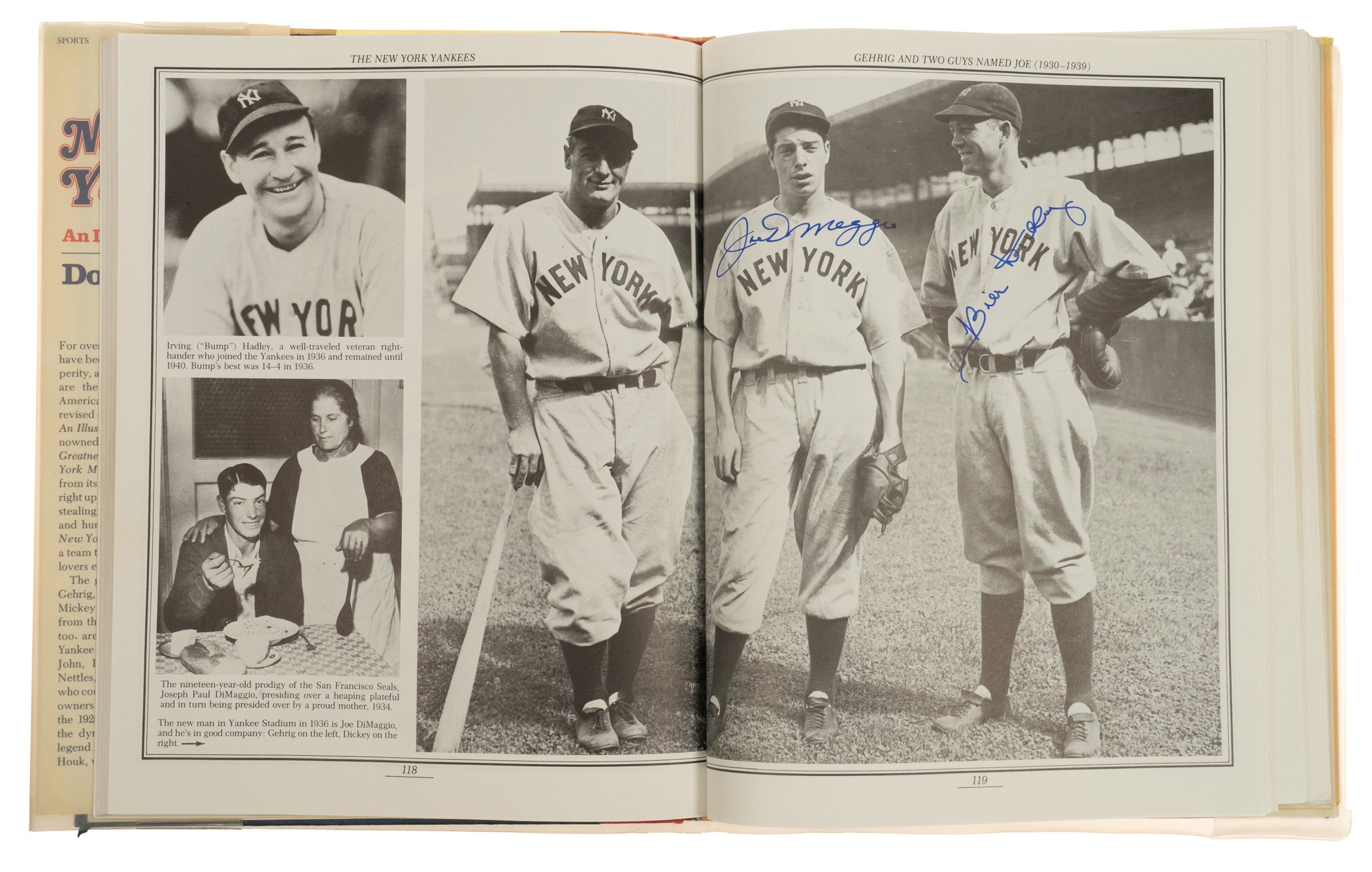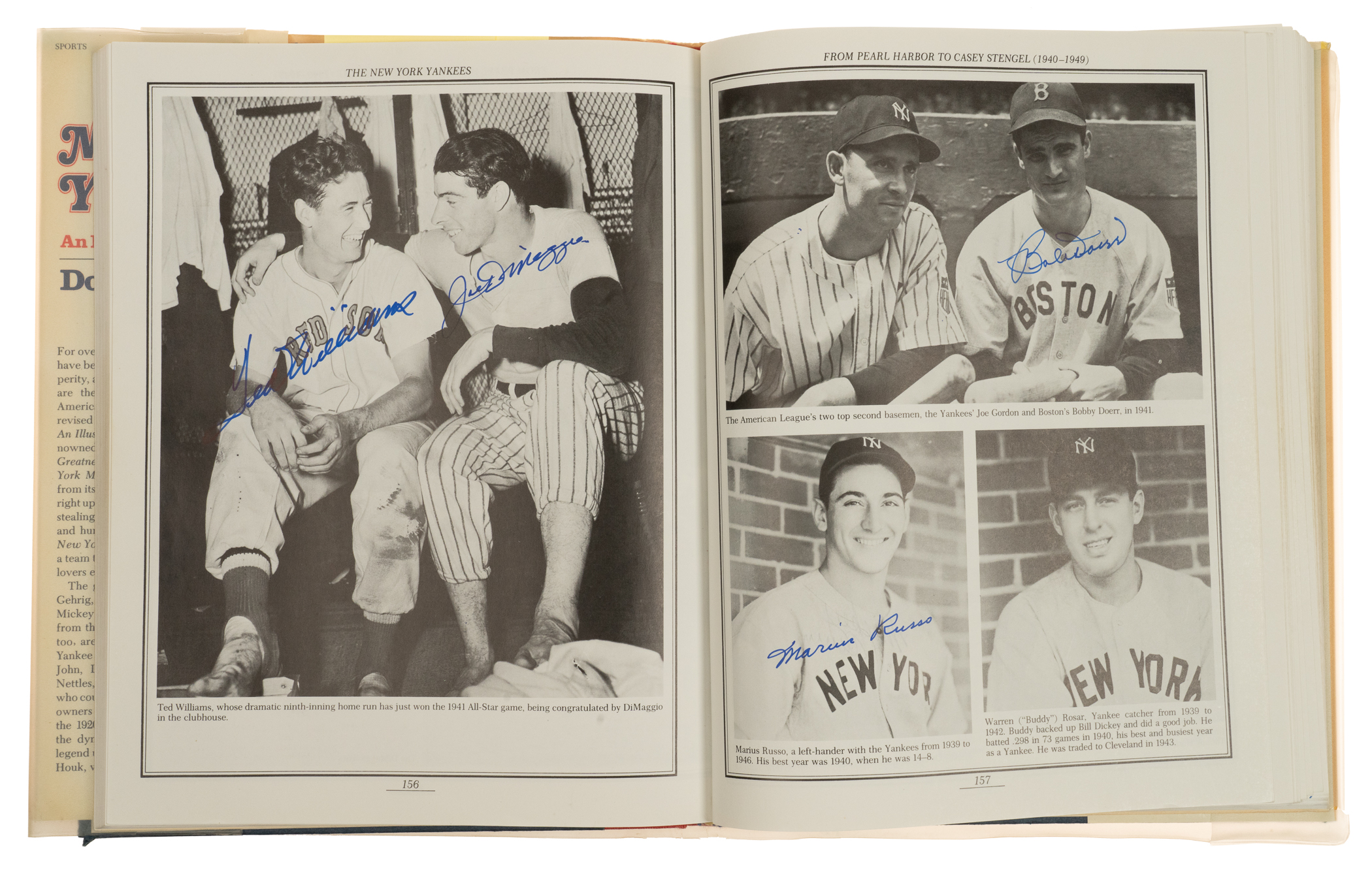 1987 The New York Yankees: An Illustrated History (Revised Edition) by Donald Honig featuring eighty-plus signatures (with some players having signed multiple times) on either the inside cover or interior. Notable signees include Joe DiMaggio (pg. 124), Yogi Berra (pg. 173), Phil Rizzuto (pgs. 161, 196 with personalized inscription, and 213), Mel Allen (pg. 168), Bob Feller (pg. 169 with personalized inscription), Johnny Mize (pgs. 201 and 212), Whitey Ford (pg. 202), Willie Mays (pg. 206), Leo Durocher (pg. 206), Mickey Mantle (pg. 220, with "No. 7" inscription), Tom Seaver (pg. 259), Bob Lemon (pg. 272), Catfish Hunter (pg. 277), and Dave Winfield (pg. 314). Crown Publishers, New York, 1987. The hardbound book (8-5/8 x 11-1/8 inches) displays light to moderate handling wear along with some small tears and spots of staining along the original dust jacket; Very Good to Excellent condition overall. Full LOA from James Spence/JSA.