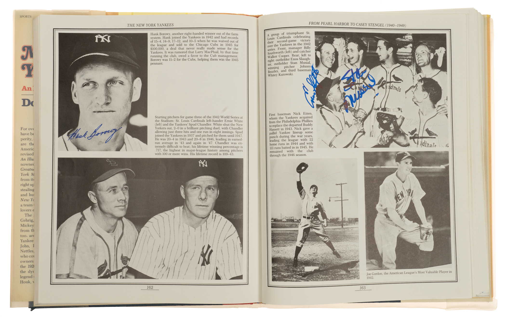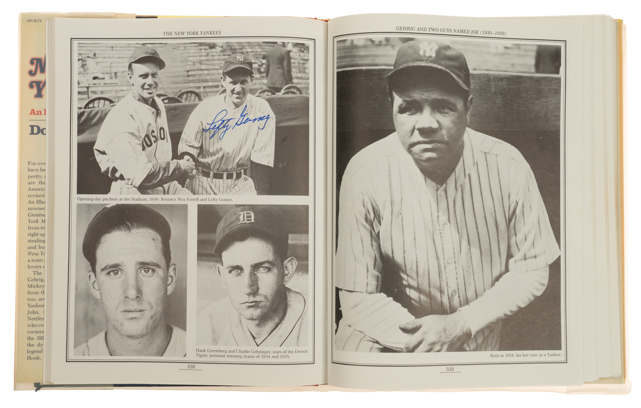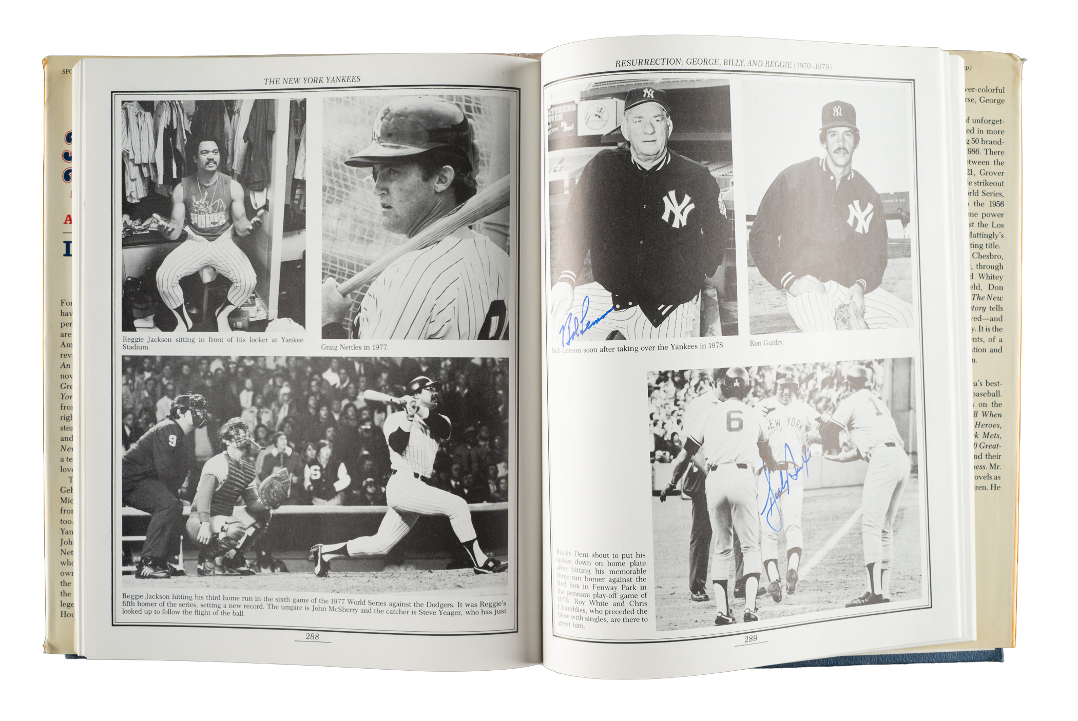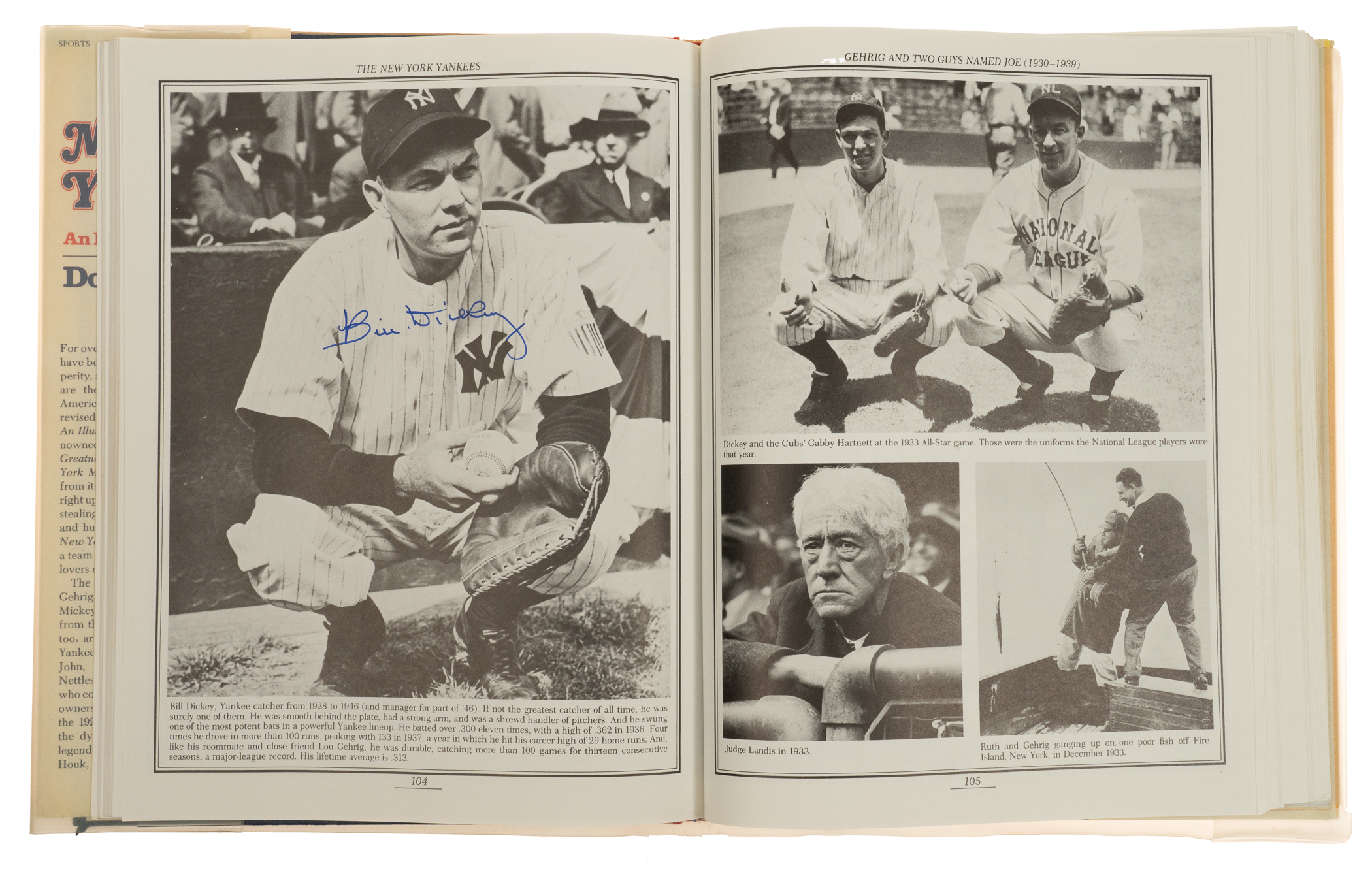 1987 The New York Yankees: An Illustrated History (Revised Edition) by Donald Honig featuring eighty-plus signatures (with some players having signed multiple times) on either the inside cover or interior. Notable signees include Joe DiMaggio (pg. 124), Yogi Berra (pg. 173), Phil Rizzuto (pgs. 161, 196 with personalized inscription, and 213), Mel Allen (pg. 168), Bob Feller (pg. 169 with personalized inscription), Johnny Mize (pgs. 201 and 212), Whitey Ford (pg. 202), Willie Mays (pg. 206), Leo Durocher (pg. 206), Mickey Mantle (pg. 220, with "No. 7" inscription), Tom Seaver (pg. 259), Bob Lemon (pg. 272), Catfish Hunter (pg. 277), and Dave Winfield (pg. 314). Crown Publishers, New York, 1987. The hardbound book (8-5/8 x 11-1/8 inches) displays light to moderate handling wear along with some small tears and spots of staining along the original dust jacket; Very Good to Excellent condition overall. Full LOA from James Spence/JSA.