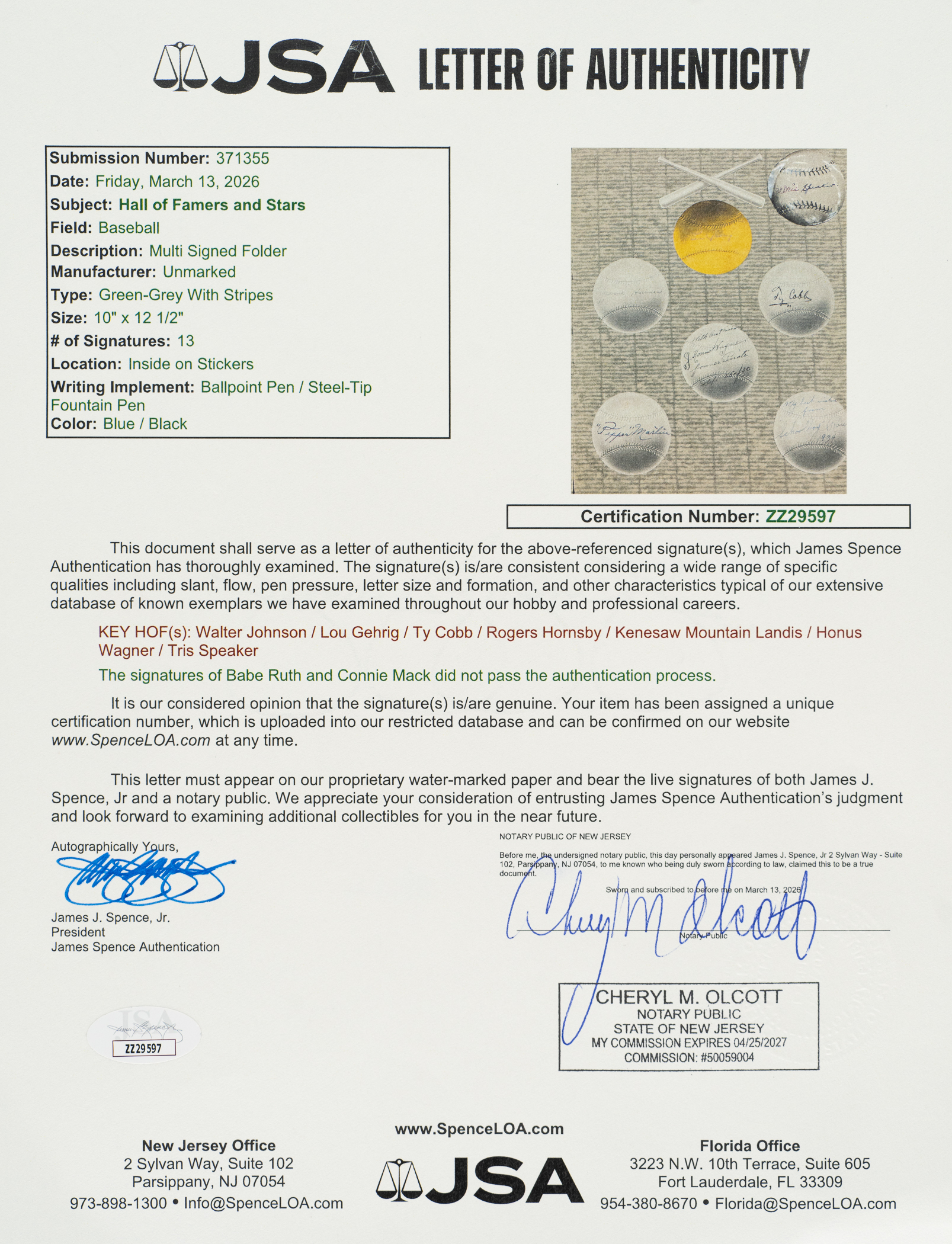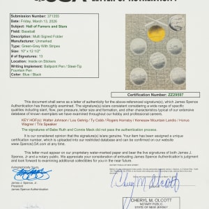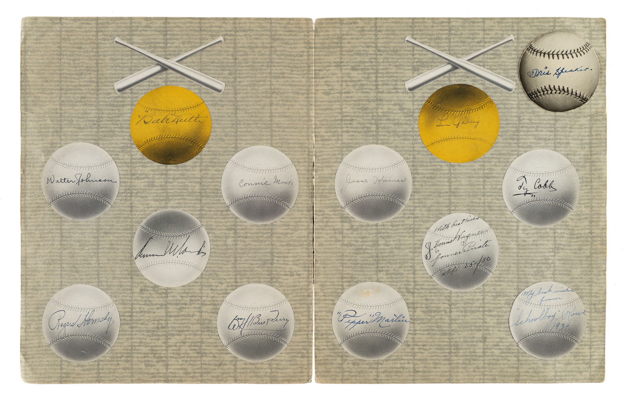 Outstanding fold-over display featuring signatures of nine legendary Hall of Famers and two stars of the era: Walter Johnson, Kenesaw Landis, Rogers Hornsby, Bill Terry, Jesse Haines, Lou Gehrig, Tris Speaker, Honus Wagner, Ty Cobb, Pepper Martin, and Schoolboy Rowe. Each signature is penned on its own baseball cut-out in either blue or black ink. This custom piece was obviously assembled with great care, as each baseball is meticulously affixed to the piece. Based on dated inscriptions provided by Wagner (Sept 25, 1930) and Rowe (1934), we can determine that compiling these signatures was a multi-year project. The display (20 x 12.5 inches), while intact, displays a substantial split along the fold line. Good condition overall. Please note that the signatures of Babe Ruth and Connie Mack have been deemed clubhouse examples by JSA. Full LOA from James Spence/JSA.