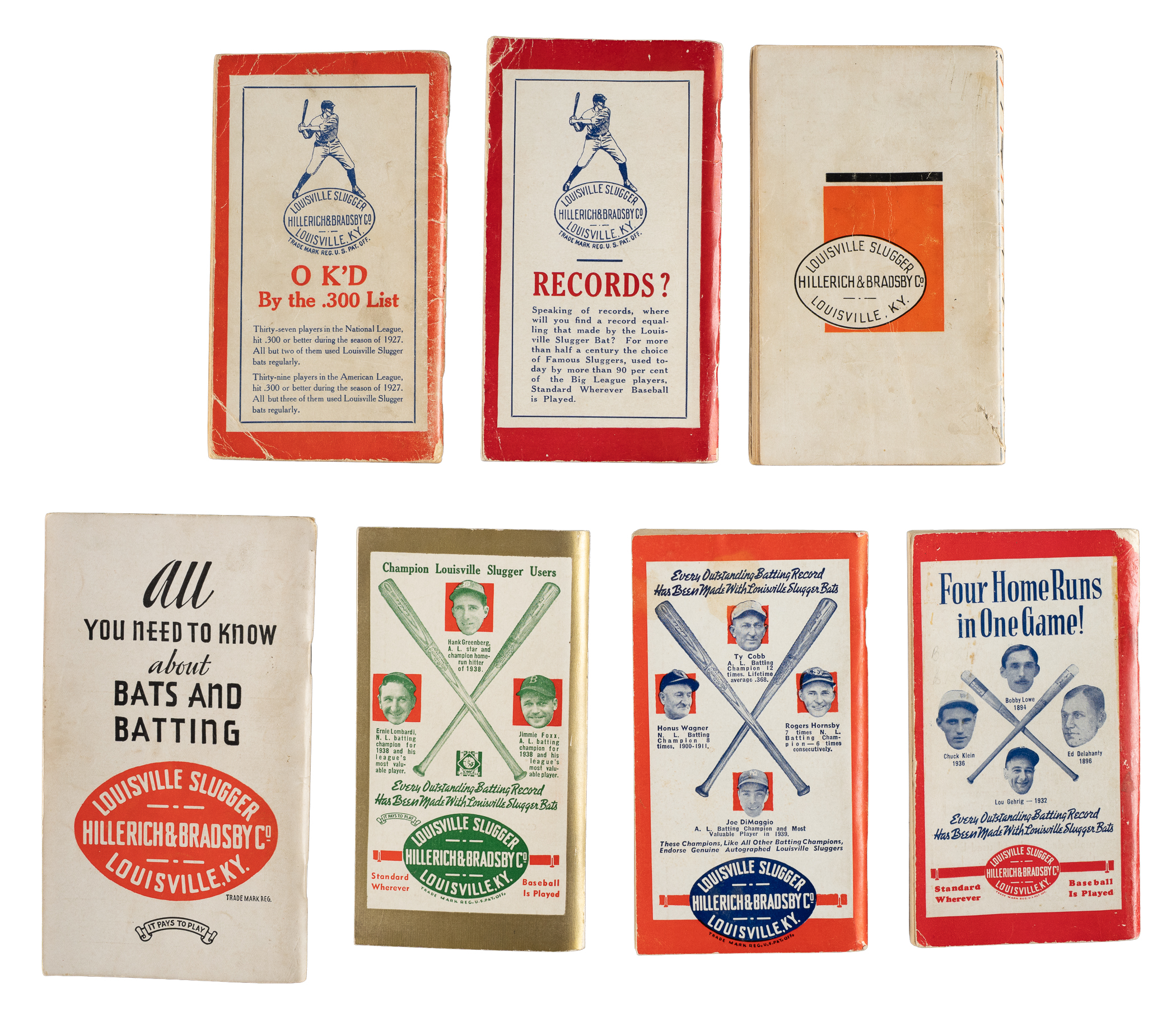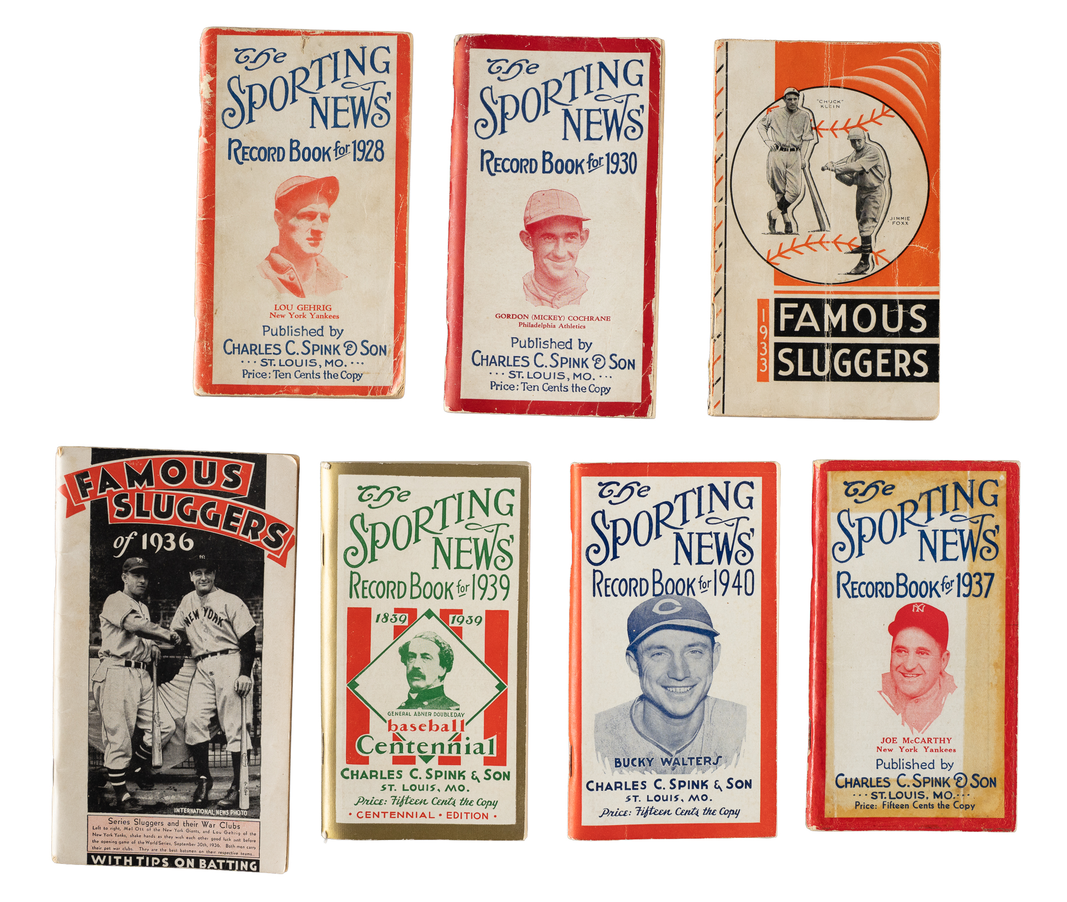 Collection of seven different Sporting News Record books and H&B's Famous Sluggers guides spanning the years 1928 to 1940. These guides are filled with voluminous statistics and information about the previous season. Many consider these annuals to represent the best value in all of vintage baseball collecting. 1) Sporting News Record Book (5): 1928 (Gehrig cover), 1930, 1937, 1939 Abner Doubleday cover), and 1940. 2) H&B's Famous Sluggers (2): 1933 (Foxx and Klein cover) and 1936 (Gehrig and Ott cover). Four guides are in Poor to Fair condition, while the remaining three are Vg to Vg-Ex. Total: 7 guides.