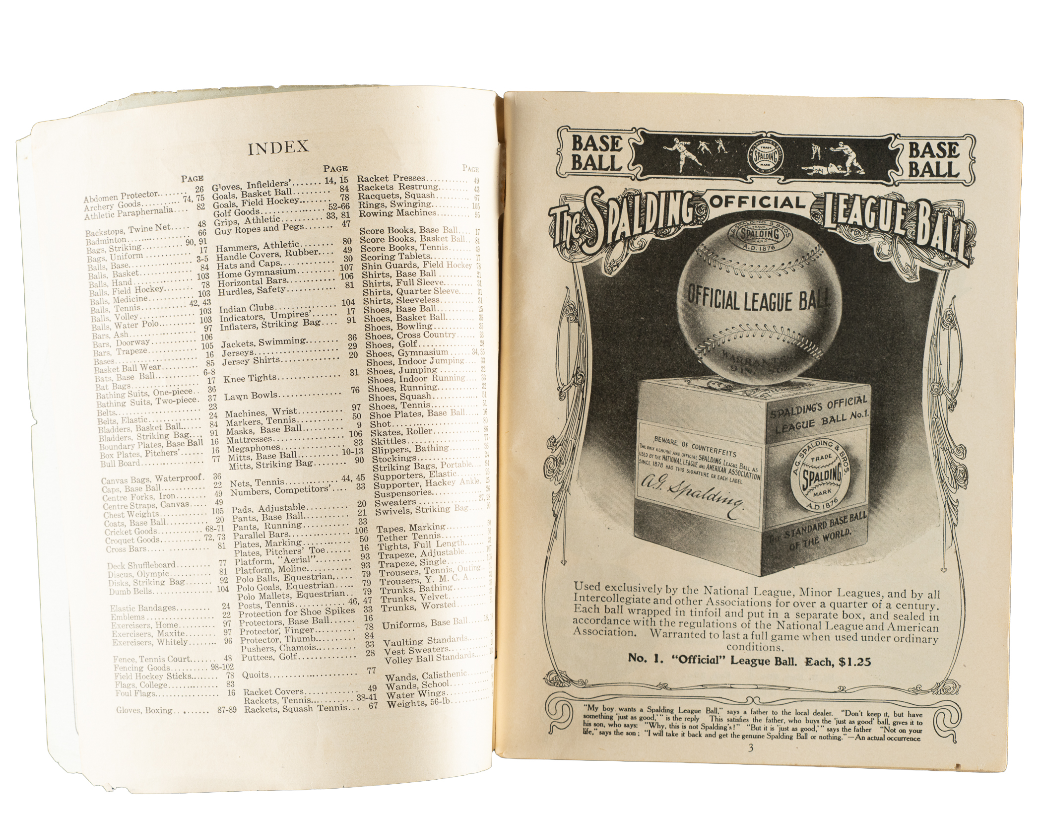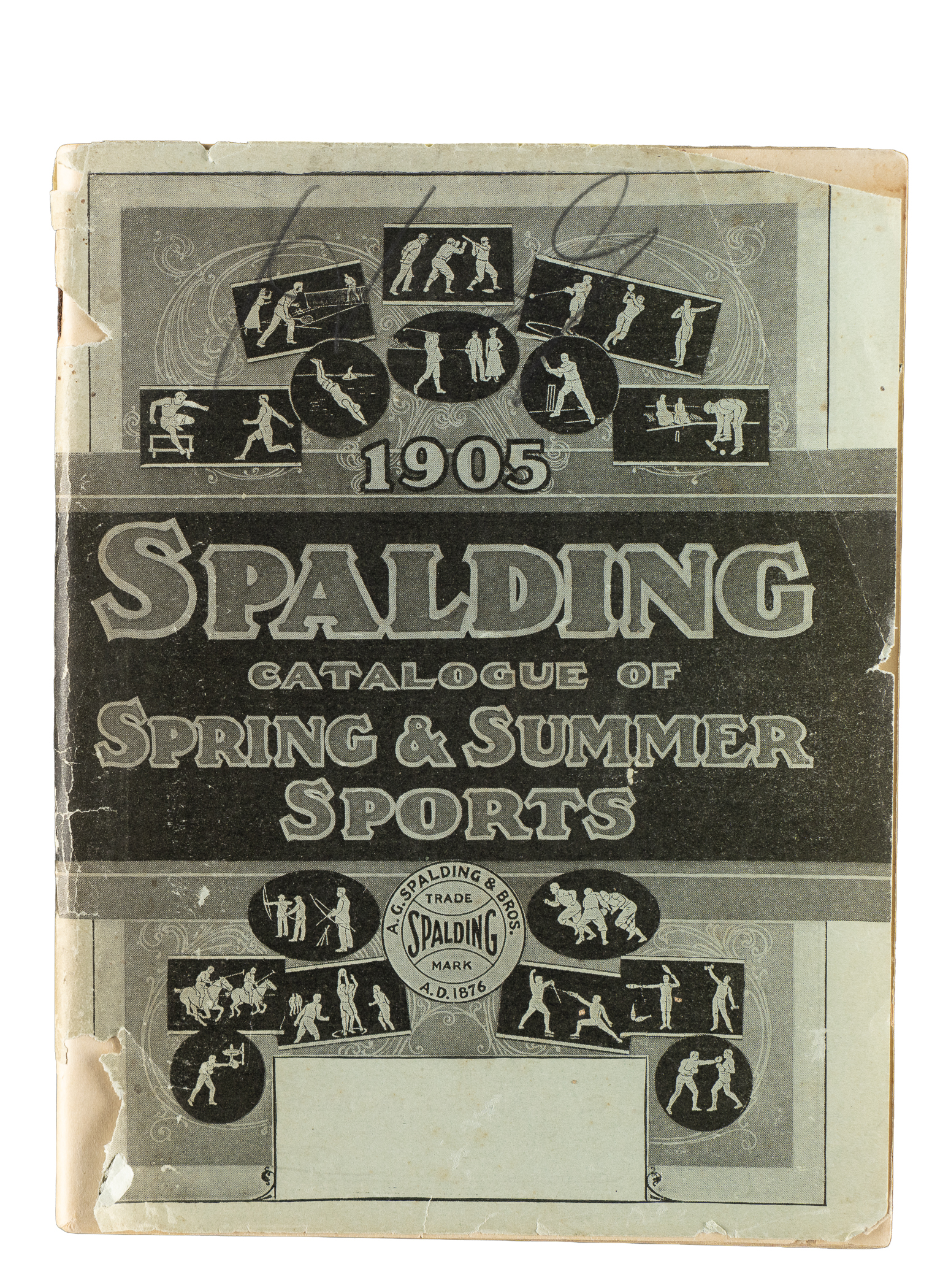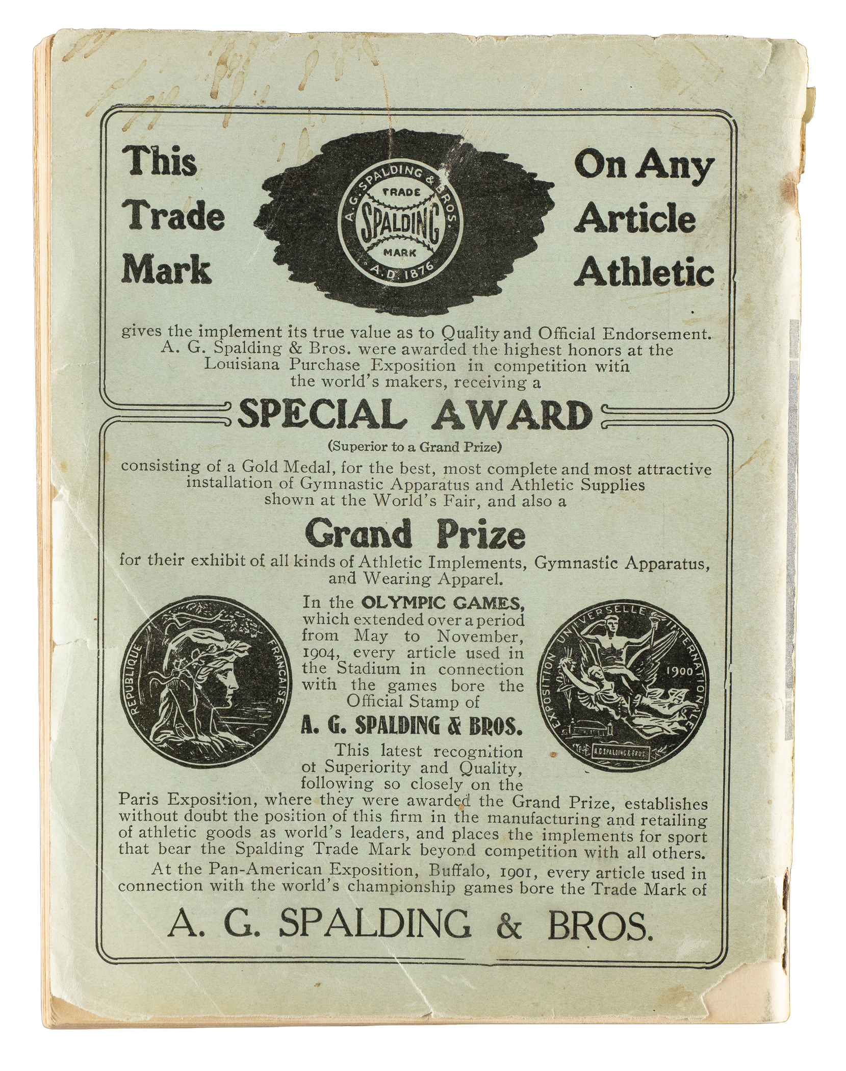 Scarce A. G. Spalding & Bros. retail sporting goods catalog for the spring and summer of 1905. The 122-page catalog features the company's complete line of athletic equipment for the sports of baseball, boxing, tennis, golf, and fencing, as well as weight training equipment, college flags, and various other products. The catalog (5 x 6.5 inches) displays heavy wear, including creasing, tears, and pencil marks along the front cover. In Poor condition overall, but complete as issued and still firmly bound.