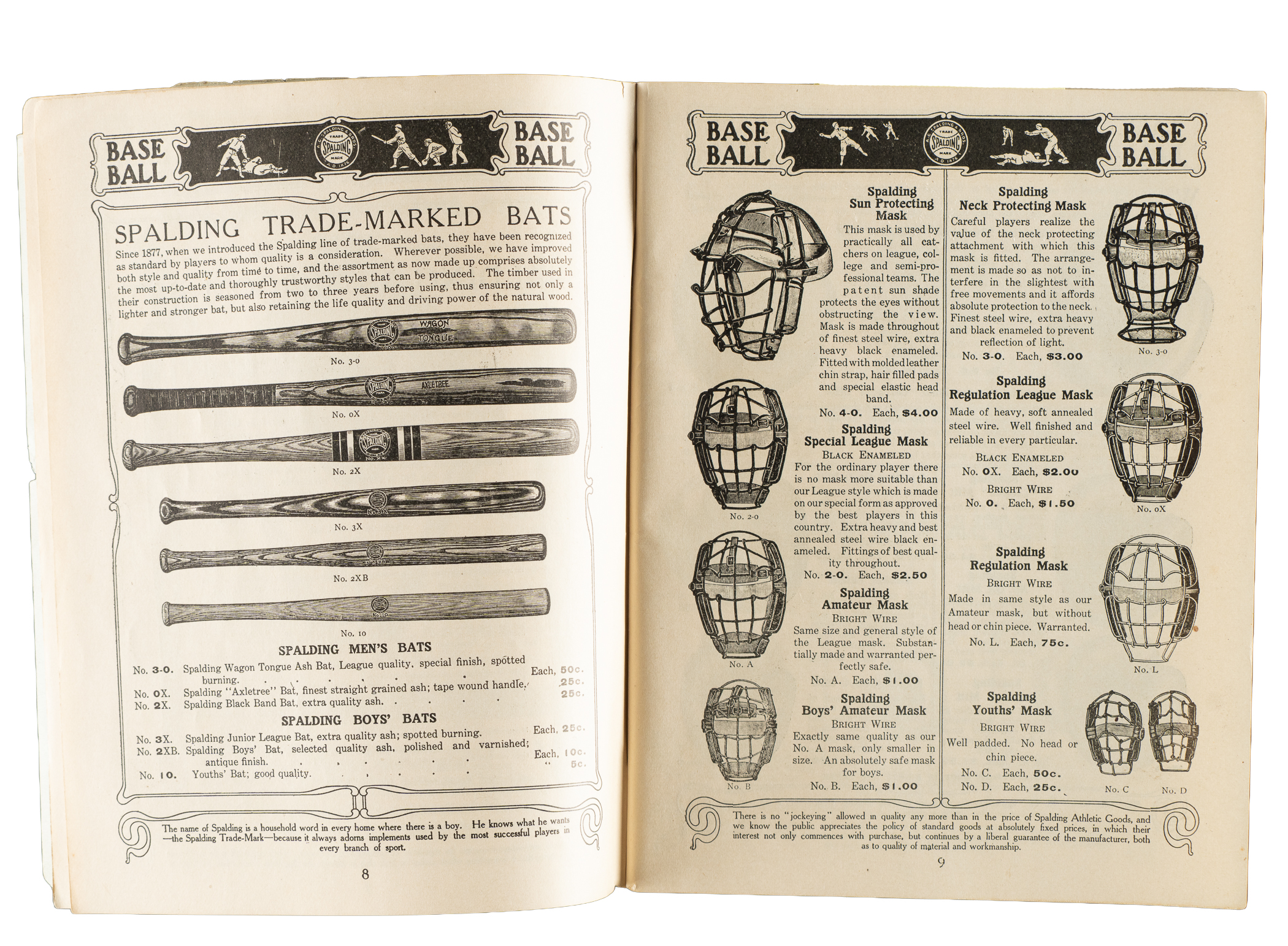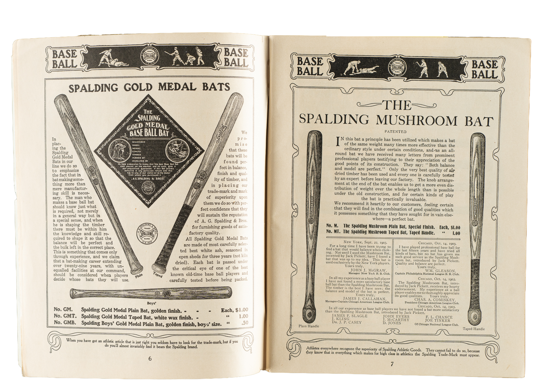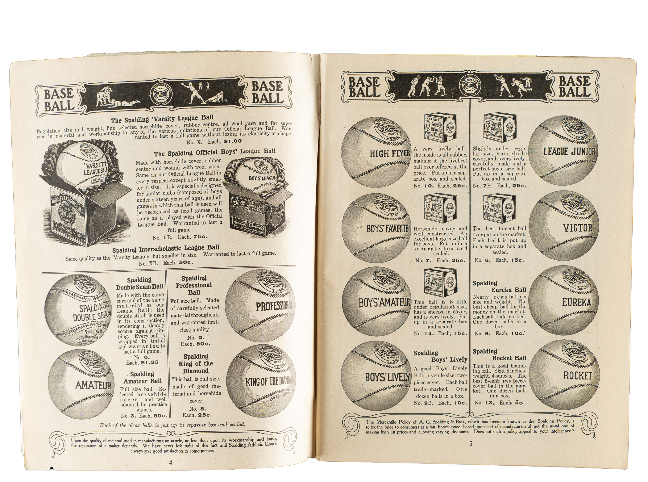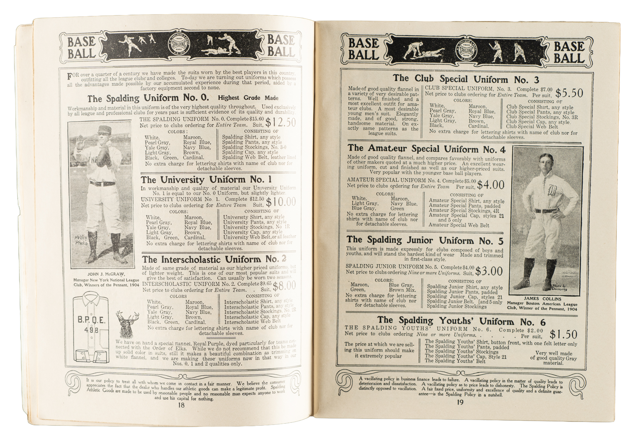 Scarce A. G. Spalding & Bros. retail sporting goods catalog for the spring and summer of 1905. The 122-page catalog features the company's complete line of athletic equipment for the sports of baseball, boxing, tennis, golf, and fencing, as well as weight training equipment, college flags, and various other products. The catalog (5 x 6.5 inches) displays heavy wear, including creasing, tears, and pencil marks along the front cover. In Poor condition overall, but complete as issued and still firmly bound.