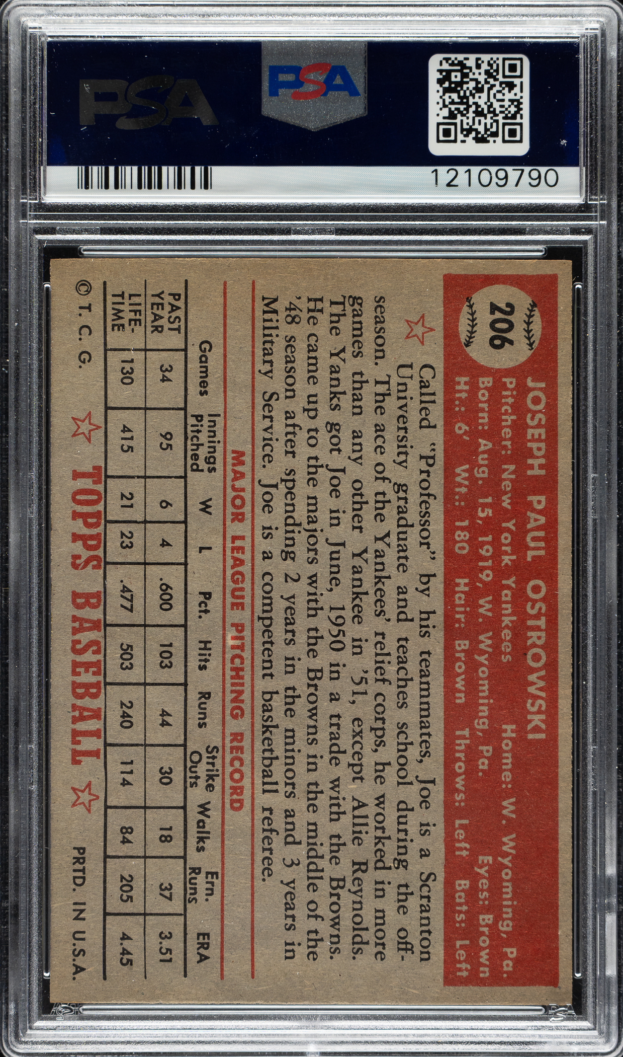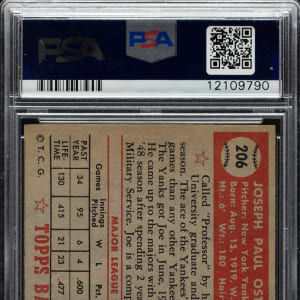 Graded MINT 9 by PSA. One of nine examples graded at this level by PSA with just two higher. Stunning example of #206 Joe Ostrowski (New York Yankees) from the legendary 1952 Topps set. Exceptionally crisp and clean with bright colors, sharp corners, and excellent centering. Clean reverse. This card would make an ideal addition to a world-class 1952 Topps set.