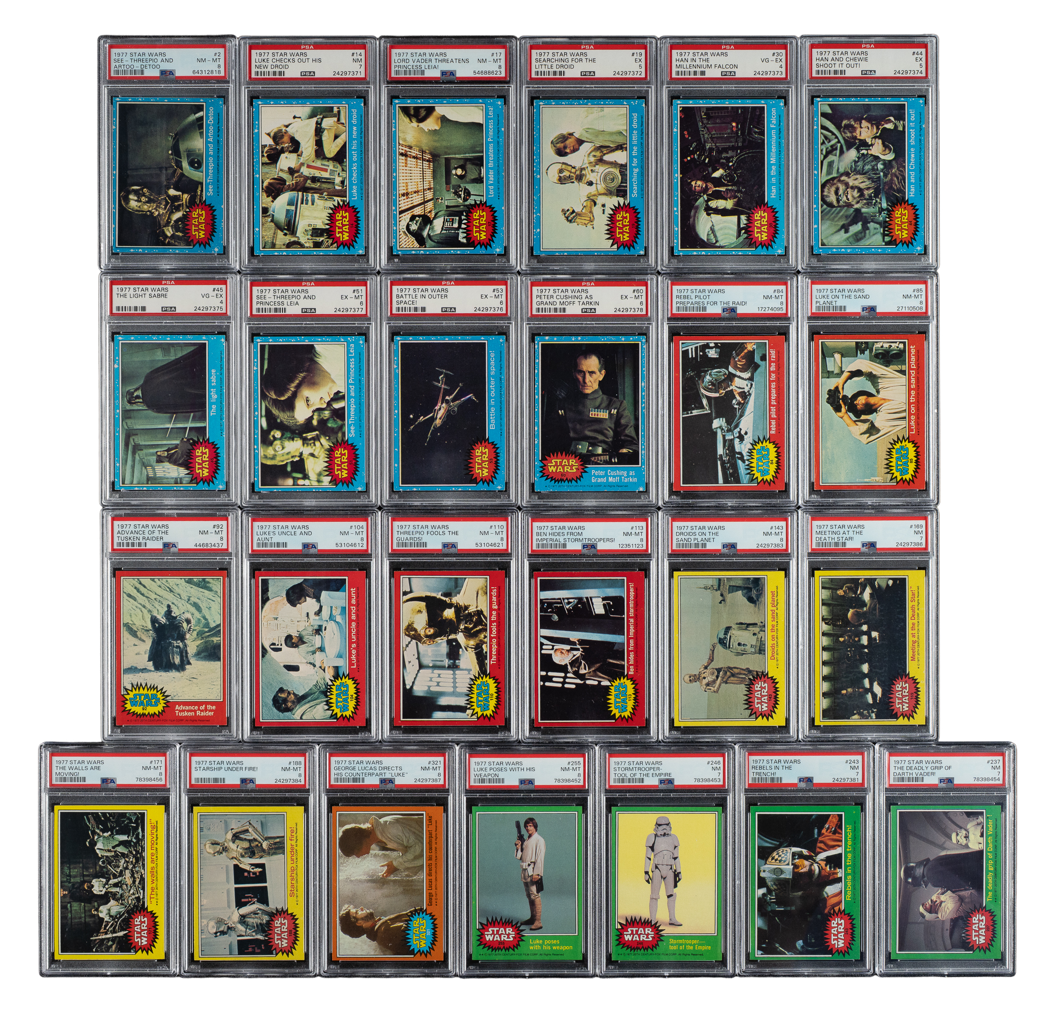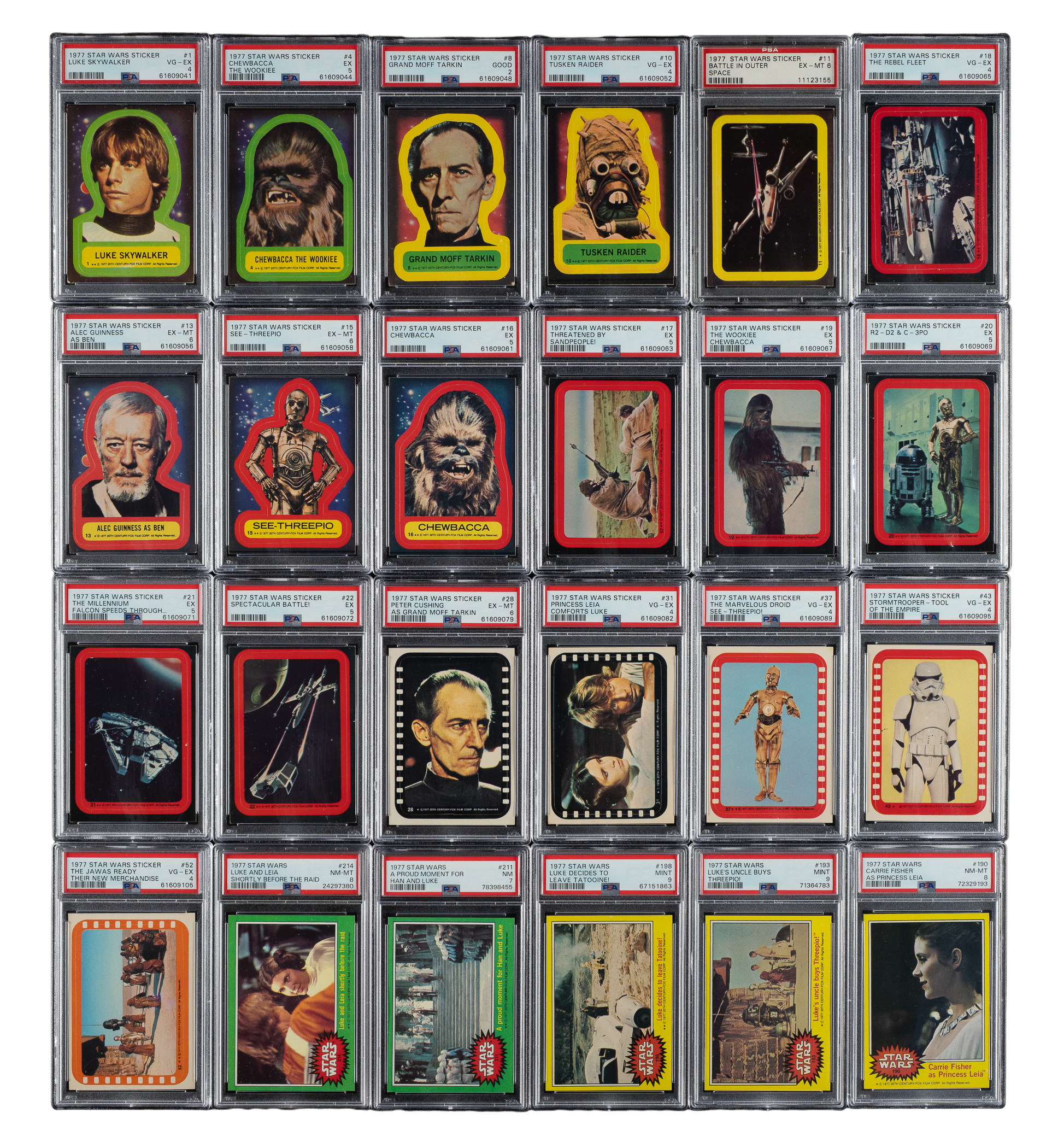 Presented is a very attractive mid- to high-grade complete set of 1977 Topps "Star Wars" (330 cards and 55 stickers). These full-color cards feature scenes from the popular movie on the front, with a description of the scene on the reverse. A total of 33 cards and 19 stickers have been graded and encapsulated by PSA. This collection consists of the following: 1) Complete Base Set (330): PSA Grading Composite: MINT 9 (2 cards): #193 and 198. NM-MT 8 (18 cards): #2, 17, 84, 85, 92, 104, 110, 113, 137, 143, 171, 188, 190, 207, 214, 255, 260, and 321. NM 7 (6 cards): #14, 169, 211, 237, 243, and 246. EX-MT 6 (3 cards): #51, 53, and 60. EX 5 (2 cards): #19 and 44. VG-EX 4 (2 cards): #30 and 45. The condition of the 56 unencapsulated Series 1 cards is 66% Vg-Ex to Ex (including a few better) and 34% Gd to Vg (including one lesser). The condition of the 241-card balance of Series 2-5 cards is 20% Nr/Mt or better, 55% Ex to Ex-Mt, and 25% Vg to Vg-Ex (including a couple lesser, a couple with color added, and one that measures small). Unencapsulated Key: #1 Luke Skywalker (Pr due to pinholes). 2) Complete Sticker Set (55): PSA Grading Composite: EX-MT 6 (4 cards): #11, 13, 15, and 28. EX 5 (7 cards): #4, 16, 17, 19, 20, 21, and 22. VG-EX 4 (7 cards): #1 Luke Skywalker, 10, 18, 31, 37, 43, and 52. GOOD 2 (1 card): #8. The condition of the 36 unencapsulated stickers ranges from Vg-Ex to Nr/Mt (averaging Ex/Ex-Mt). Star Wars is one of the few movies of the 1970s to survive with its popularity intact, and if anything, it enjoys even greater popularity today. This is a very attractive mid- to high-grade complete set of this popular issue. Total: 385 cards. The size/weight of this item requires that there will be an additional shipping charge for this lot.