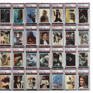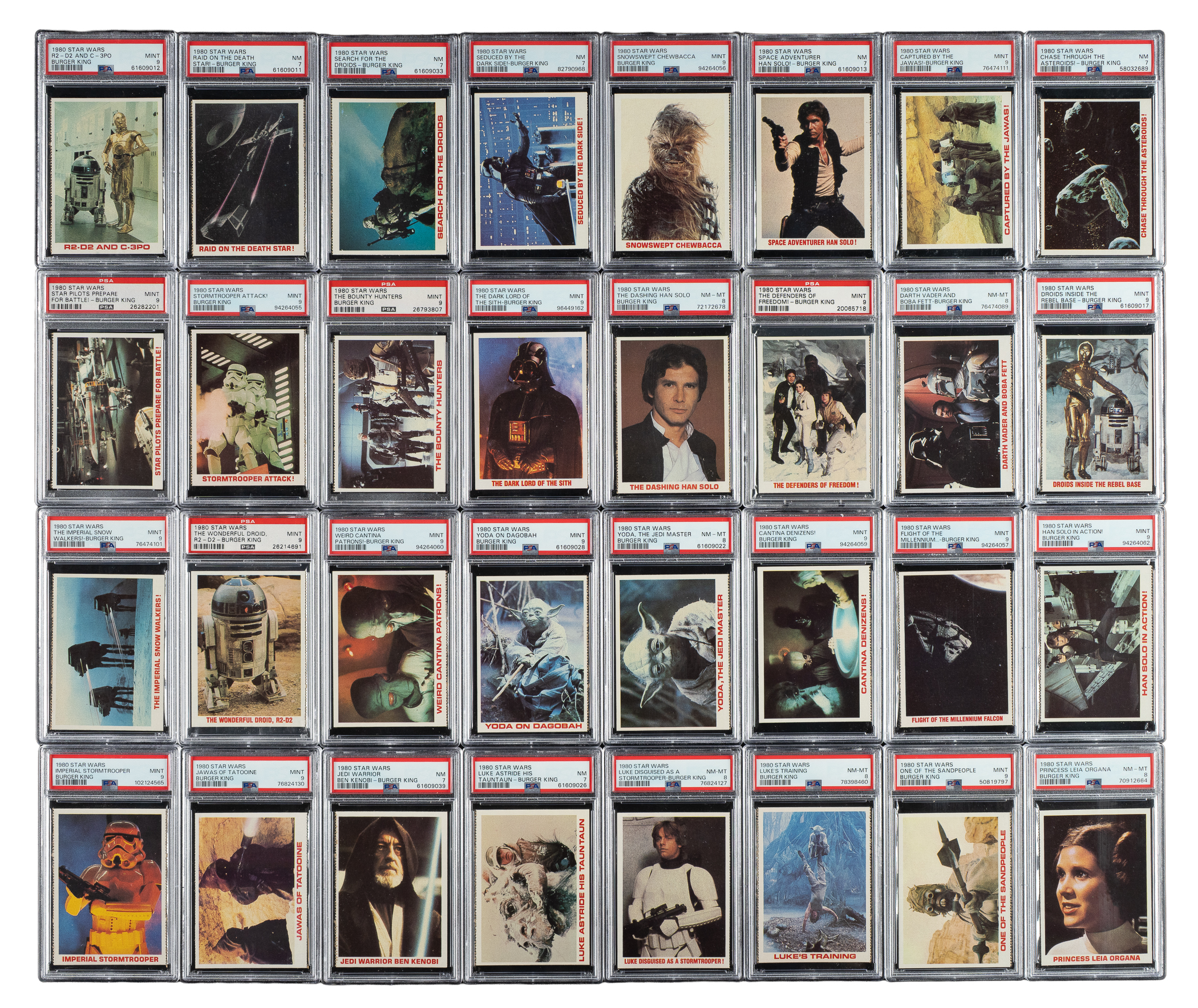 Offered is a 36-card complete set of 1980 Burger King "Star Wars" trading cards, each professionally graded and encapsulated by PSA (including twenty-three PSA MINT 9s). This series was originally issued in twelve 3-card panels, designed to be separated along the perforations. PSA Grading Composite: NM-MT 8 (6 cards): Darth Vader and Boba Fett, Luke Disguised as a Stormtrooper!, Luke's Training, Princess Leia Organa, The Dashing Han Solo, and Yoda, The Jedi Master. NM 7 (7 cards): Chase Through the Asteroids!, Jedi Warrior Ben Kenobi, Luke Astride his Tantaun, Raid on the Death Star!, Search for the Droids, Seduced by the Dark Side!, and Space Adventurer Han Solo!. The unlisted twenty-three cards have all been graded MINT 9. Star Wars is one of the few movies of the 1970s to survive with its popularity intact, and, if anything, it enjoys even greater popularity today. This is an extremely crisp, clean, and high-grade complete set. Total: 36 cards. The size/weight of this item requires that there will be an additional shipping charge for this lot.