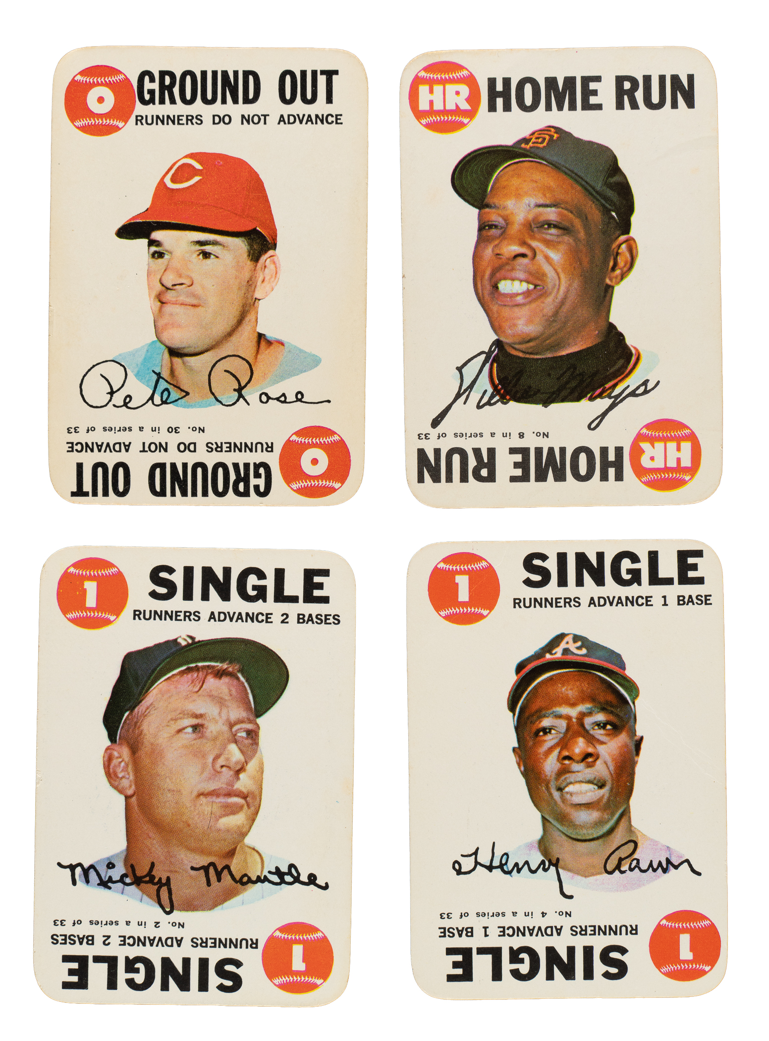 Presented is an attractive mixed-collection of 1968 Topps Game cards consisting of a complete 33-card set plus 130 duplicates. The collection is highlighted by dozens of Hall of Famers (most with multiple examples), including Mickey Mantle, Hank Aaron, and Willie Mays. Includes the following 130 duplicates: Three #1, three 2 Mantle, three 3 Yastrzemski, two 4 Aaron, eight 5 Killebrew, three 7 F. Robinson, four 8 Mays, two 9 B. Robinson, two 10, 11, two 12, three 13, six 14, six 15, five 16, six 17, eight 18, four 19 Santo, five 20, five 21, six 22, four 23 Allen, three 24, five 25, four 26, four 27 Kaline, five 28, five 29 Carew, two 30 Rose, two 31 Torre, three 32 Cepeda, and seven 33. Condition is 11% Ex to Ex-Mt, 50% Vg to Vg-Ex, and 39% lesser. Keys: Four #2 Mantle (Ex, Vg-Ex, Vg, and Pr), four 3 Yastrzemski (Vg-Ex and three Vg), three 4 Aaron (Nr/Mt+, Gd-Vg, and Gd), eight 5 Killebrew (two Vg-Ex, five Vg, and Fr), 6 Clemente (Ex due to centering), four 7 F. Robinson (three Gd and Pr), five 8 Mays (two Vg, Gd, Fr-Gd, and Pr-Fr), three 9 B. Robinson (two Vg and Gd), five 27 Kaline (three Vg and two Gd), six 29 Carew (Ex-Mt, Vg+, Gd+, two Fr, and Pr), two 30 Rose (Vg+ and Fr), 30 Rose/blank back (pencil on reverse, otherwise Gd), and 31 Torre/blank back (Gd+). Total: 163 cards (set of 33 plus 130 duplicates). The size/weight of this item requires that there will be an additional shipping charge for this lot.