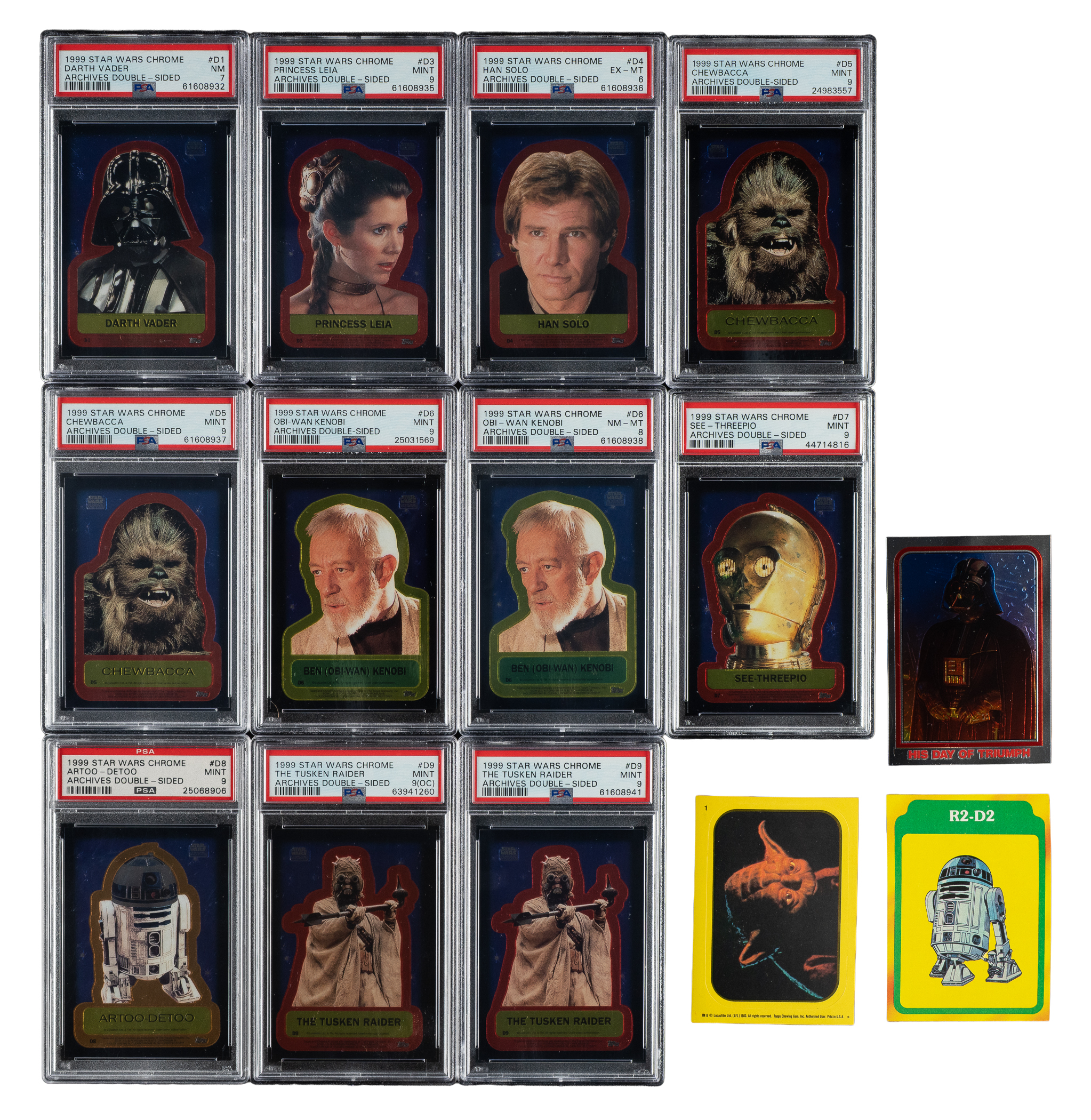 Presented is a very substantial complete and partial set collection of 1980 to 1999 Topps "Star Wars" trading cards. This collection consists of the following: 1) 1980 Topps Empire Strikes Back 3rd Series Complete Set (88): Consists of cards #265-352. Condition is 90% ranging from Ex to Nr/Mt-Mt (averaging Ex-Mt+) and 10% lesser (mostly to Vg-Ex). 2) 1983 Topps Return of the Jedi Stickers Partial Set (33/55): Missing #34-55 for completion. Condition ranges from Ex to Nr/Mt-Mt (averaging Ex-Mt+), with a couple slightly lesser 3-5) Three 1999 Topps Chrome Archives Star Wars Complete Sets (3 sets, 90 cards per set): Condition is 90% ranging from Nr/Mt to Mint and 10% slightly lesser (mostly due to centering). 6) 1999 Topps Chrome Archives Star Wars Double-Sided Chromium Complete Set (9) Plus Four Duplicates: All thirteen cards have been professionally graded and encapsulated by PSA. Includes four duplicates (#D1, D5, D6, and D9). PSA Grading Composite: MINT 9 (8 cards): #D3, two D5, D6, D7, D8, two D9 (one OC). NM-MT 8 (3 cards): #D1, D2, and D6. NM 7 (1 card): #D1. EX-MT 6 (1 card): #D4. Total: 404 cards. The size/weight of this item requires that there will be an additional shipping charge for this lot.