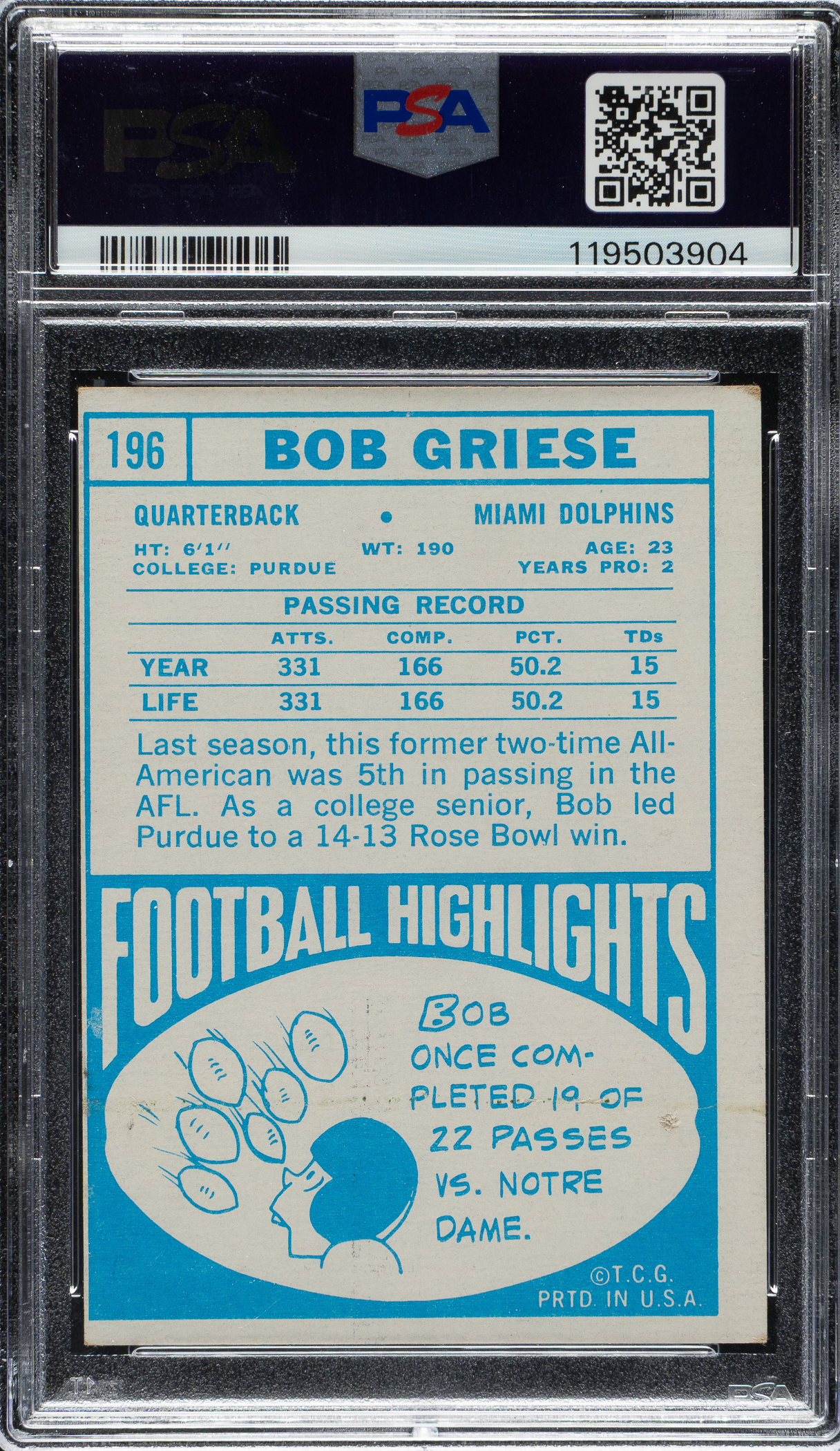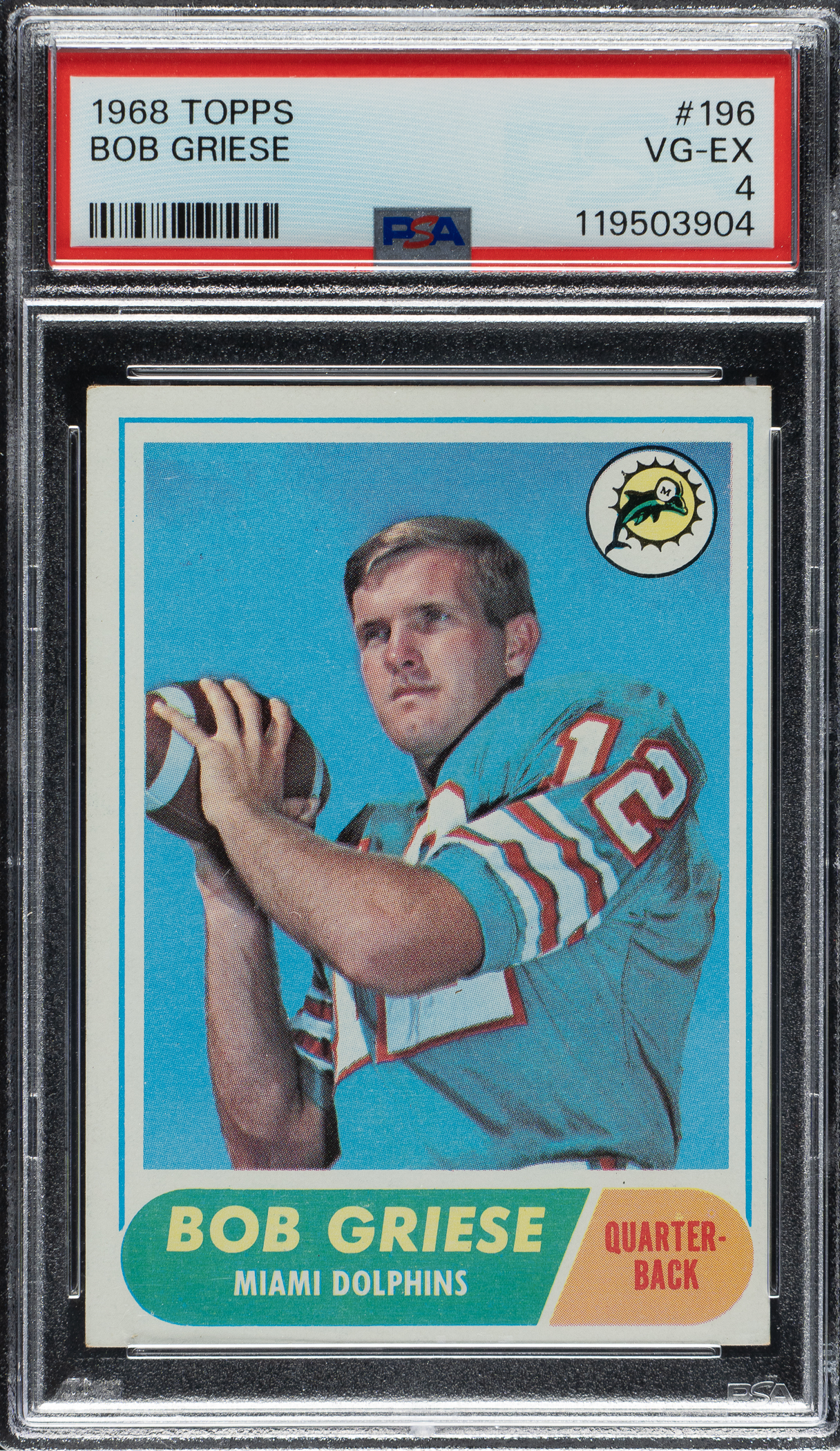 Graded VG-EX 4 by PSA. Miami Dolphins football Hall of Famer Bob Griese.