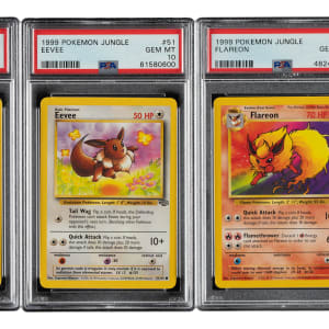 Collection of thirteen 1999 Pokemon Jungle cards, each graded and encapsulated GEM MINT 10 by PSA. Released in 1999, Jungle is the second main expansion of cards of the Pokémon trading card game. Featuring Generation I Pokémon, Jungle includes 64 unique cards. The English version is notably bigger than the Japanese Jungle set, which includes 48 cards. This collection consists of the following: #19 Flareon, #22 Mr. Mime, #38 Lickitung, #40 Nidorina, #41 Parasect, #48 Weepinbell, #49 Bellsprout, #51 Eevee, #52 Exeggcute, #53 Goldeen, #59 Paras, #60 Pikachu, and #61 Rhyhorn. Total 13 cards.