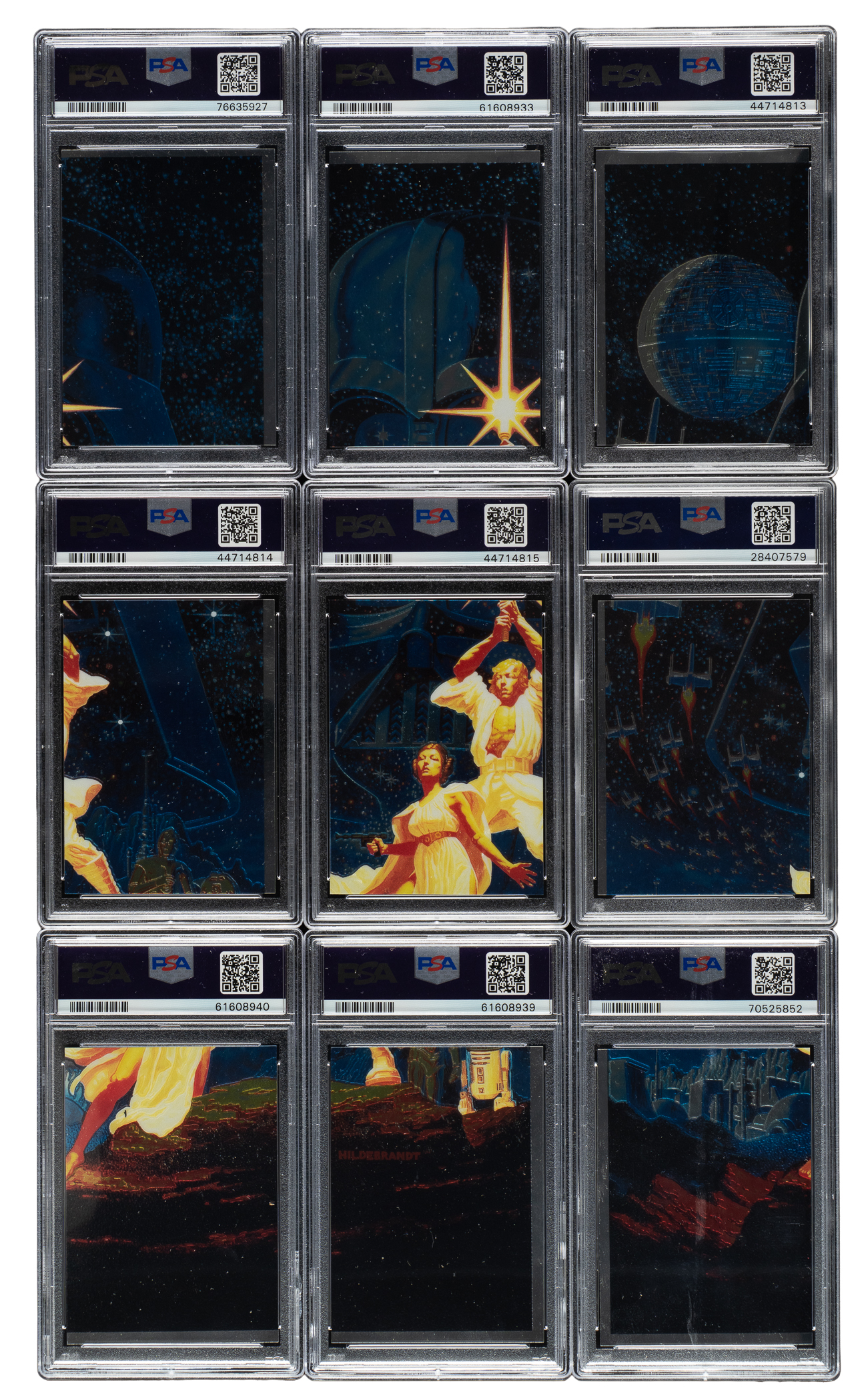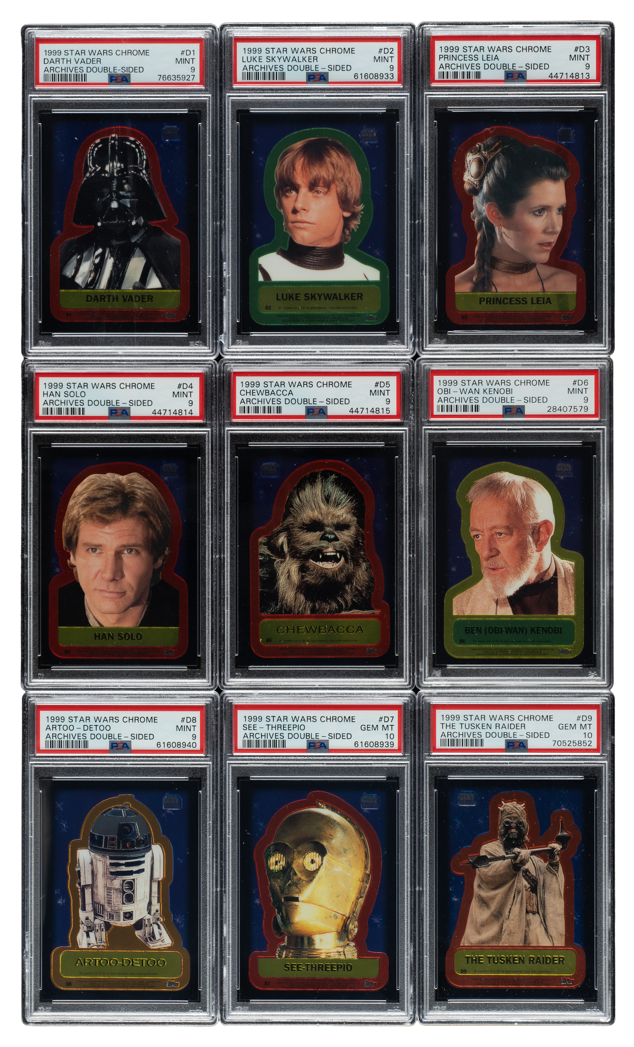 Complete set of 1999 Topps Star Wars Chrome Archives Double-Sided cards, each graded and encapsulated by PSA. PSA Grading Composite: GEM MINT 10 (2 cards): #D7 and D9. MINT 9 (7 cards): #D1, D2, D3, D4, D5, D6, and D8. Total: 9 cards.