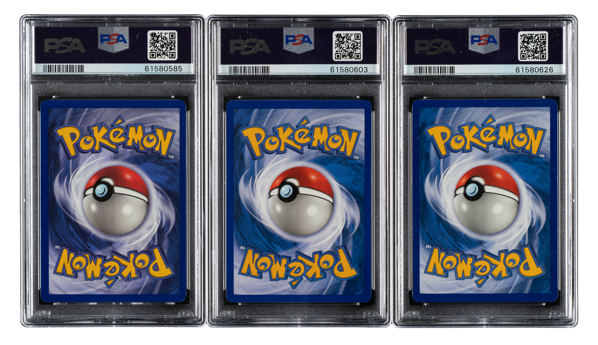Trio of 1999 Pokemon Jungle cards, each graded and encapsulated by PSA as MINT 9. This collection consists of the following cards: #44 Rapidash, #51 Eevee, and #60 Pikachu.