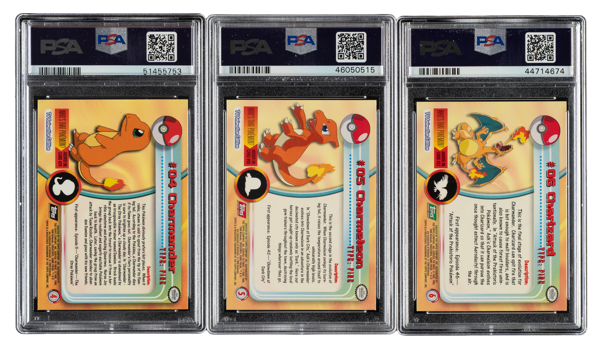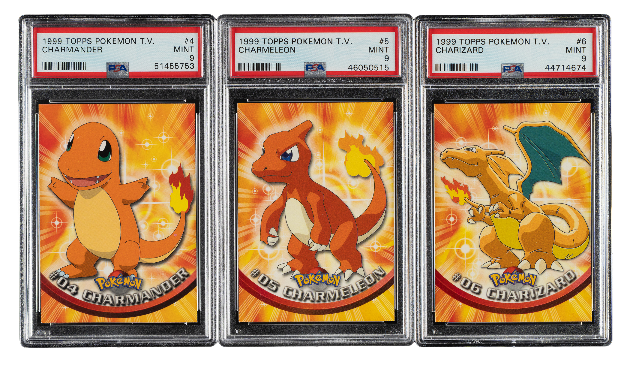 Trio of 1999 Pokemon Topps T.V. Series 1 cards, each graded and encapsulated MINT 9 by PSA. This collection consists of the following: #4 Charmander, #5 Charmeleon, and #6 Charizard. Total 3 cards.