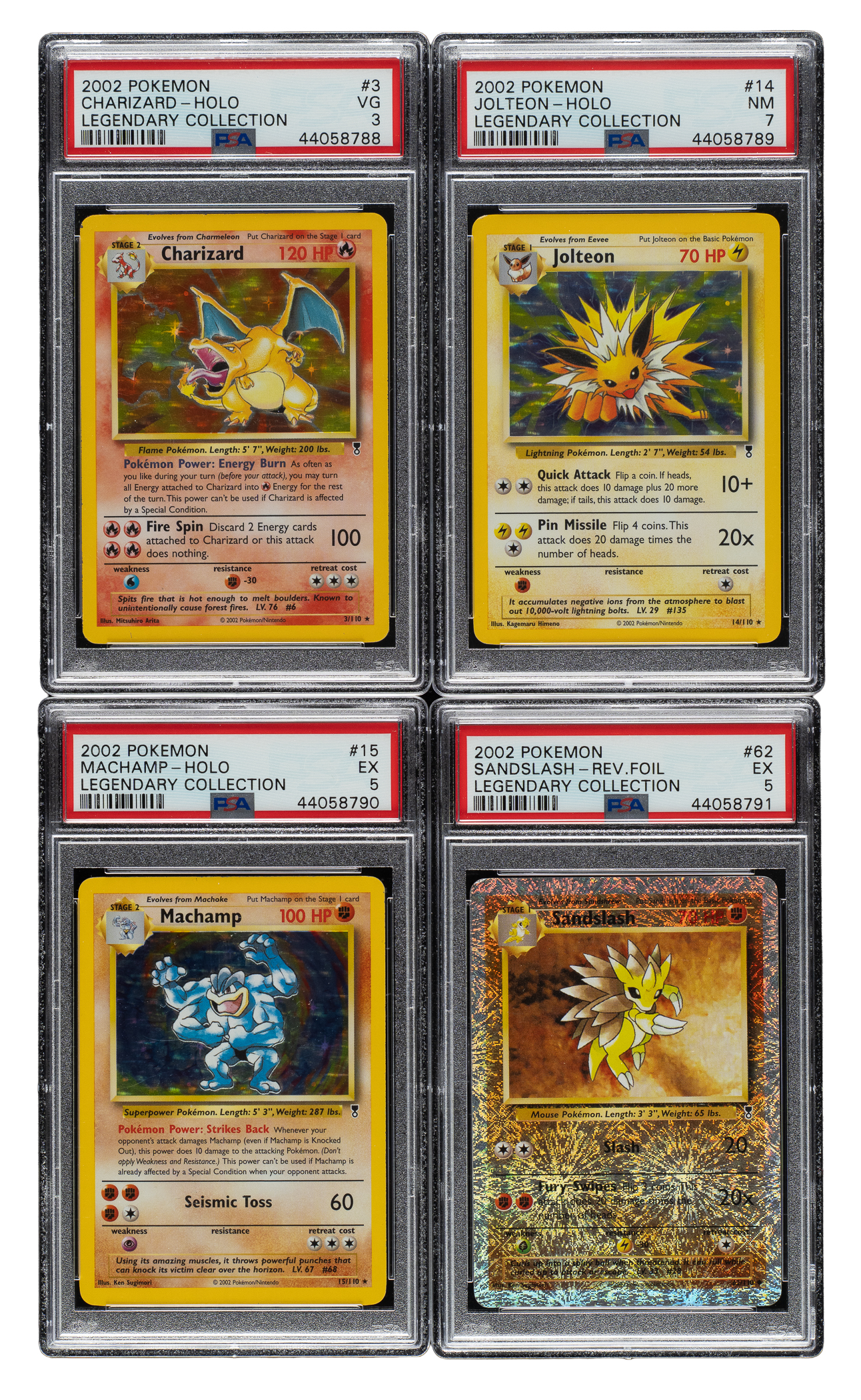 Collection of four 2002 Pokemon Legendary Collection cards which have all been professionally graded and encapsulated by PSA. This collection consists of the following: #3 Charizard Holographic (VG 3), #14 Jolteon Holographic (NM 7), #15 Machamp Holographic (EX 5), and #62 Sandslash Reverse Foil (EX 5). Total 4 cards.