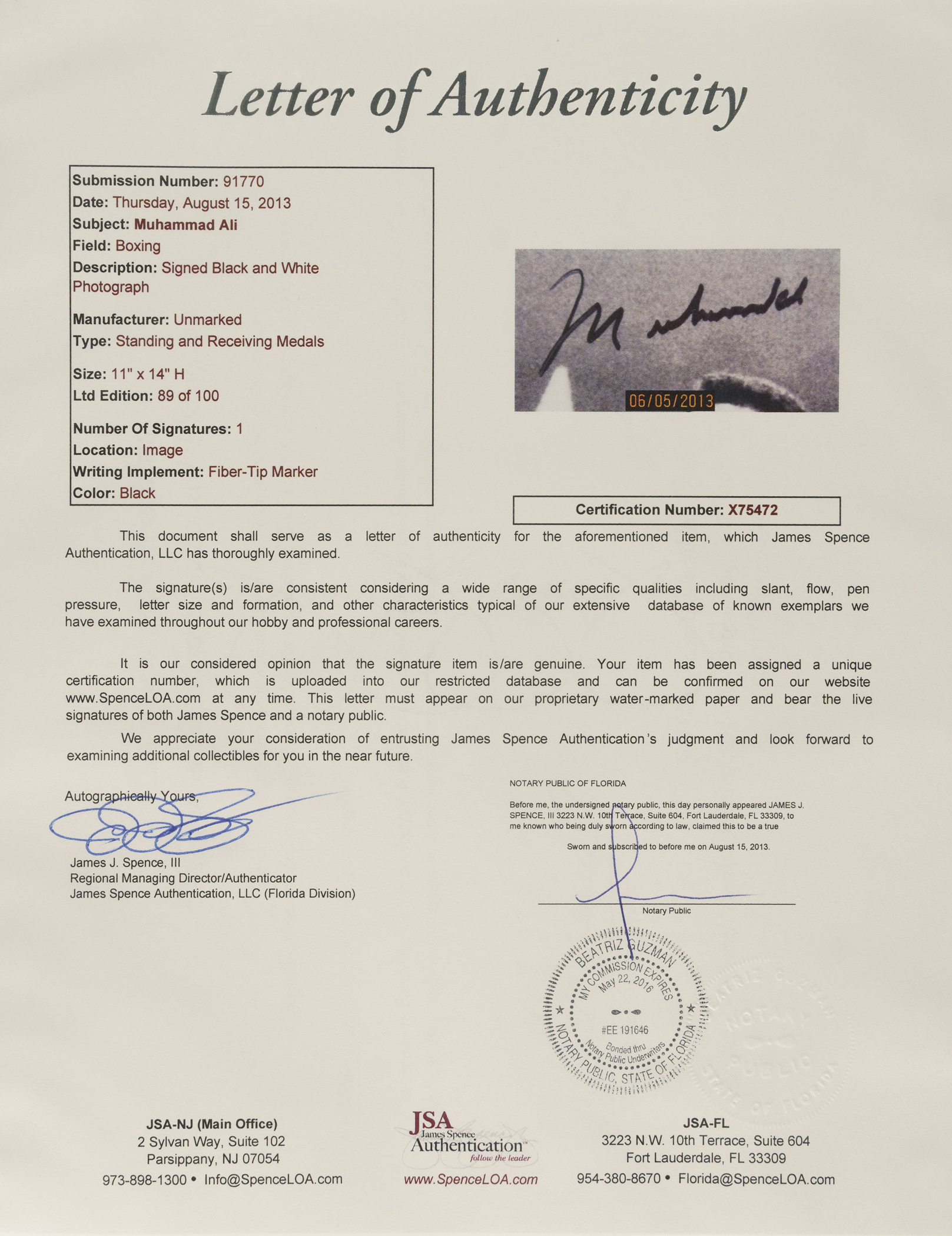 Boxing Hall of Famer Muhammad Ali signed photograph. Total dimensions: 11 x 14 Inches. This limited edition photograph is numbered 89 out of 100. Full LOA from James Spence/JSA.