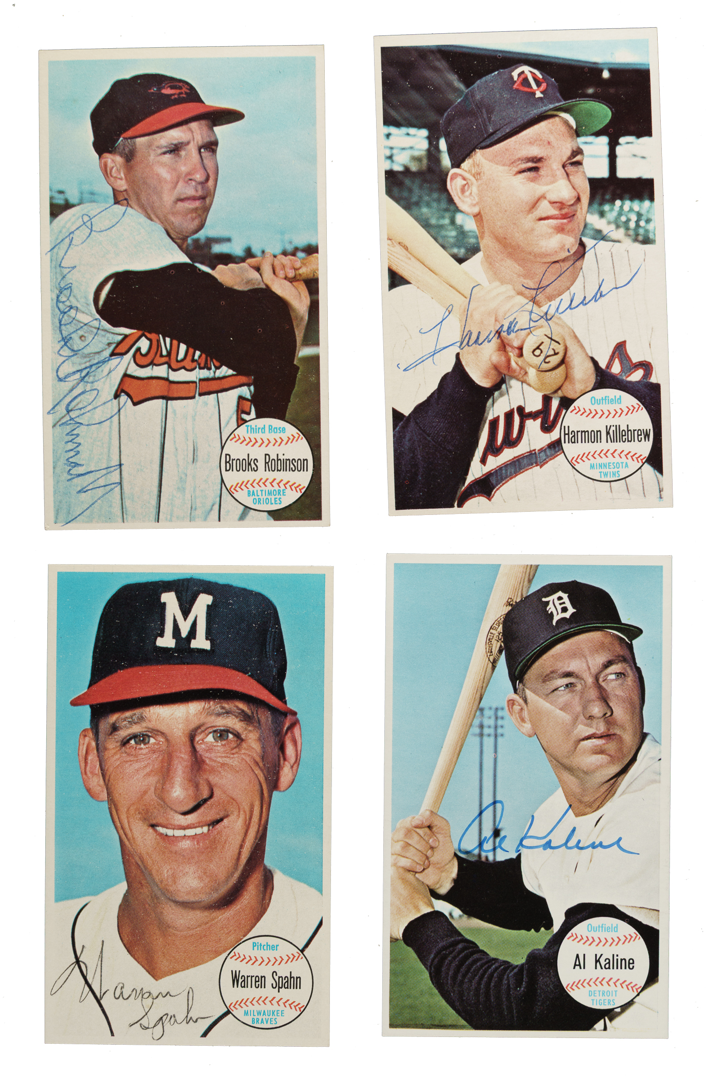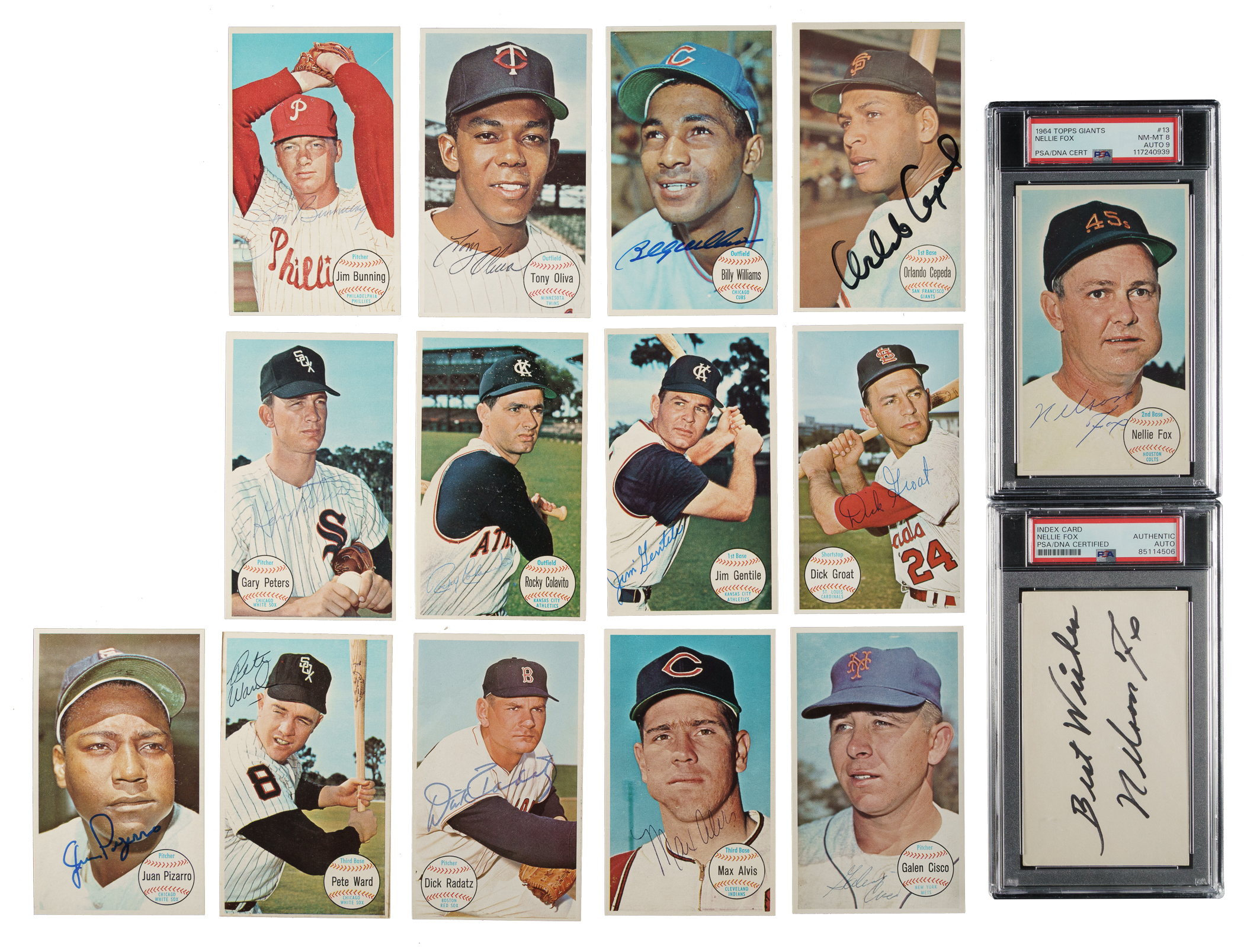 Collection of eighteen signed 1964 Topps Giants cards. One card has been graded and encapsulated by PSA. Condition ranges from Vg-Ex to Ex-Mt, including a couple higher and lesser. This collection consists of the following: #1, 9, 10 Bunning (Ex), 12 Kaline (Vg-Ex), 13 Fox (NM-MT 8 with MINT 9 Signature), 15, 19, 31 Spahn (Ex), 33, 38 Killebrew (Ex), 40, 44 Oliva (Vg-Ex), 46, 47, 50 B. Robinson (Vg-Ex), 52 B. Williams (Gd+), 53, and 55 Cepeda (Ex-Mt+). Also included is a Nellie Fox signed index card, graded and encapsulated as Authentic by PSA/DNA. Total: 19 cards. Auction LOA from James Spence/JSA. The size/weight of this item requires that there will be an additional shipping charge for this lot.