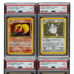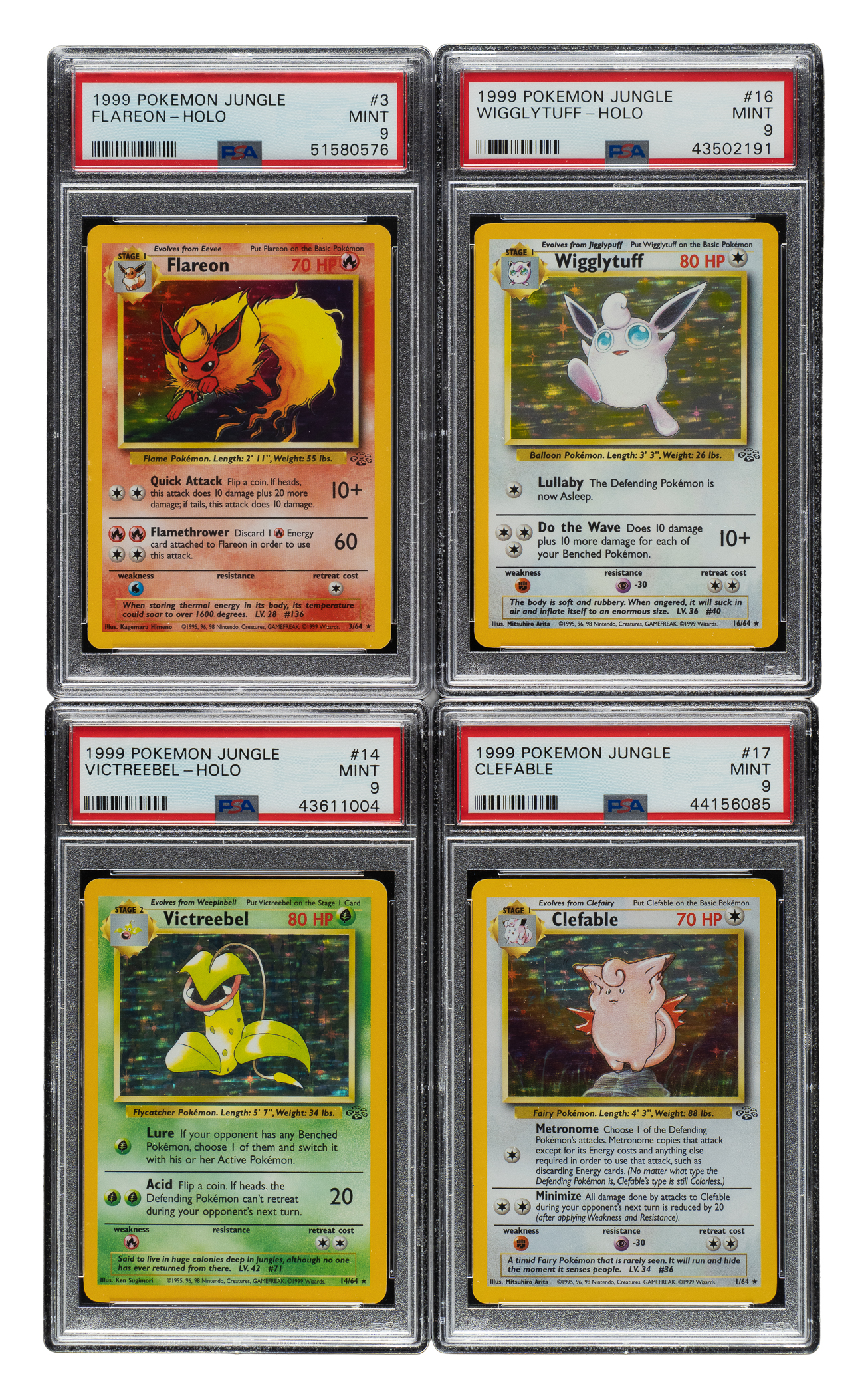 Collection of thirty-five 1999 Pokemon Jungle cards, each graded and encapsulated by PSA as MINT 9. Released in 1999, Jungle is the second main expansion of cards of the Pokémon trading card game. Featuring Generation I Pokémon, Jungle includes 64 unique cards. The English version is notably bigger than the Japanese Jungle set, which includes 48 cards. This is because Wizards of the Coast decided to include non-holographic prints of the rare holographic cards. This collection consists of the following: #19, 25, 33, 34, 36, 37, 38, 39, 41, 42, 43, 44, 46, 47, 49, 50, 51, 52, 53, 54, 55, 56, 57, 58, 59, 60, 61, 62, 63, and 64. Keys #3 Flareon Holographic, #14 Victreebel Holographic, 15 Vileplume Holographic, 16 Wigglytuff Holographic, and 17 Clefable Holographic. Total 35 cards. The size/weight of this item requires that there will be an additional shipping charge for this lot.