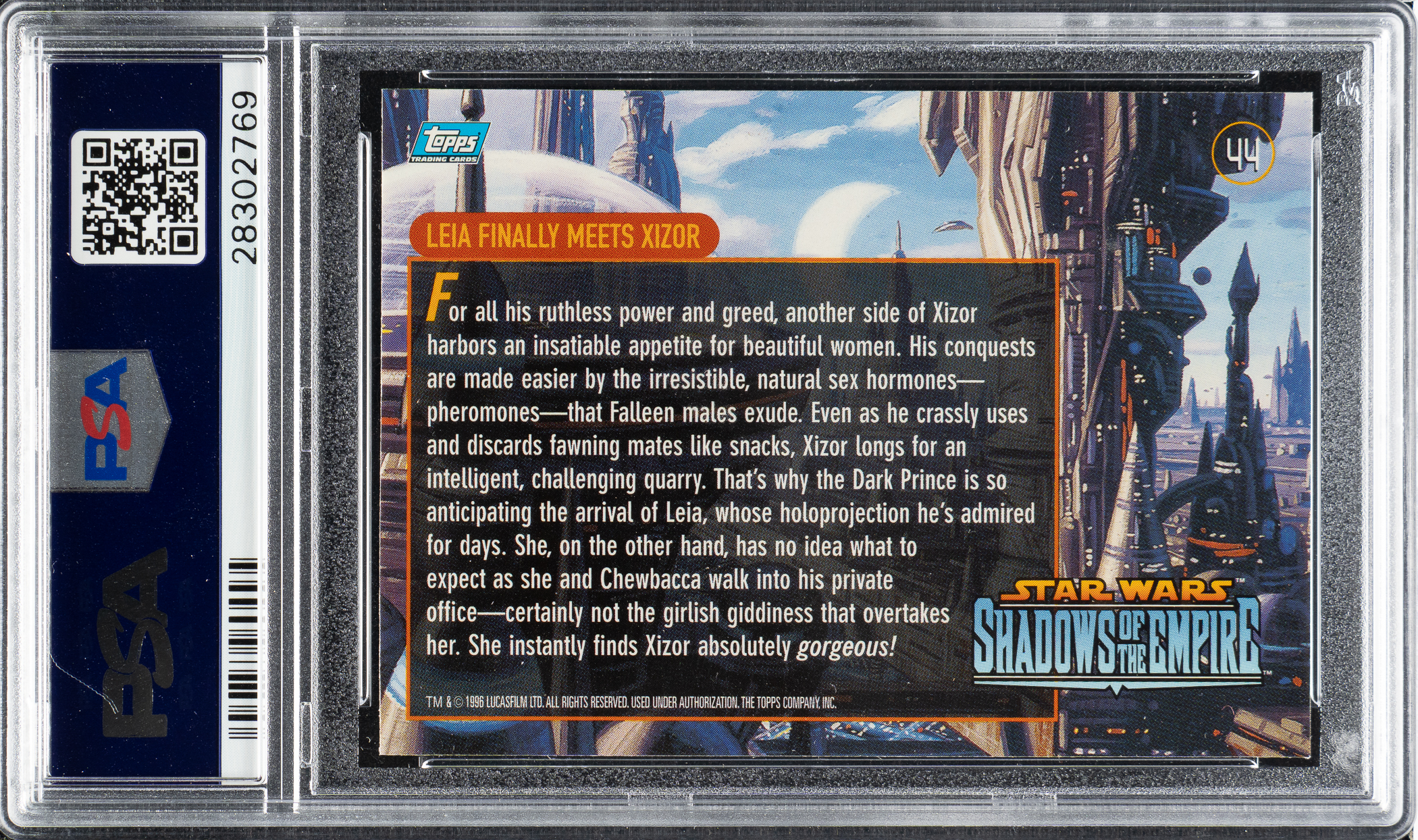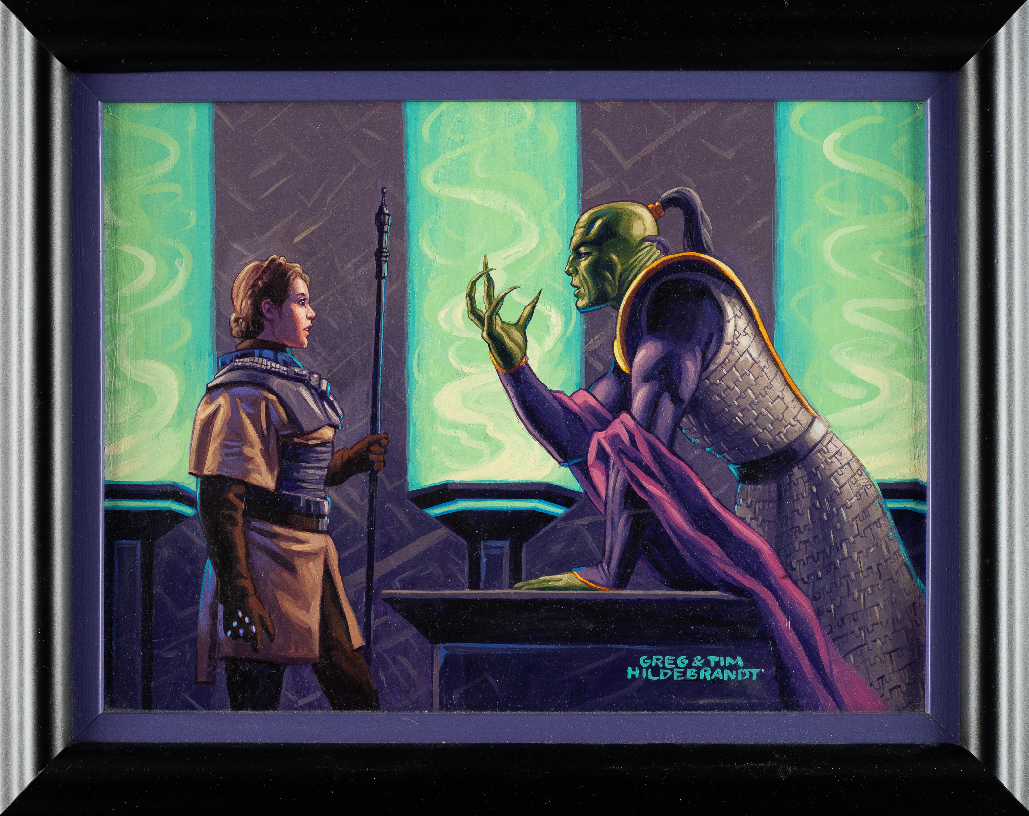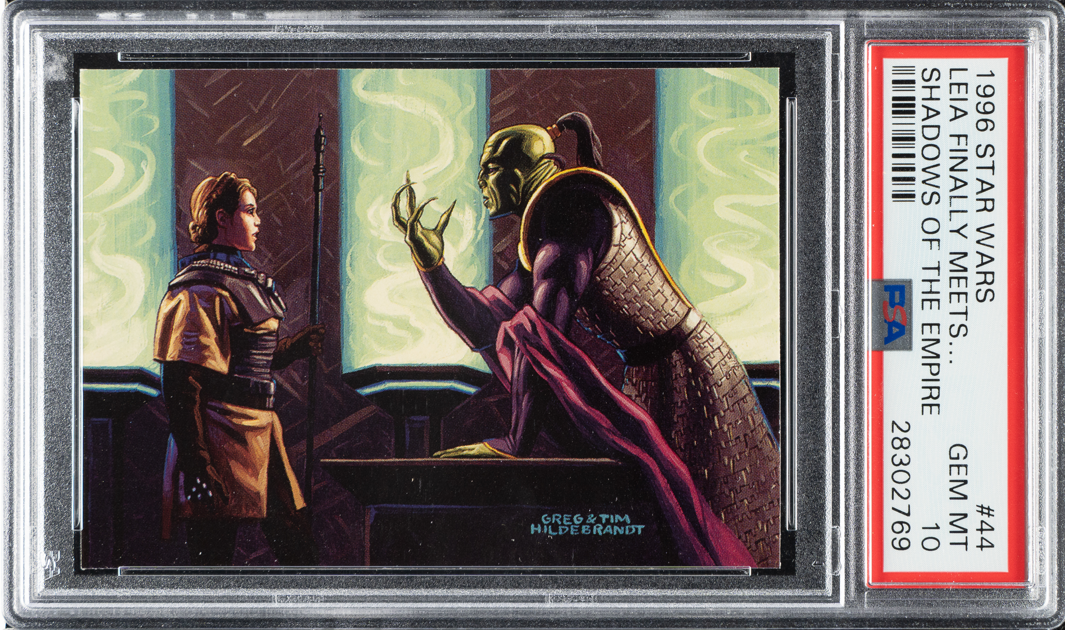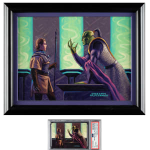 Original acrylic-on-board artwork by Tim and Greg Hildebrandt used for the production of card #44 in the 1996 Topps "Star Wars" Shadows of the Empire set, titled "Leia Finally Meets Xizor." In this scene, Xizor is captured seducing Princess Leia in his private office. Interestingly, Leia is wearing the Boushh outfit that she also wore when she freed Han Solo from the carbonite in Return of the Jedi. Tim and Greg Hildebrandt were acclaimed fantasy and science fiction artists who, in addition to providing the art for this set, are best remembered for creating the iconic "style B" poster for the first movie of the Star Wars franchise. The artwork (14 x 10 inches; visible dimensions) is in apparent Near Mint condition overall. Framed to total dimensions of 18 x 14 inches. Accompanied by a PSA 10 copy of the card. Total: 2 items (artwork and card). The size/weight of this item requires that there will be an additional shipping charge for this lot.