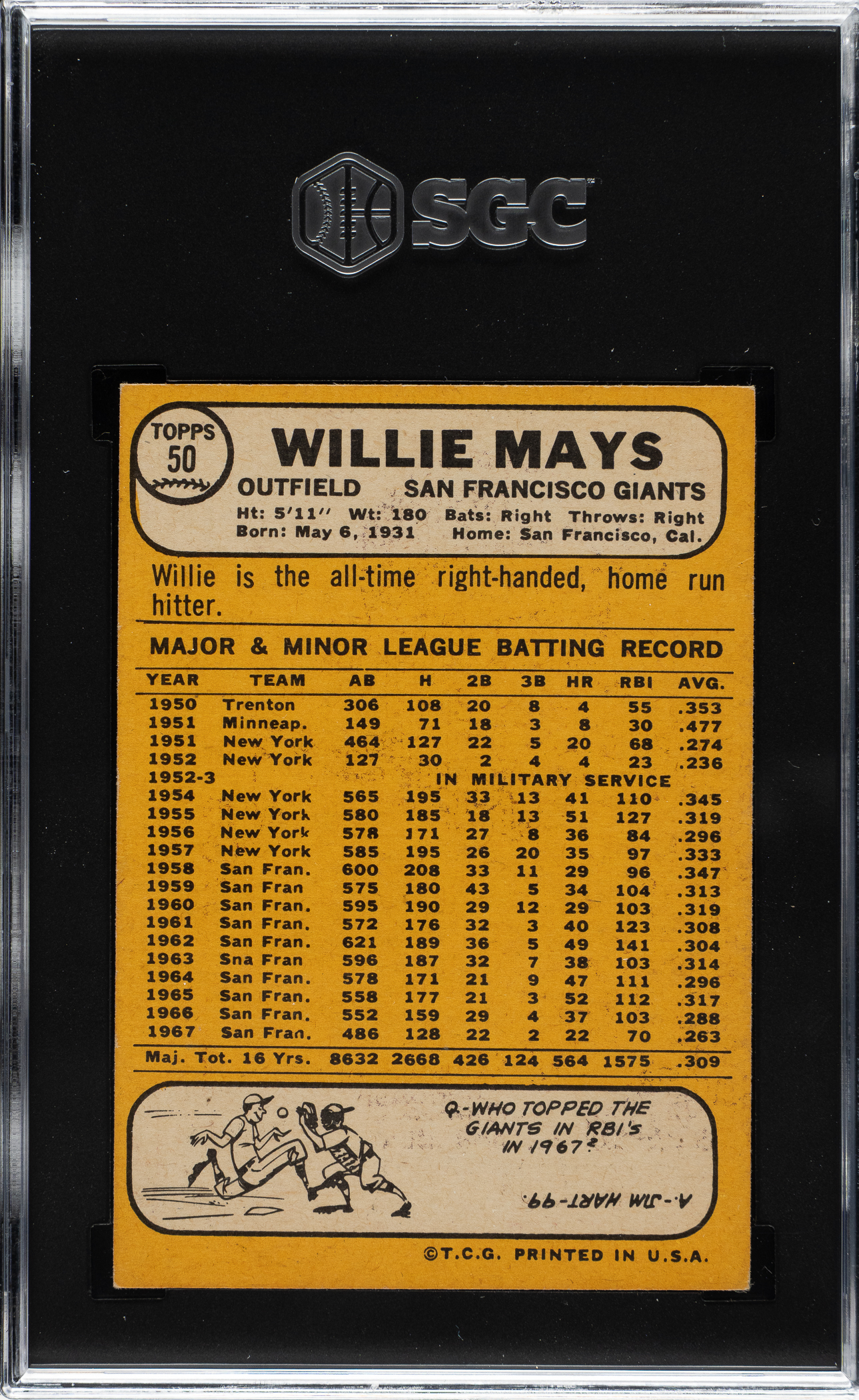 Lot # 2118: 1968 Topps #50 Willie Mays SGC VG/EX+ 4.5