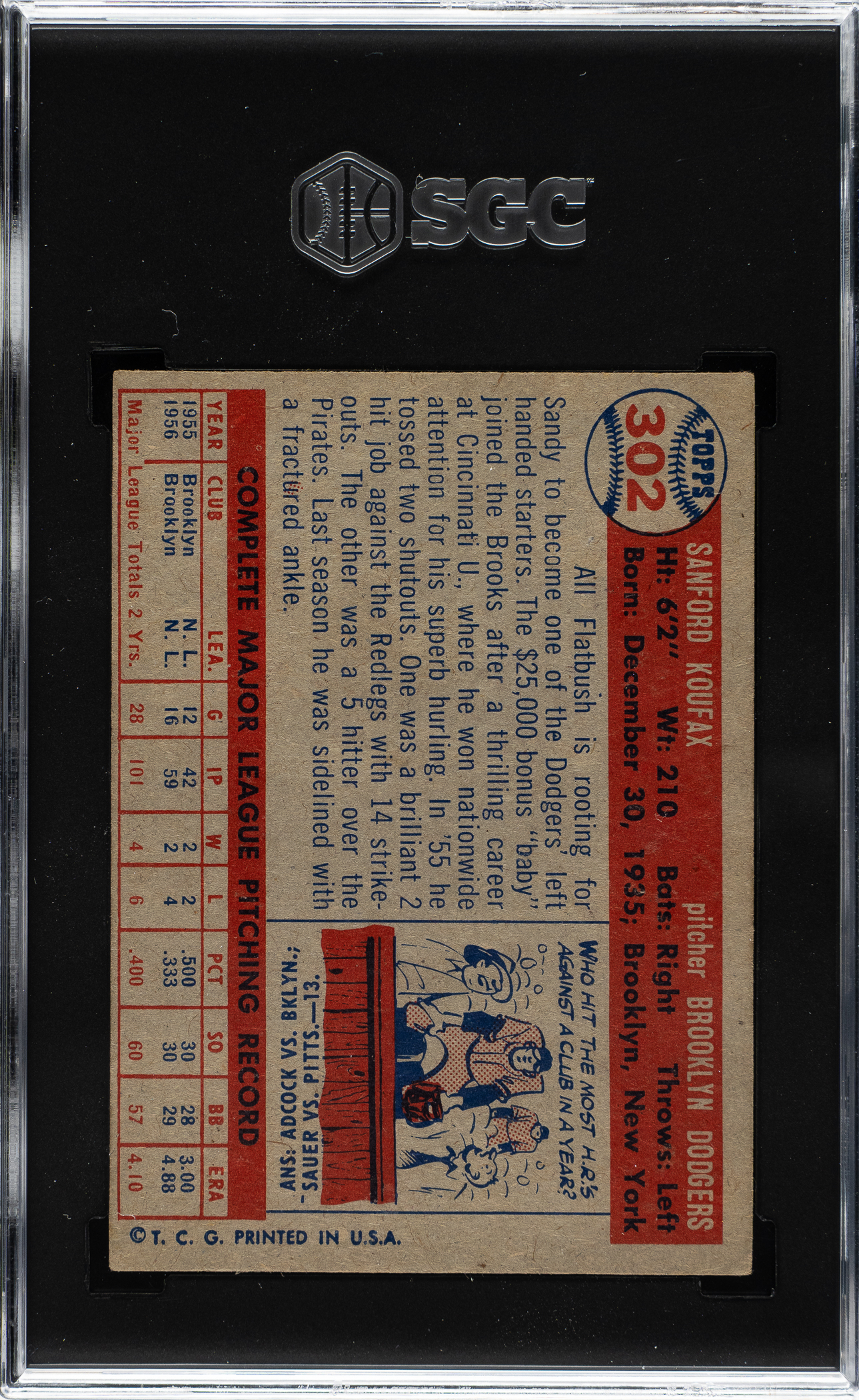 Lot # 1705: 1957 Topps #302 Sandy Koufax SGC VG/EX 4