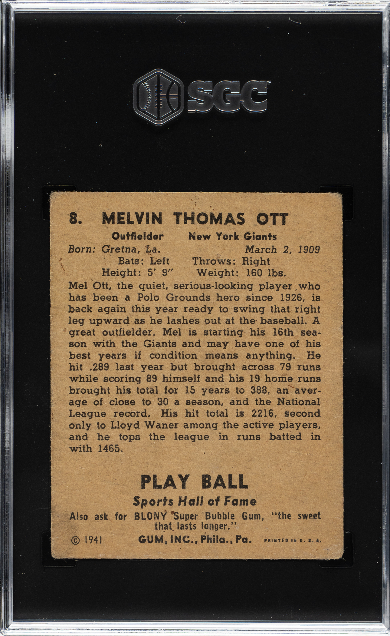 Graded GOOD 2 by SGC. New York Giants Hall of Famer Mel Ott.