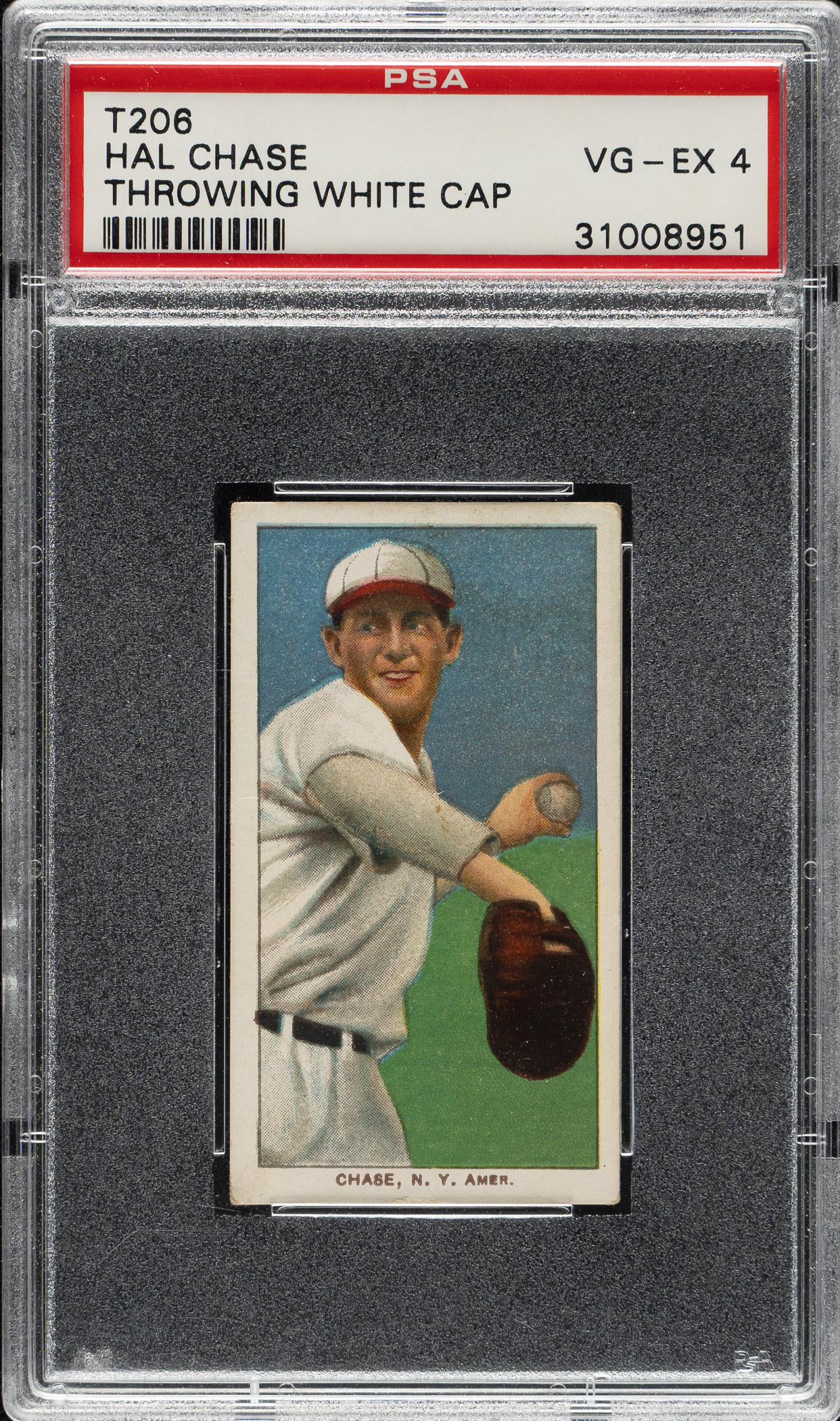 Lot # 203: 1909-1911 T206 White Border Hal Chase Throwing White Cap PSA VG-EX 4