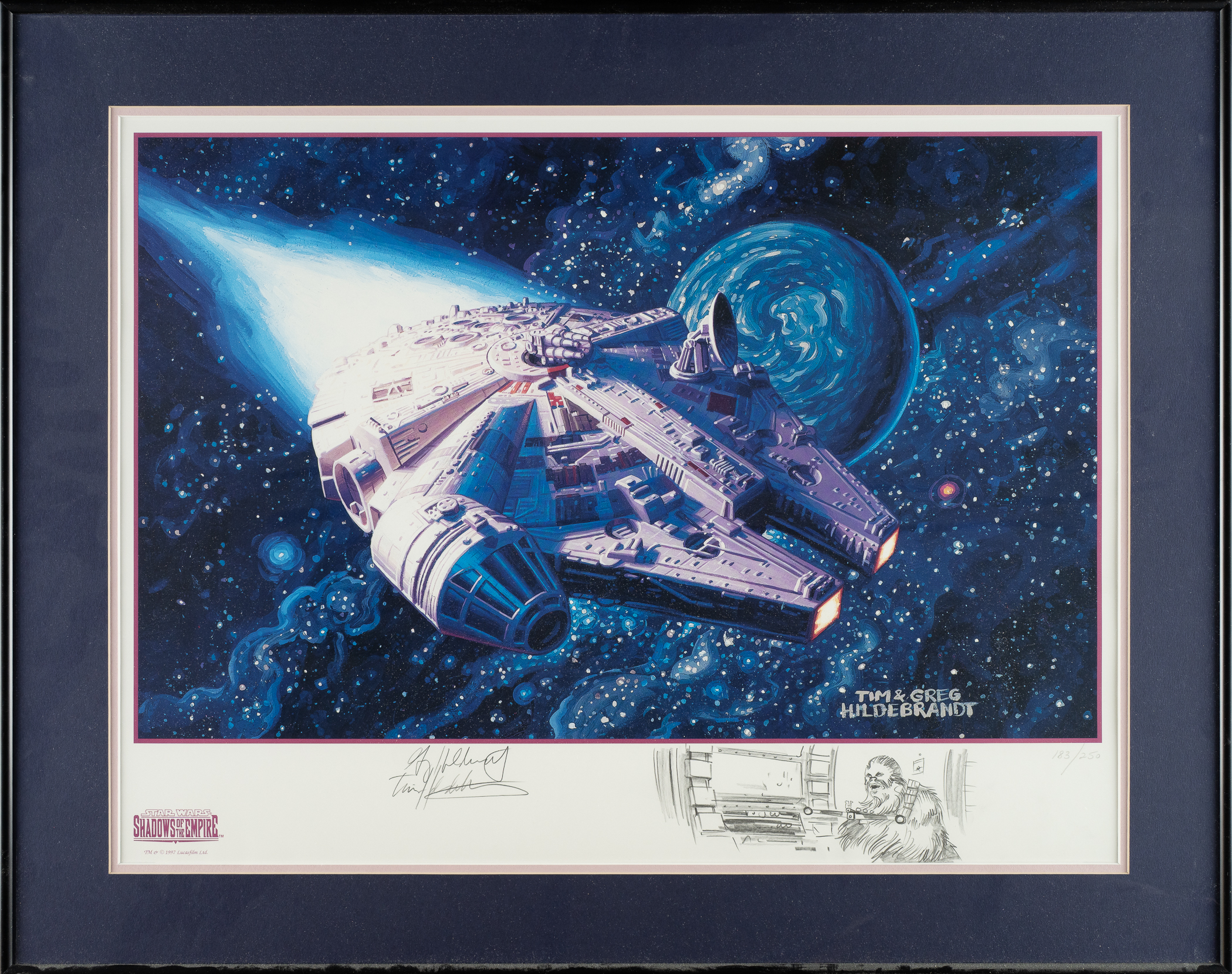 Pair of limited-edition "Star Wars" lithographs by artists Tim and Greg Hildebrandt. These lithographs are of cards #29 Vader Destroys the Rebel Base and #83 Millennium Falcon from the 1996 "Star Wars" Shadows of the Empire trading card series. Each lithograph is signed by the artist in pencil in the lower margin and is accompanied by a remarque. The Vader piece is hand-numbered "234/250" while the Millennium Falcon piece is hand-numbered "183/250." Tim and Greg Hildebrandt were acclaimed fantasy and science fiction artists who, in addition to providing the art for this set, are best remembered for creating the iconic "style B" poster for the first movie of the Star Wars franchise. The lithographs (17 x 23 inches; visible dimensions) are both in apparent Near Mint condition overall. Mated and framed to total dimensions of 24 x 30 inches. Auction LOA from James Spence/JSA. The size/weight of this item requires that there will be an additional shipping charge for this lot.