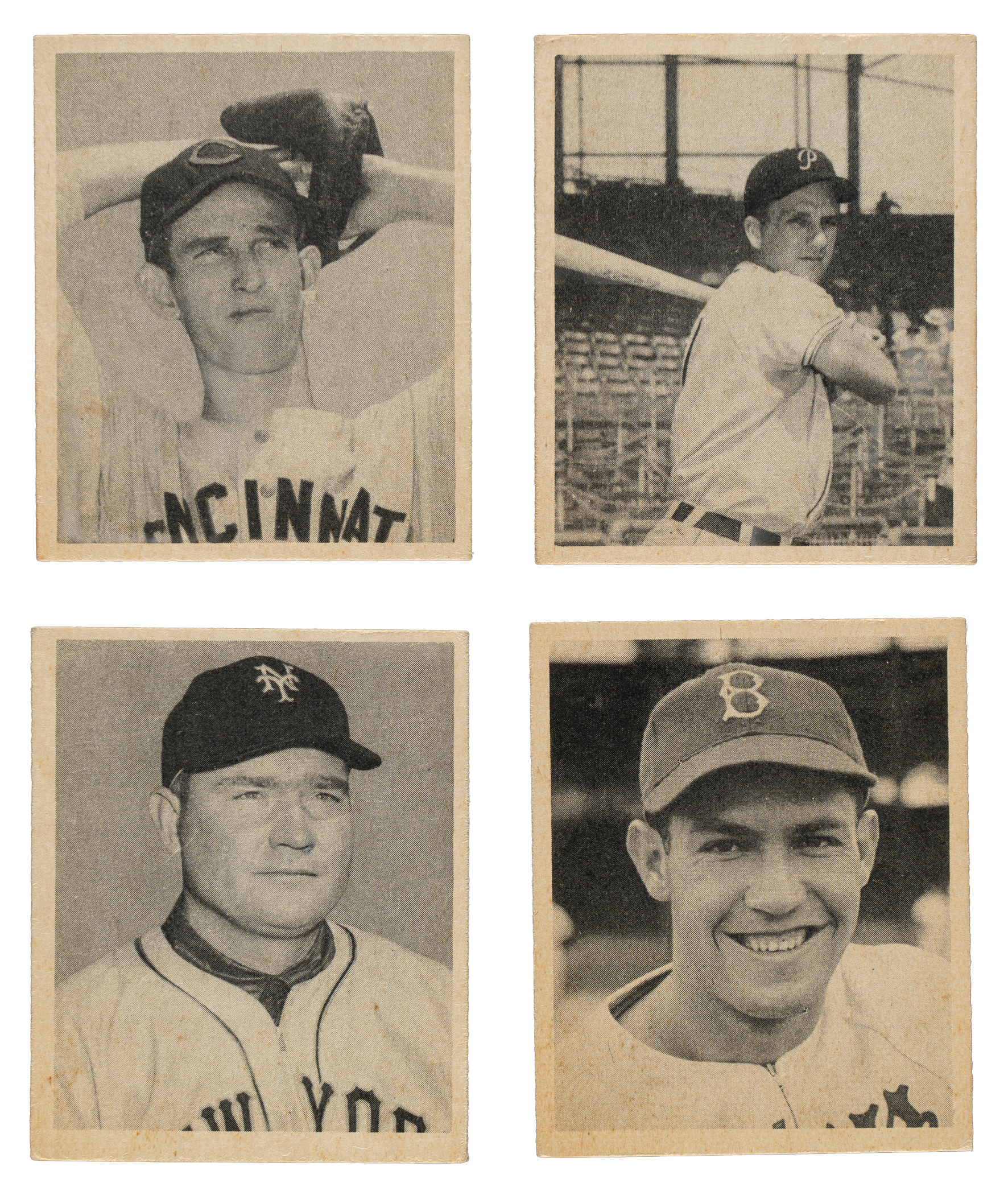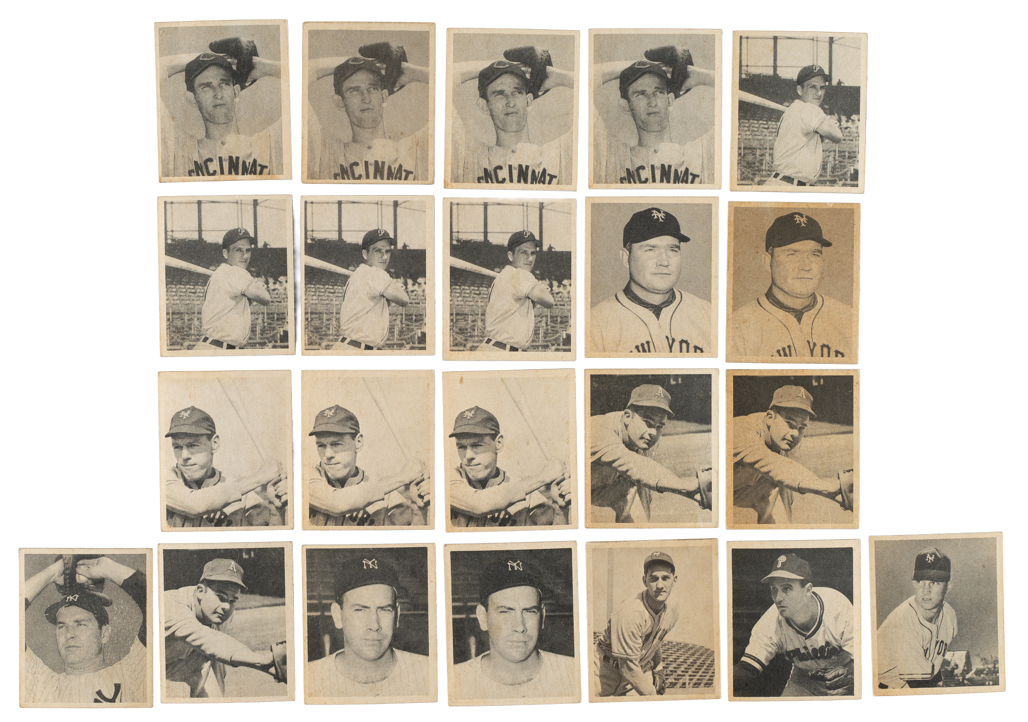 Presented is a very attractive mid-grade collection of twenty-six assorted 1948 Bowman baseball cards, highlighted by Hall of Famers Johnny Mize (3) and Ralph Kiner RC (5). Condition is 42% Ex to Ex-Mt (mostly Ex), 43% Vg to Vg-Ex, and 15% lesser. This collection consists of the following: Five #2 Blackwell (two Ex, Vg-Ex, Vg, and Gd), five 3 Kiner RC (two Ex and three Vg-Ex), three 4 Mize (Ex-Mt, Vg-Ex, and Vg+), 7 Reiser SP (Ex), three 20, three 21 Fain RC, two 22, 23, 24, 29 Page RC (Gd+), and 34. Total: 26 cards.