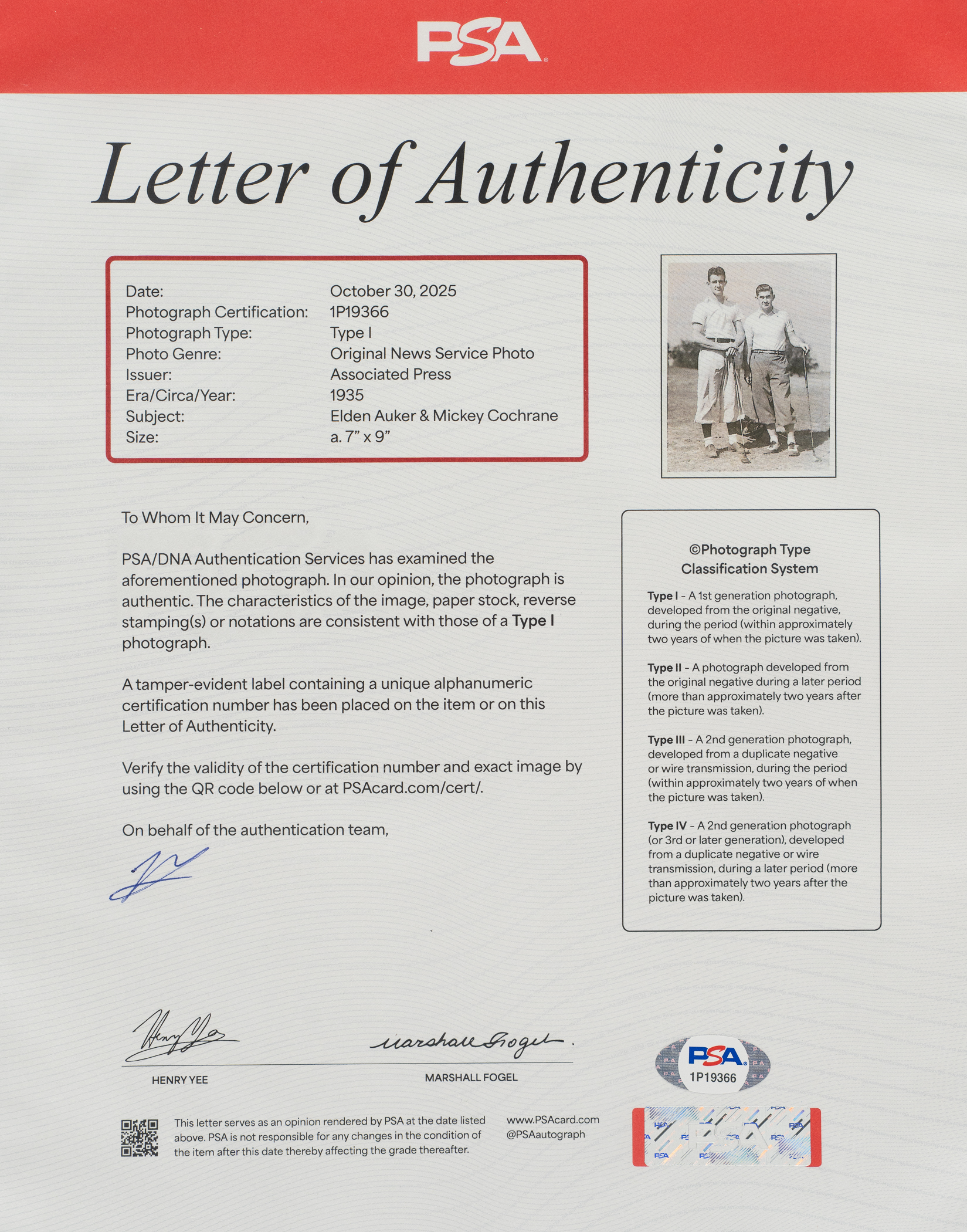 Detroit Tigers Hall of Famer Mickey Cochrane. Certified as an original Type I photograph by PSA/DNA. Total dimensions: 7 x 9 Inches. Full LOA from PSA/DNA.