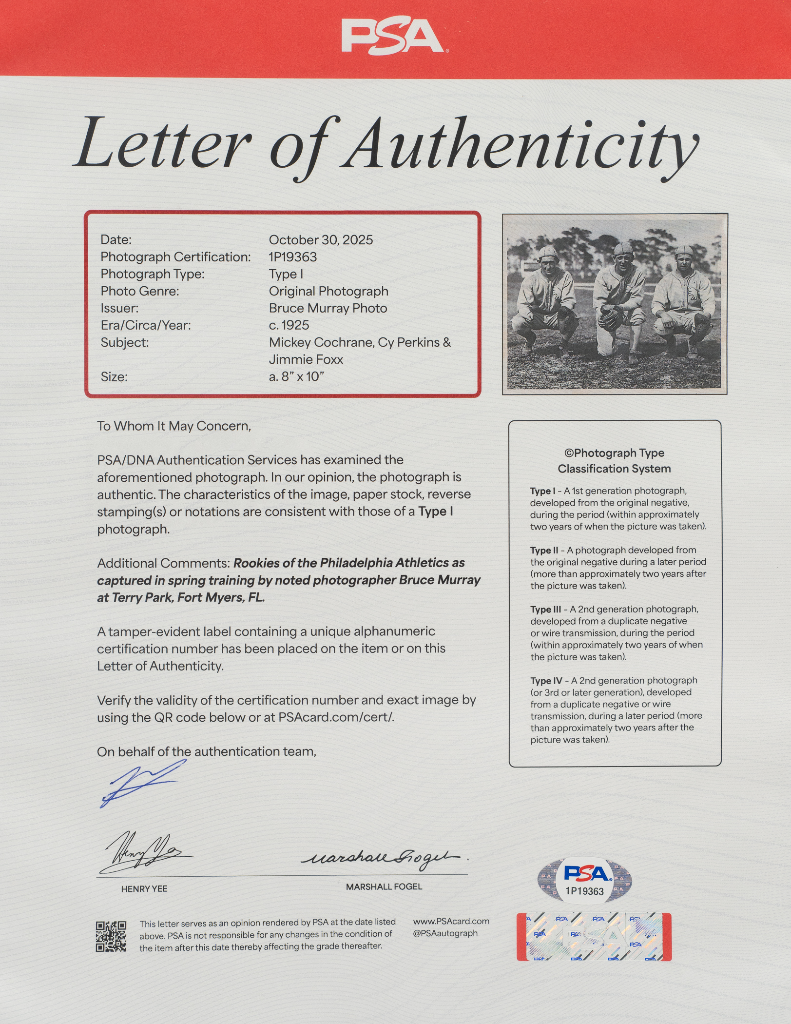 Philadelphia Athletics Hall of Famers Mickey Cochrane and Jimmie Foxx. Certified as an original Type I photograph by PSA/DNA. Total dimensions: 8 x 10 Inches. Full LOA from PSA/DNA.