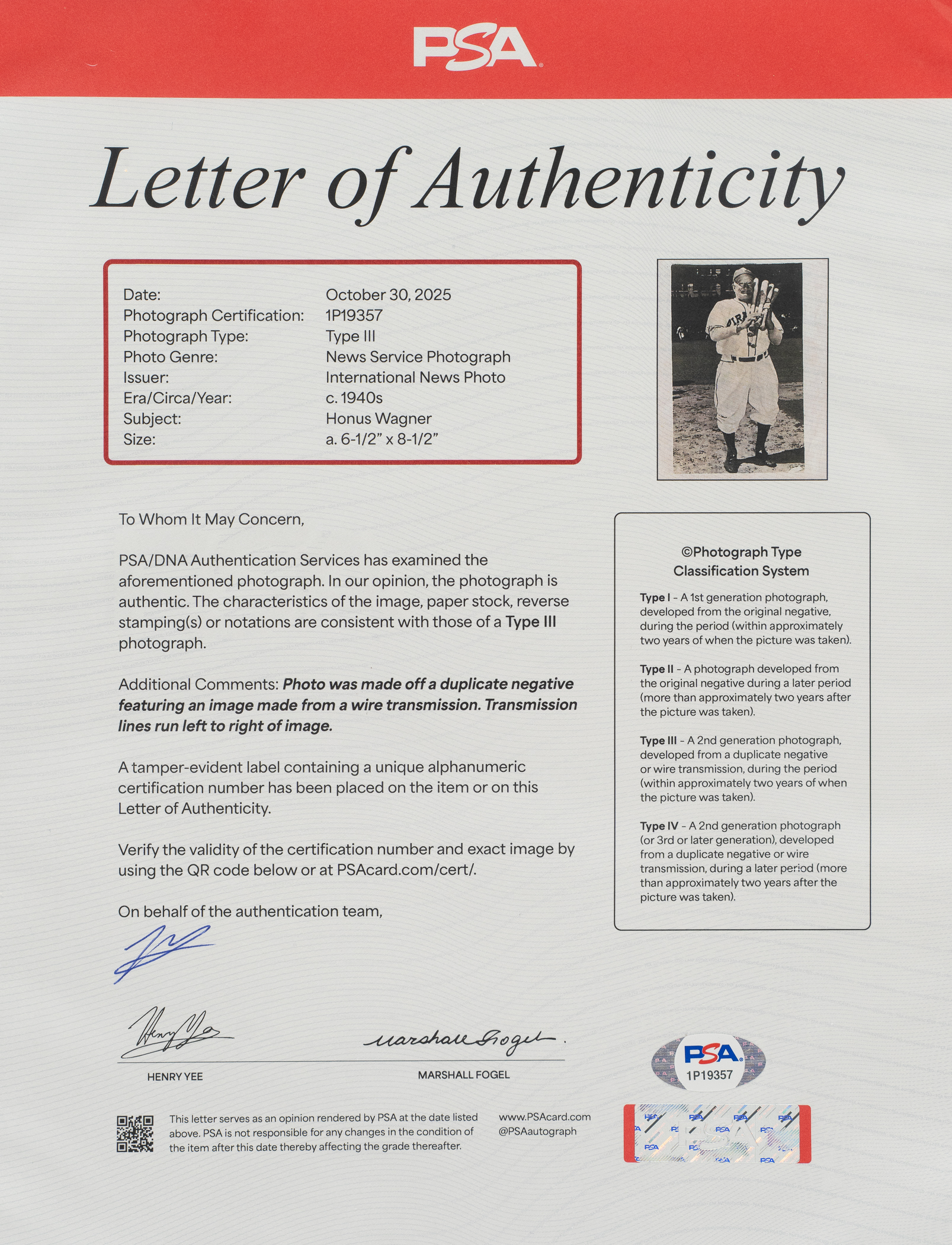 Pittsburgh Pirates Hall of Famer Honus Wagner. Certified as a Type III photograph by PSA/DNA. Total dimensions: 6-1/2 x 8-1/2 Inches. Full LOA from PSA/DNA.