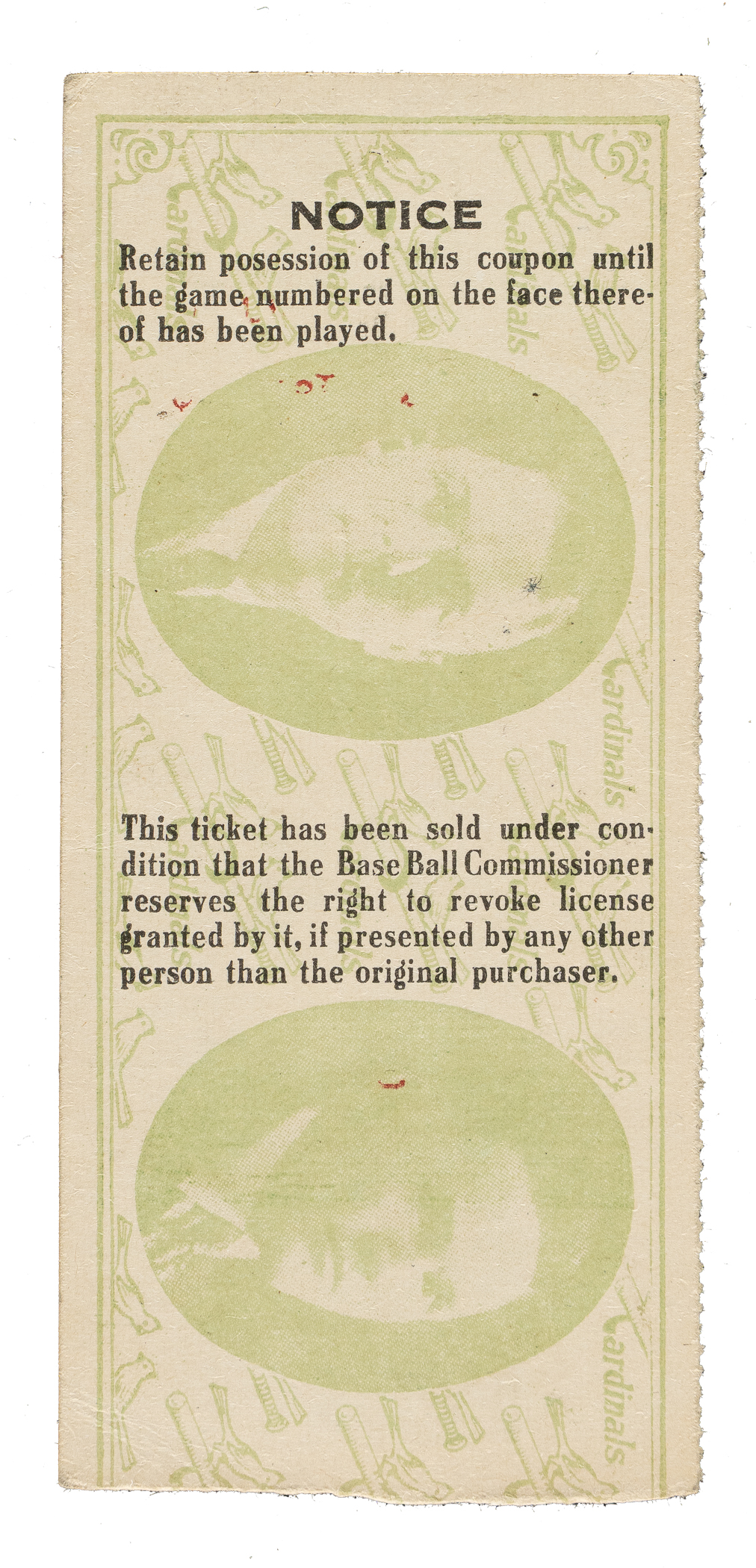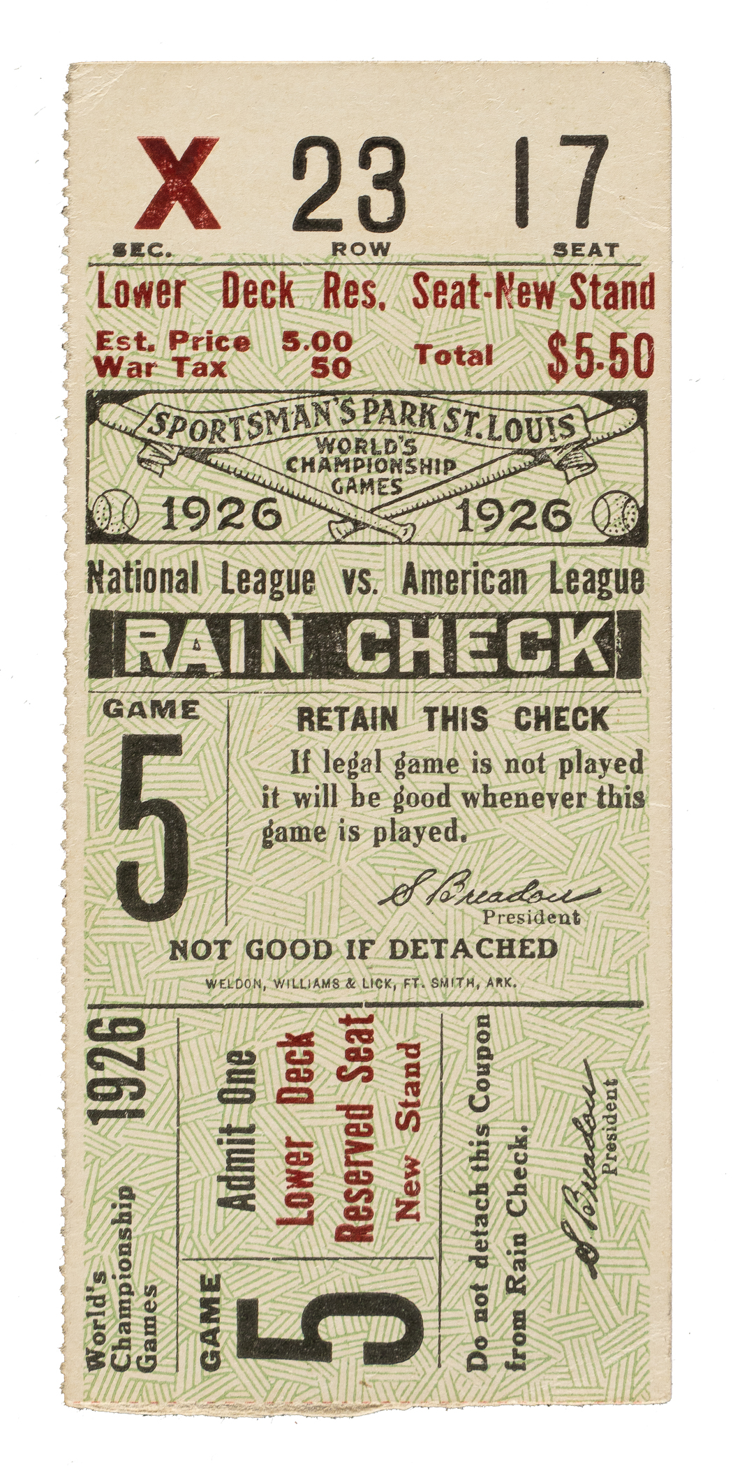 Ticket stub issued for Game 5 of the 1926 World Series between the St. Louis Cardinals and New York Yankees held at Sportsman Park on October 7th. Tony Lazzeri drove in the game-winning run via a sacrifice fly in the 10th inning as the Yankees defeated the Cardinals 3-2. The Cardinals rallied, however, winning the next two games to clinch the club’s first World Championship in franchise history. The ticket stub (4-1/4 x 2-7/8 inches), issued for a “Lower Deck Res.” seat, is in Excellent condition overall.