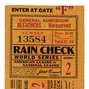 Ticket stub issued for Game 2 of the 1932 World Series between the Chicago Cubs and New York Yankees held at Yankee Stadium on September 29th. The Yankees defeated the Cubs 5-2 in Game 2. The victory not only led to a sweep of the Cubs, but it also marked Babe Ruth’s last appearance in a World Series game at Yankee Stadium. The ticket stub (3.5 x 2.75 inches) displays several tack holes and has two strips of clear tape affixed to the reverse. Fair condition overall.