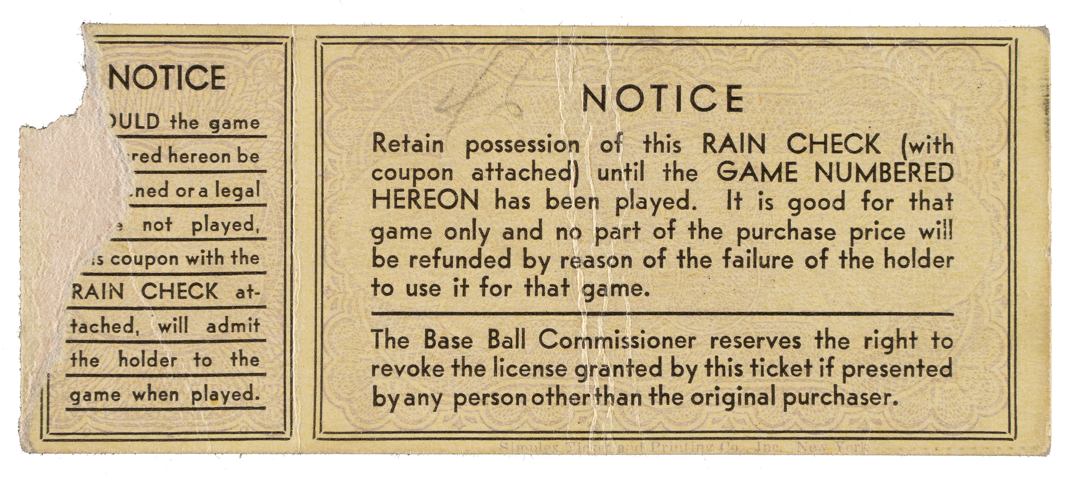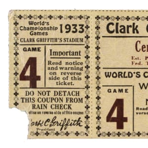 Ticket stub issued for Game 4 of the 1933 World Series between the Washington Senators and New York Giants at Griffith Stadium. Blondy Ryan knocked in the game-winning run in the 11th inning as the Giants defeated the Senators 2-1. The ticket stub (5-1/8 x 2-1/8 inches), which is for a "Center Field Pavilion" seat, is in Fair condition overall.