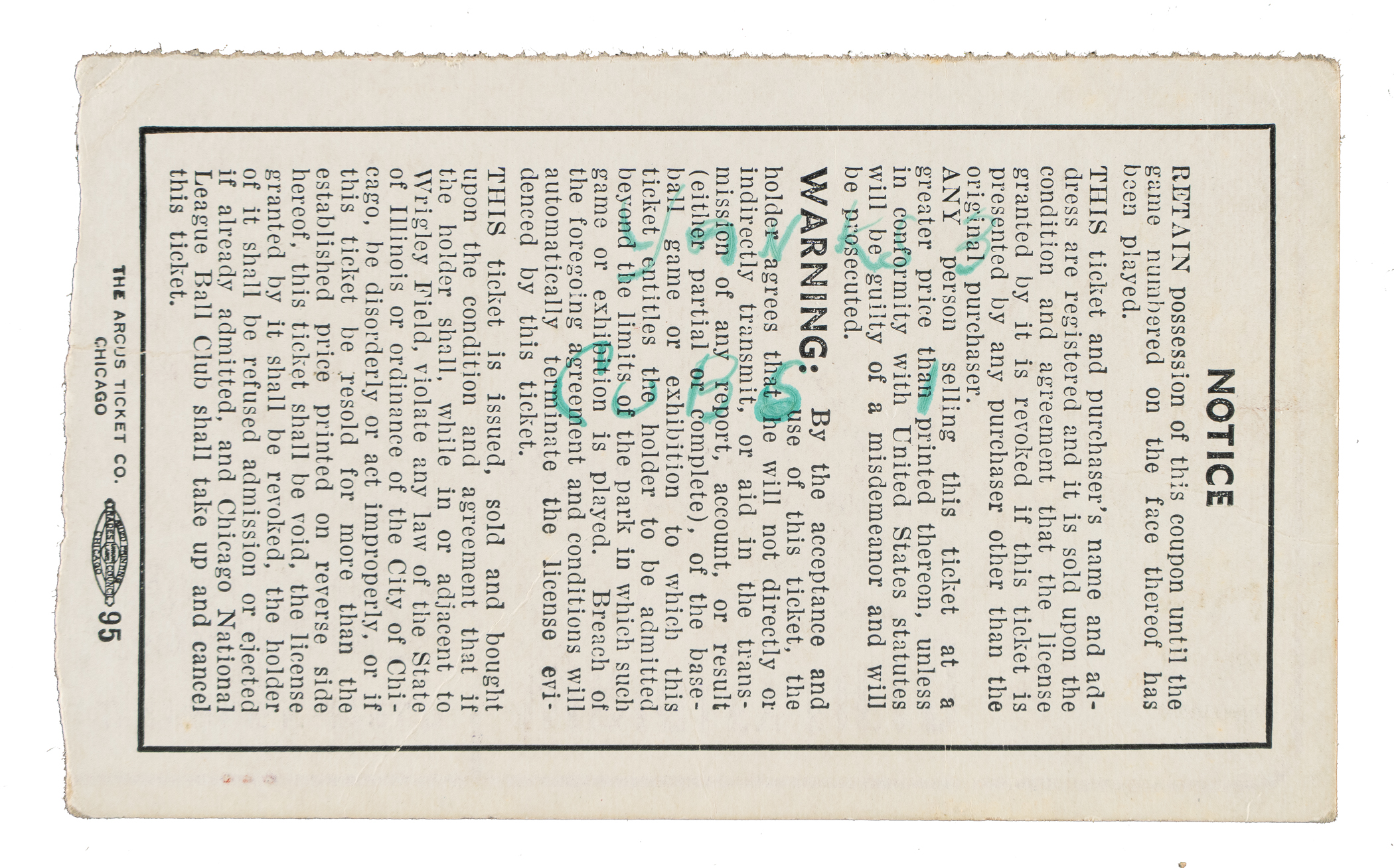 Ticket stub issued for Game 1 of the 1938 World Series between the Chicago Cubs and New York Yankees at Wrigley Field. Bill Dickey had four hits as his Yankees defeated the Cubs 3-1. The ticket stub (3-3/8 x 4-1/4 inches) displays green ink notations on the back but is otherwise in Very Good to Excellent condition overall.