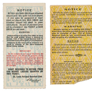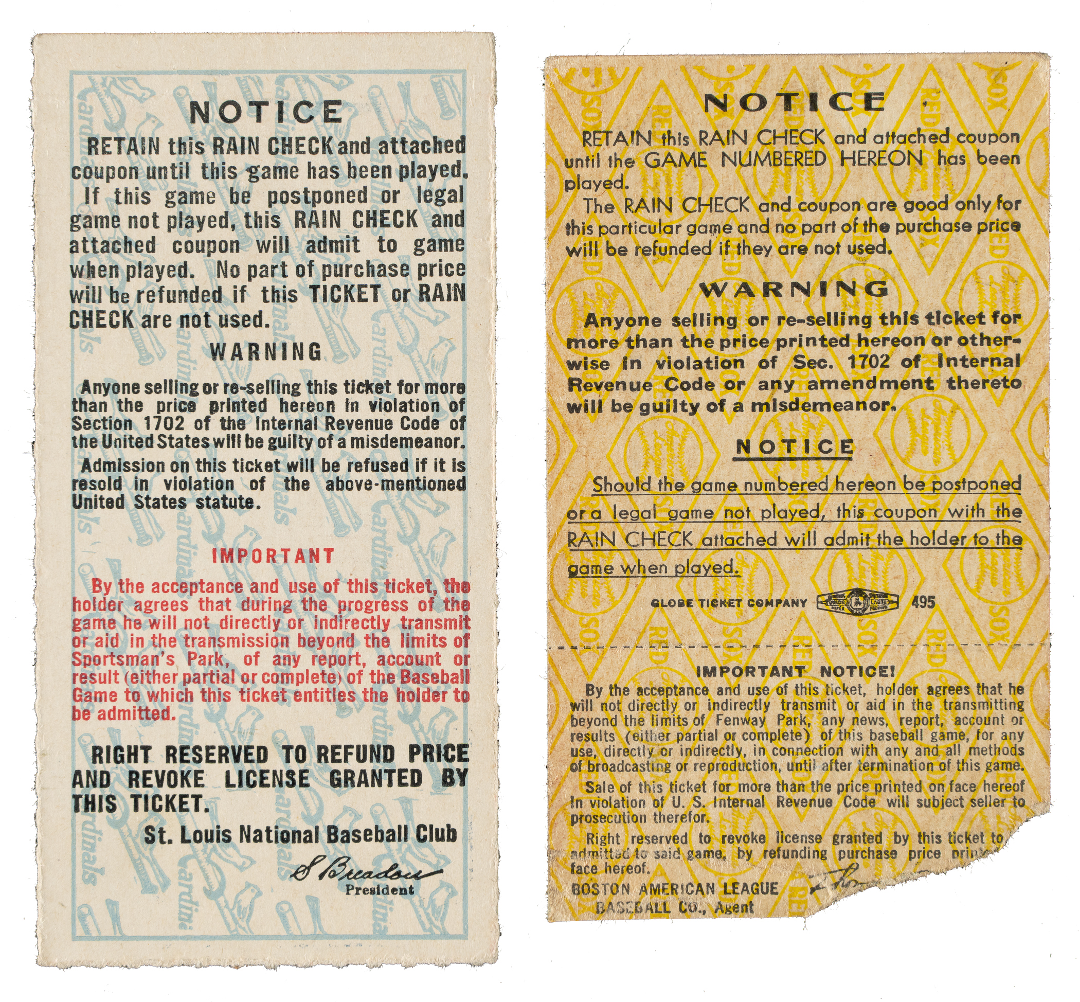 Pair of ticket stubs issued to the 1946 World Series between the Boston Red Sox and St. Louis Cardinals. 1) Game 2 played at Sportsman's Park (St. Louis). Won by the Cardinals 3-0. Fr. 2) Game 3 played at Fenway Park (Boston). Won by the Red Sox 4-0. Fr. Total: 2 ticket stubs.