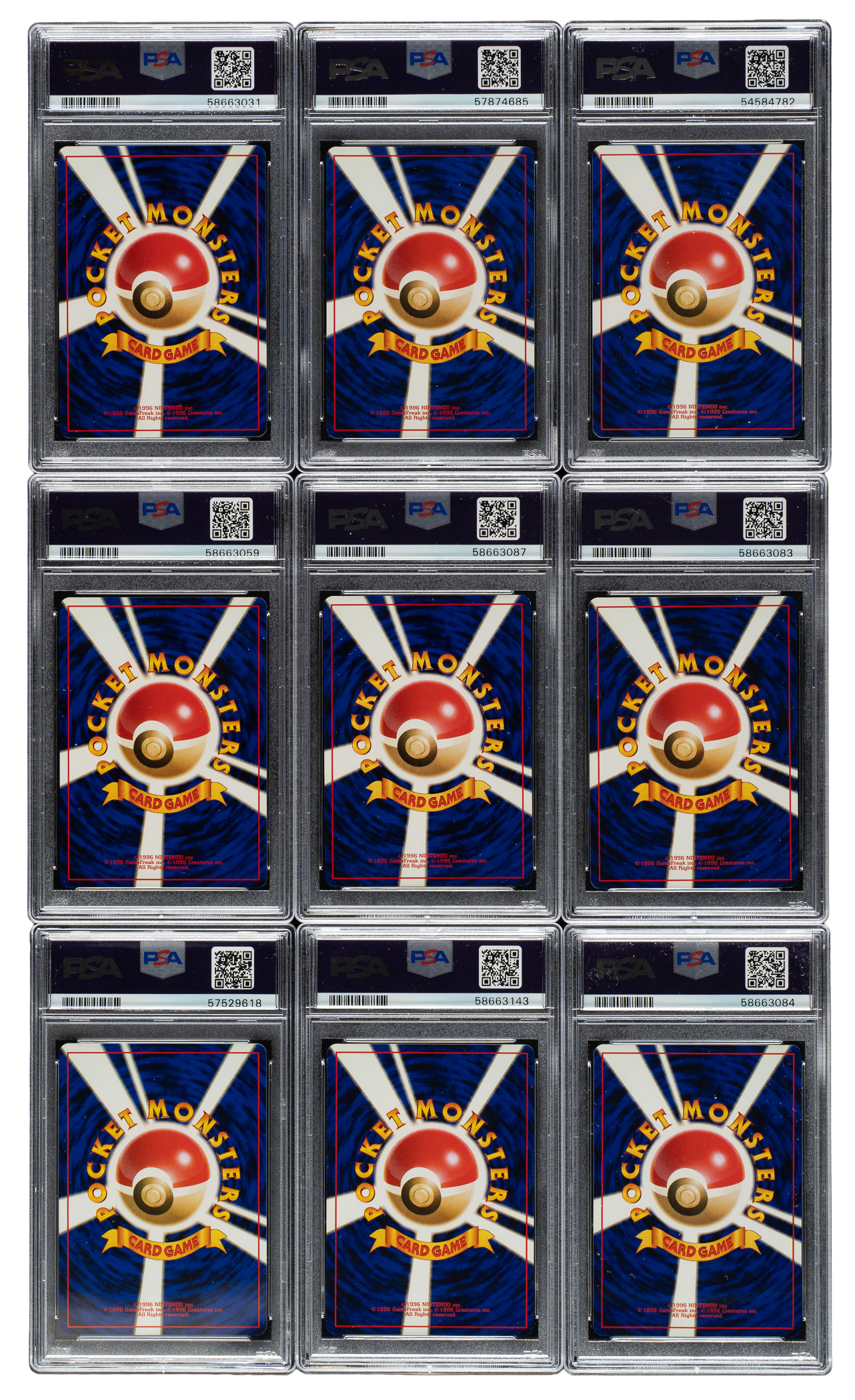 Collection of nine 1997 Pokemon Japanese Rocket cards, each graded encapsulated by PSA as MINT 9. This collection consists of the following: #4 Charmander, #5 Dark Charmeleon, 44 Dark Gloom, 50 Diglett, 63 Abra, two 64 Dark Kadabra, 66 Machop, and 136 Dark Flareon. Total 9 cards.