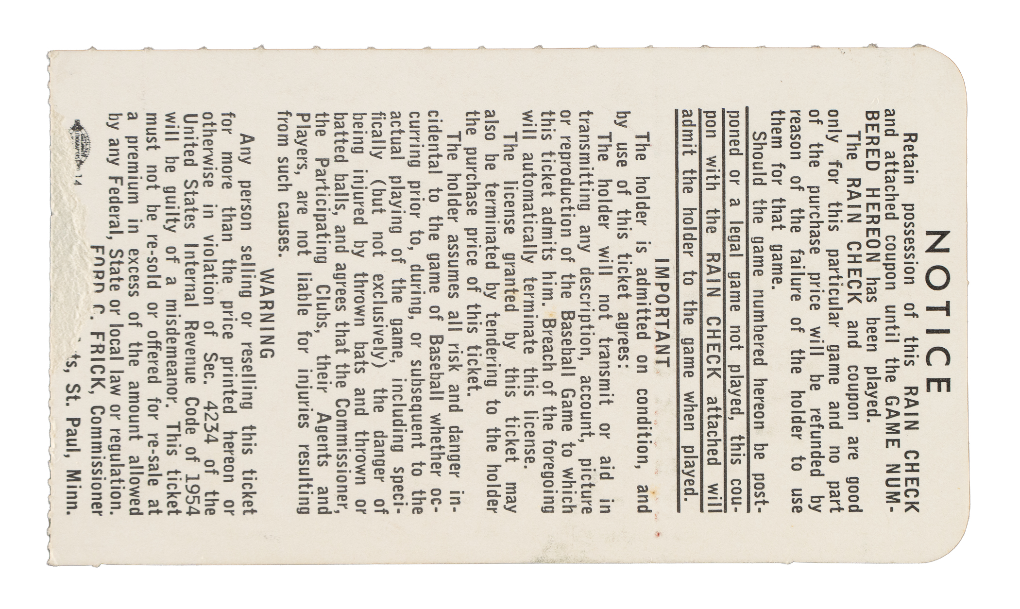 Ticket stub issued for Game 1 of the 1965 World Series held between the Los Angeles Dodgers and the Minnesota Twins at Dodger Stadium in Los Angeles on October 6th. Game 1 is best remembered for who didn't play, Sandy Koufax, who sat out for Yom Kippur as his Dodgers fell to 8-2 to the Twins. Upon returning in Game 2, Koufax dominated the rest of the World Series in historic fashion. He threw three complete games, posted a microscopic .38 ERA across 24 innings with 29 strikeouts, and closed it out with a two-hit shutout in Game 7 to earn World Series MVP honors. The ticket stub (4 x 2.25 inches) displays a small patch of paper loss along the reverse and is in Very Good condition overall.