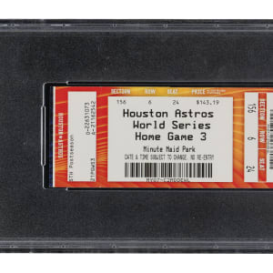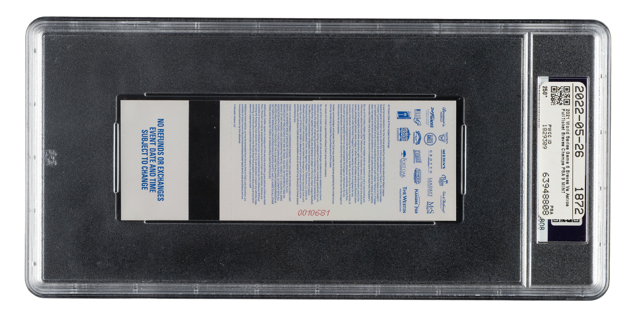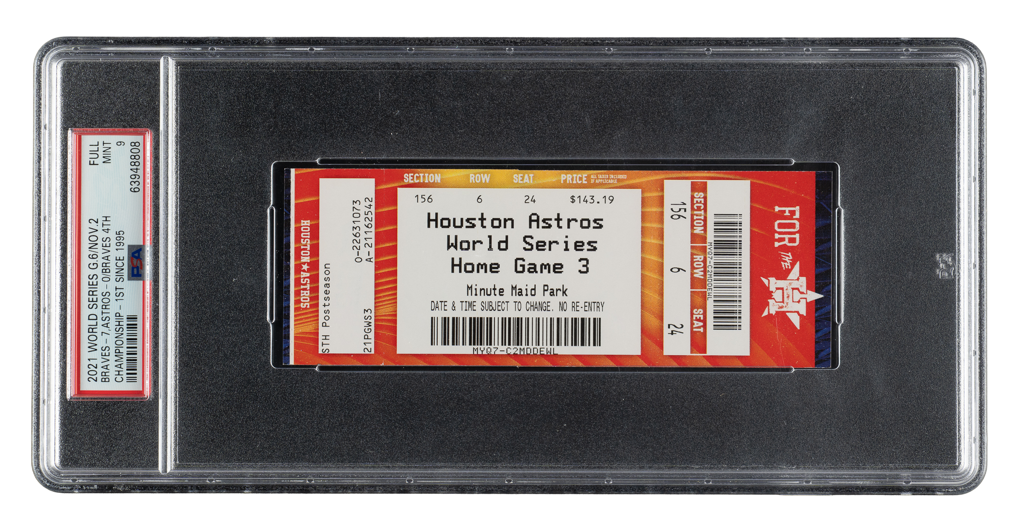 Graded MINT 9 by PSA. Full ticket (5.25 x 2 inches) issued for the 6th and final game of the 2021 World Series between the Houston Astros and Atlanta Braves held at Minute Maid Park in Houston on November 2nd. The Braves defeated the Astros 7-0 to capture their fourth World Championship in franchise history and first since 1995.