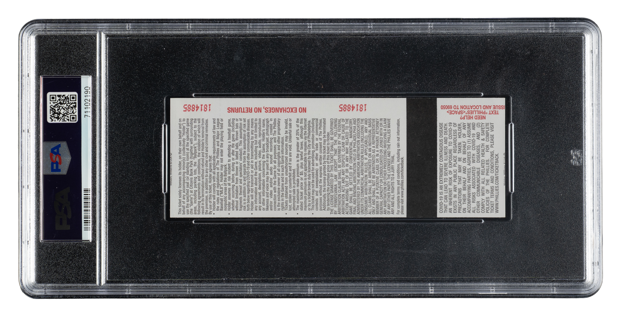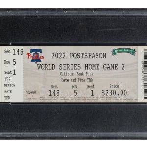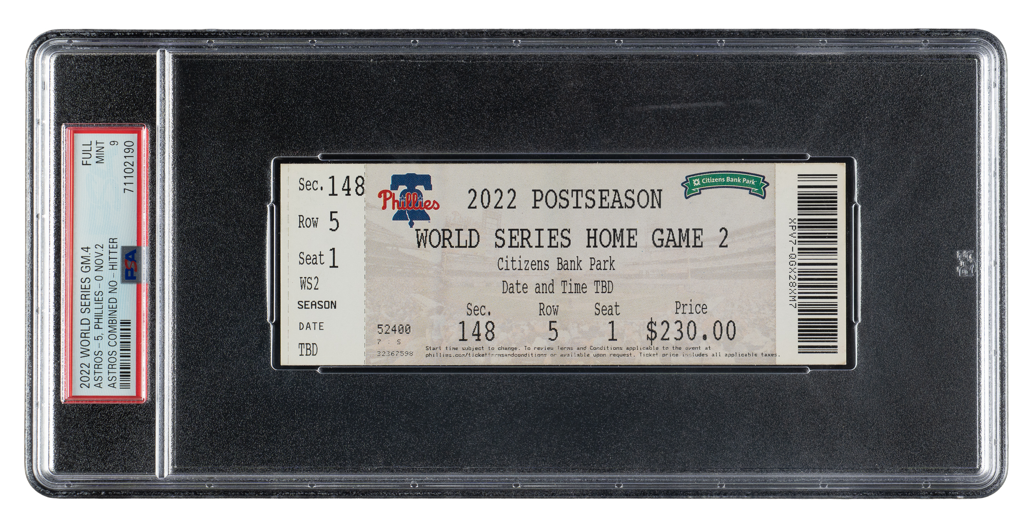 Graded MINT 9 by PSA. Full ticket (5.5 x 2 inches) issued for Game 4 of the 2022 World Series between the Philadelphia Phillies and Houston Astros held at Citizens Bank Park in Philadelphia on November 2nd. One of only four full tickets of this game assessed by PSA to date. History was made as Cristian Javier, Bryan Abreu, Rafael Montero, and Ryan Pressly of the Houston Astros combined to no-hit the Phillies. The Astros, who won the contest 5-0, claimed the franchise's second World Championship the following game. To this day, it remains only the third no-hitter in postseason victory and the only combined effort.