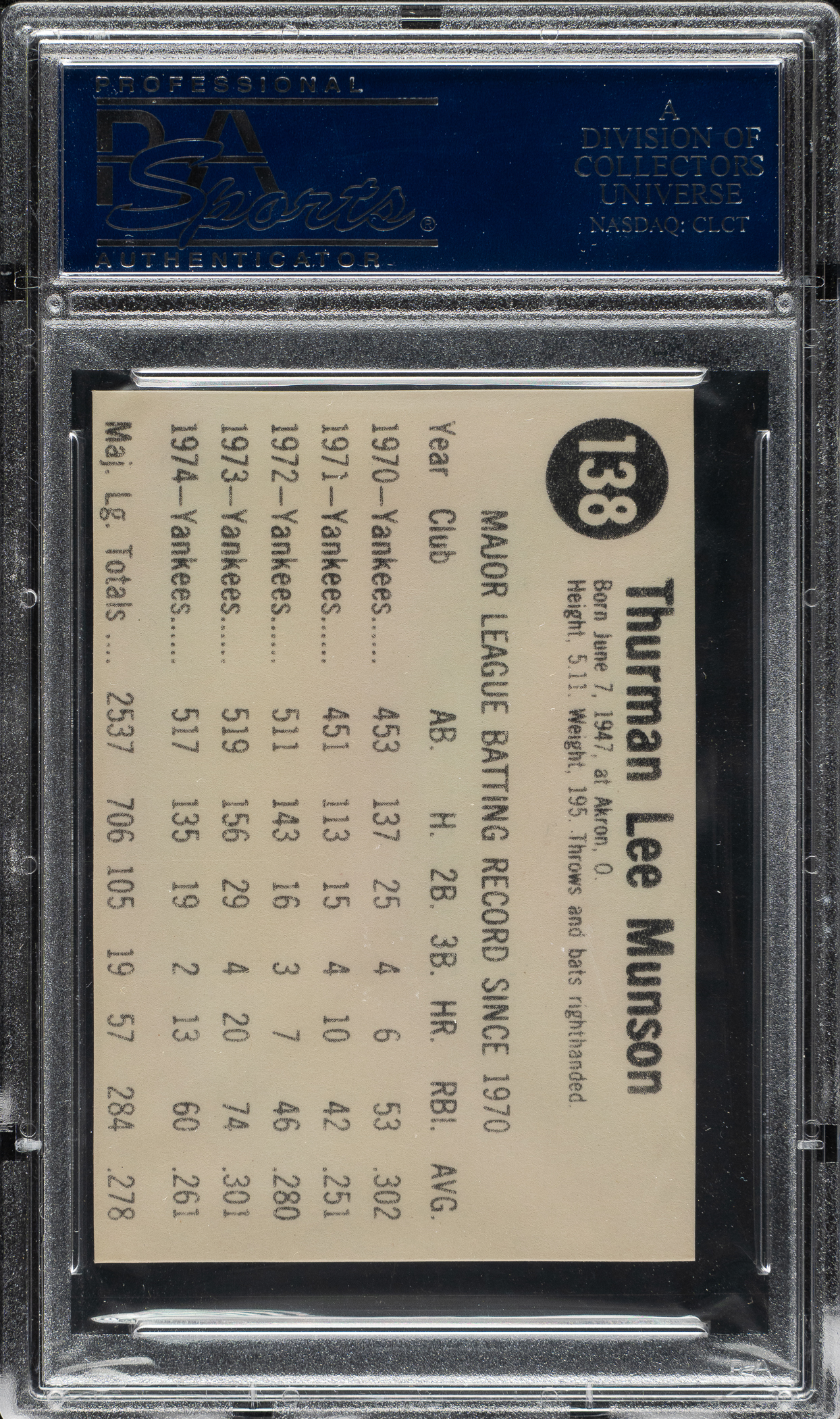 Lot # 2181: 1975 Hostess #138 Thurman Munson PSA GEM MINT 10