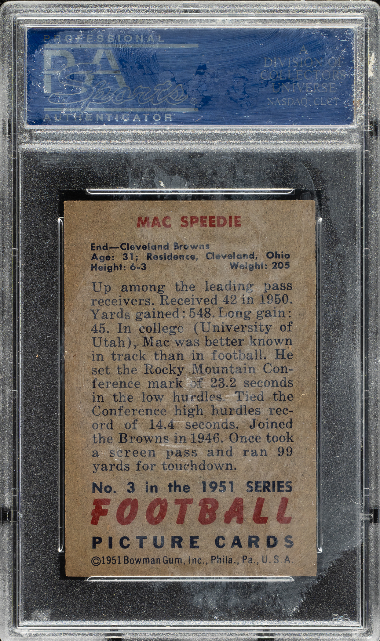 Graded NM 7 by PSA. Cleveland Browns football Hall of Famer Mac Speedie.