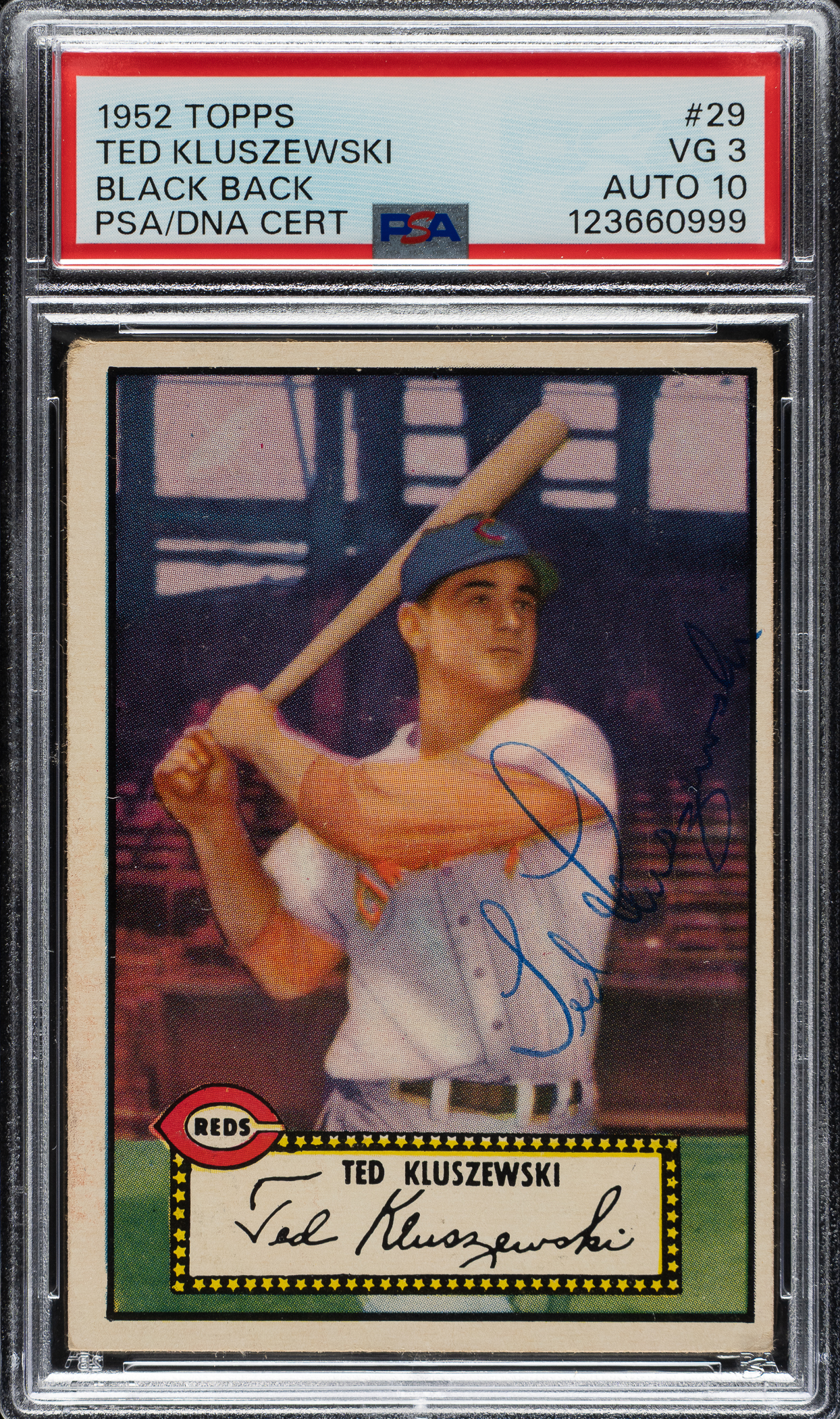 PSA/DNA has encapsulated the card, grading the signature GEM MINT 10 and the card VG 3. Cincinnati Reds.