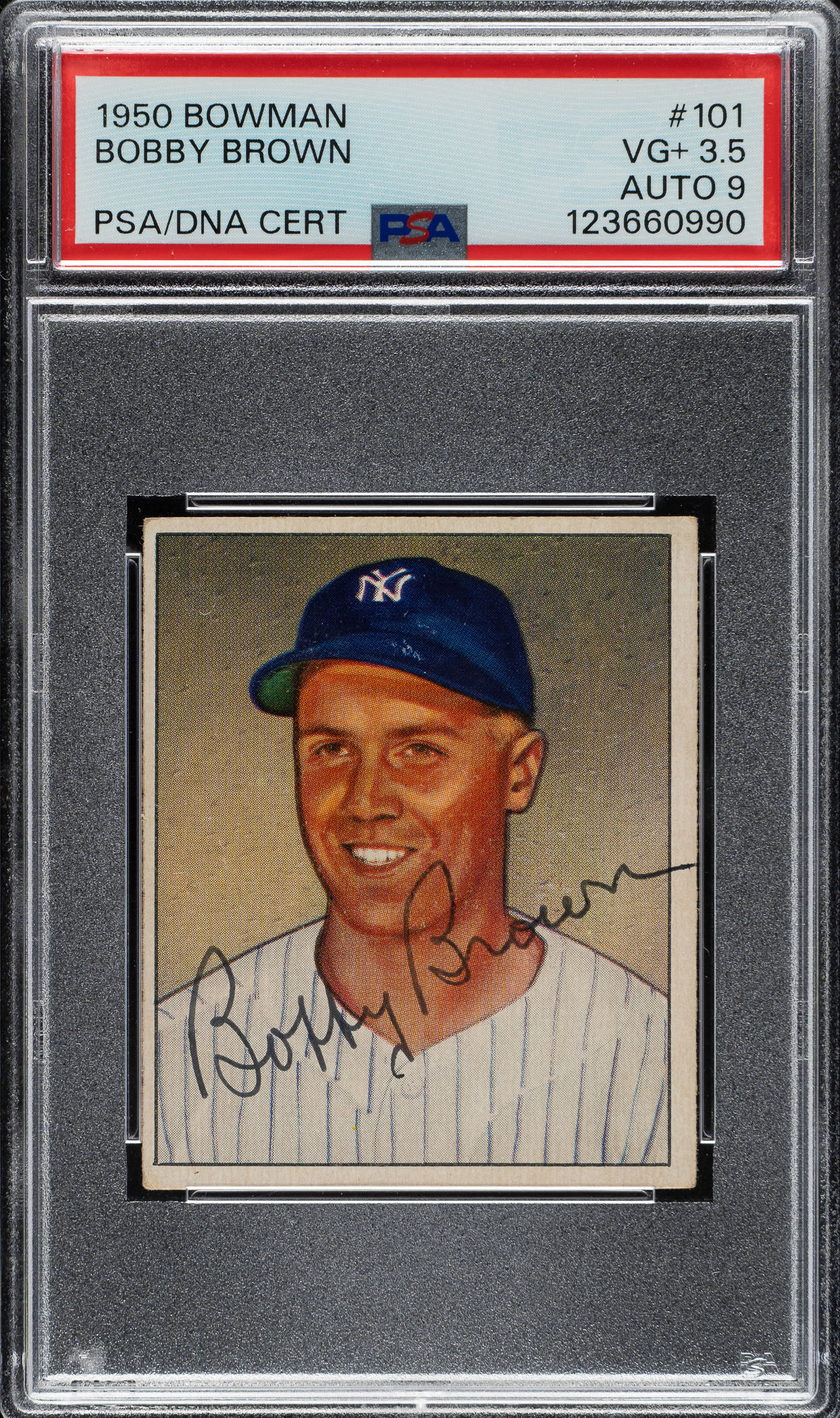PSA/DNA has encapsulated the card, grading the signature MINT 9 and the card VG+ 3.5. New York Yankees.