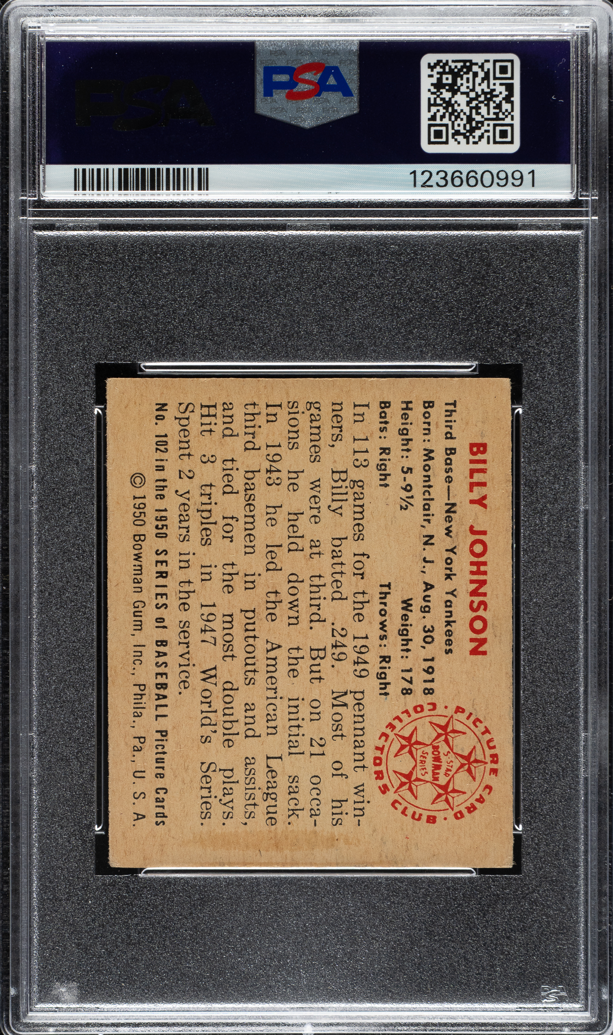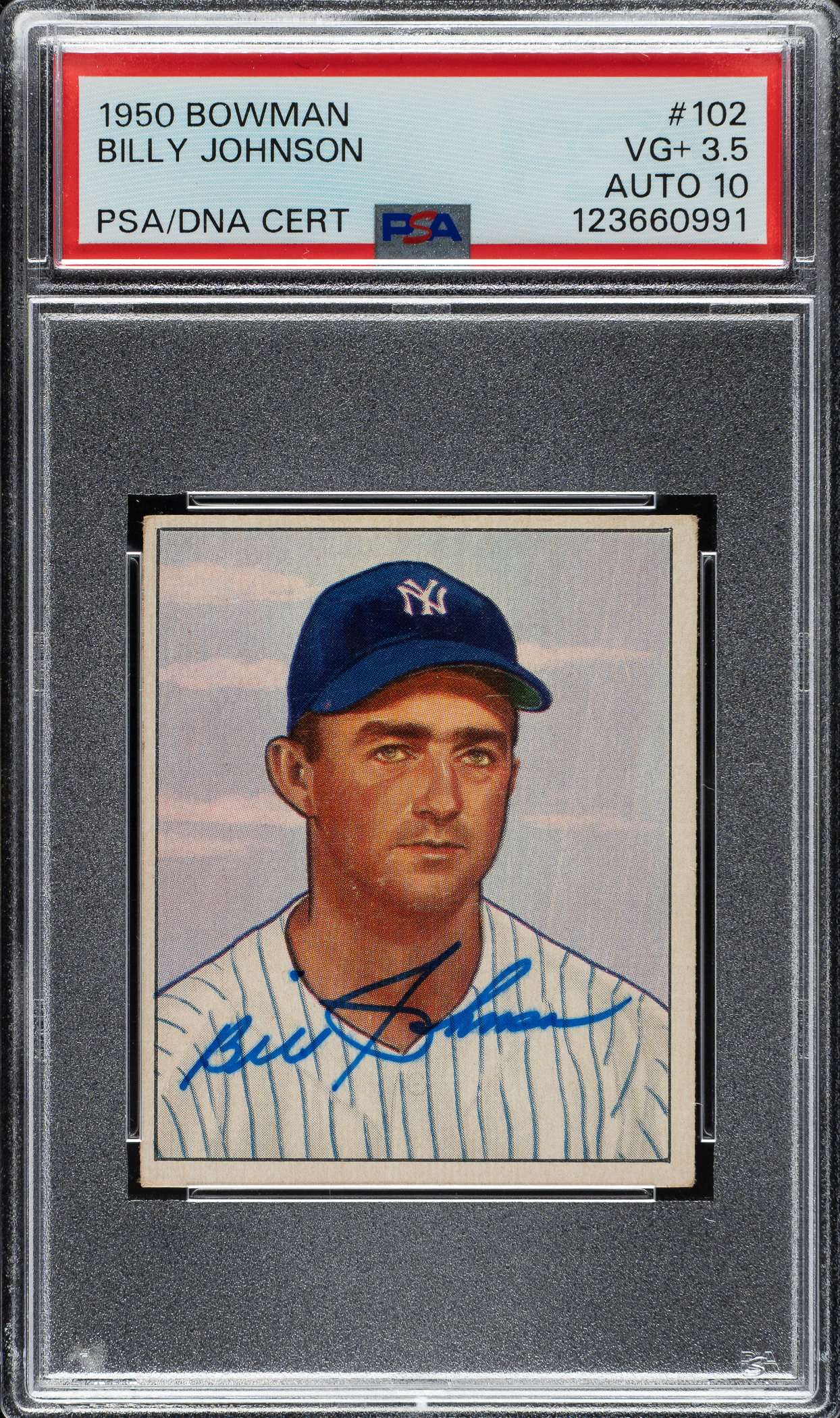 PSA/DNA has encapsulated the card, grading the signature GEM MINT 10 and the card VG+ 3.5. New York Yankees.