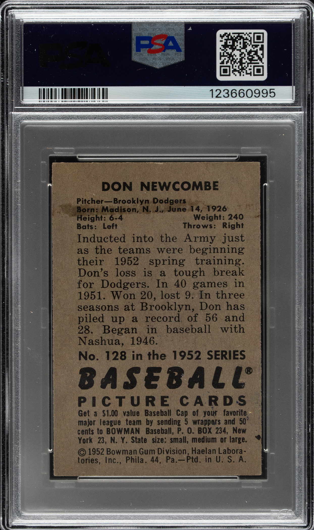 PSA/DNA has encapsulated the card, grading the signature NM-MT 8 and the card VG-EX 4. Brooklyn Dodgers.