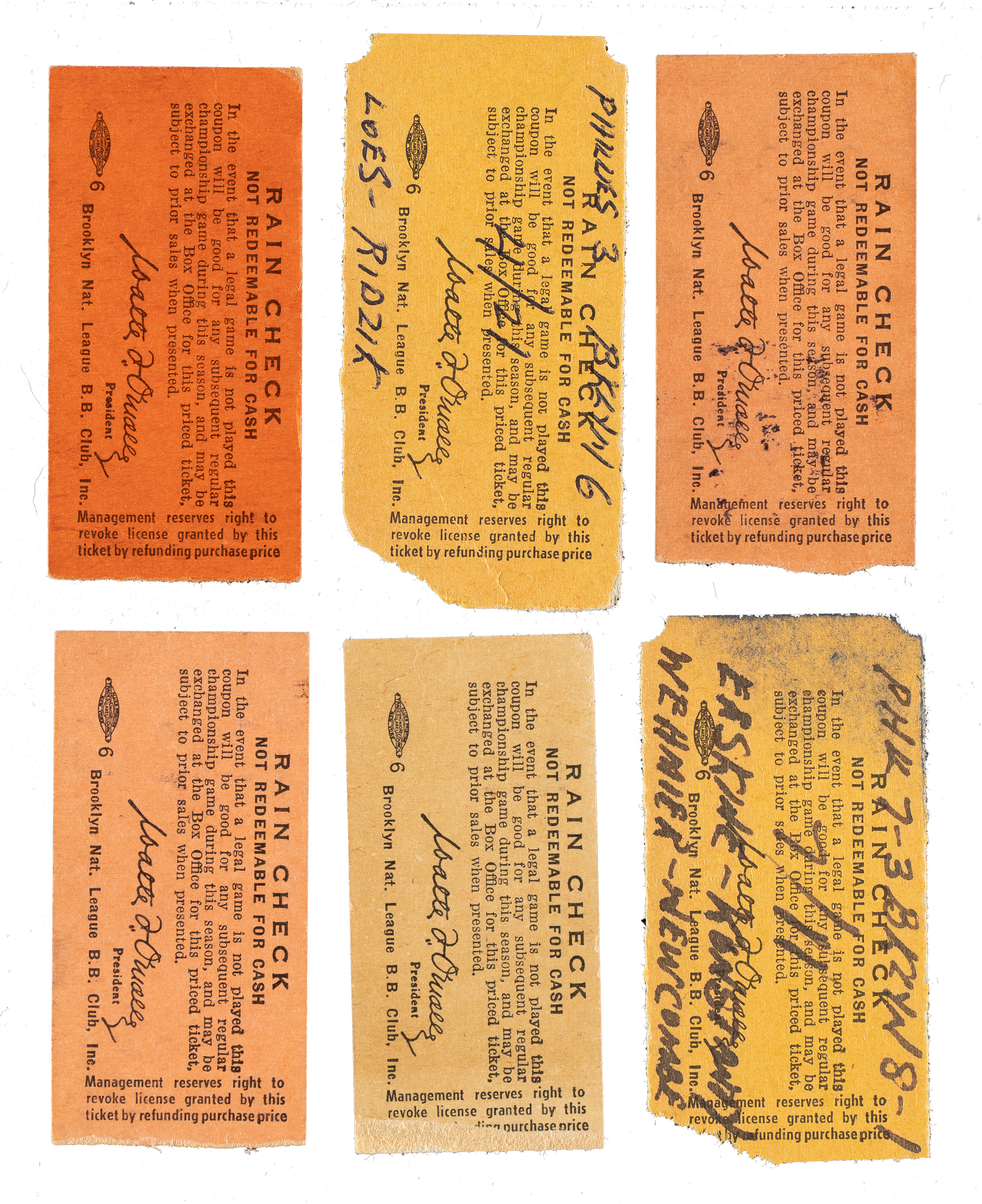 Collection of fourteen regular-season ticket stubs from the 1954 Brooklyn Dodgers season. Jackie Robinson appeared in all of the games listed in this group. Also included are games in which home runs were hit by Willie Mays, Stan Musial, and Duke Snider. Ten stubs feature the date printed on the front, which is provided in the composite below. This collection consists of the following home games: Two April 21 vs. Phillies, June 25 vs. Cardinals, July 8 vs. Giants, two July 11 vs. Reds, July 26 vs. Giants, two August 14 vs. Giants, two August 20 vs. Phillies, August 22 vs. Phillies, September 10 vs. Braves, and September 20 vs. Giants. The stubs, which vary in size, range from Poor to Vg condition. Total: 14 ticket stubs.