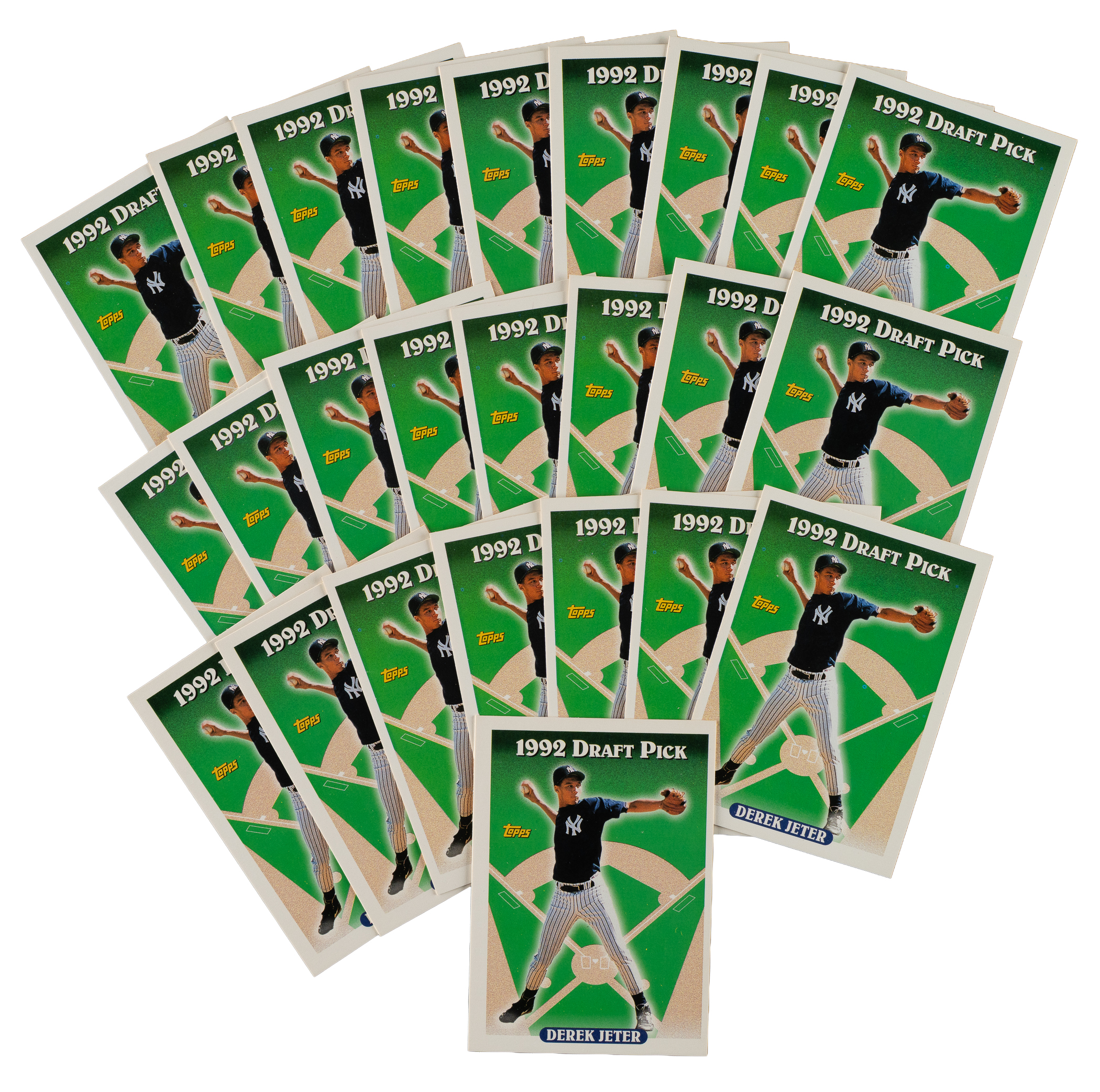 Collection of twenty-five 1993 Topps #98 Derek Jeter rookie cards. Condition is 64% Nr/Mt to Nr/Mt-Mt (including a few bordering on Mint) and 36% Ex to Ex-Mt (including a couple Vg-Ex). Total: 25 cards.
