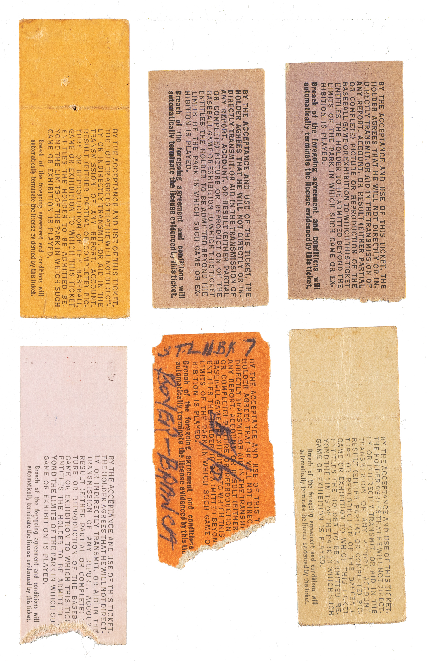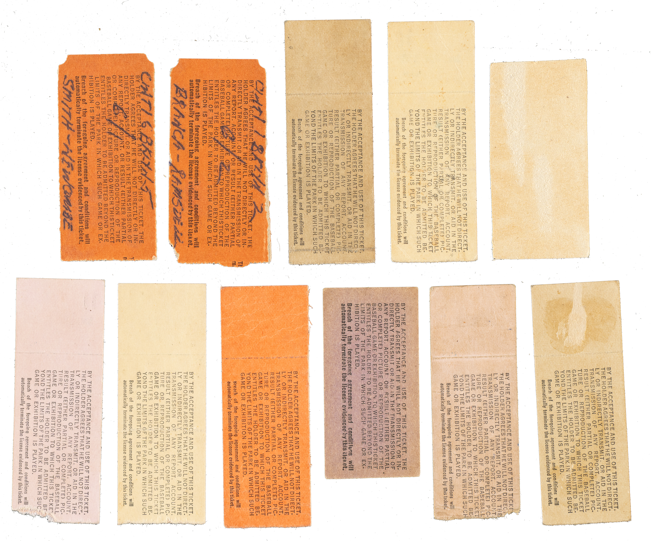Collection of 17 regular-season ticket stubs from the 1951 Brooklyn Dodgers season. Jackie Robinson appeared in all of the games listed in this group. Also included are games in which home runs were hit by Roy Campanella and Duke Snider. Fourteen stubs feature the date printed on the front, which is provided in the composite below. This collection consists of the following home games: April 23 vs. Braves, April 25 vs. Braves, April 29 vs. Giants, May 3 vs. Reds, May 6 vs. Cardinals, May 25 vs. Braves, June 1 vs. Reds, June 2 vs. Reds, two June 3 vs. Cubs, June 9 vs. Pirates, June 10 vs. Pirates, July 1 vs. Phillies, July 4 vs. Giants, July 5 vs. Giants, September 21 vs. Phillies, and September 23 vs. Phillies. The stubs, which vary in size, range from Poor to Vg condition. Total: 17 ticket stubs.