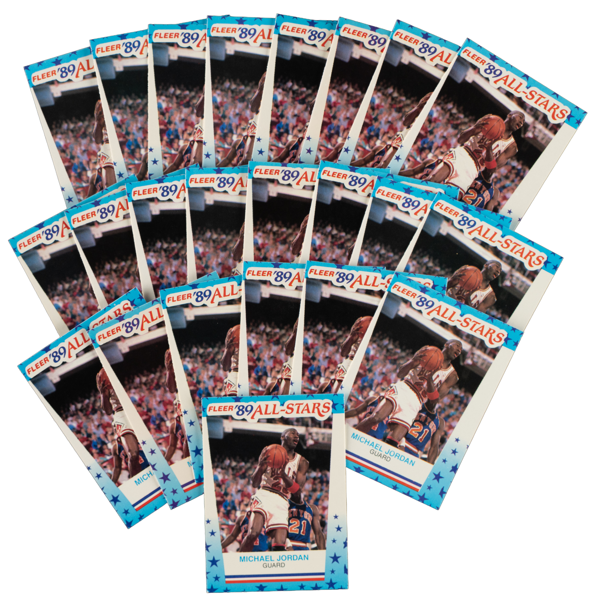 Collection of twenty-three 1989-1990 Fleer Stickers #3 Michael Jordan. Condition ranges from Ex to Nr/Mt (averaging Ex/Ex-Mt), with most grades determined primarily by centering. Total: 23 cards.