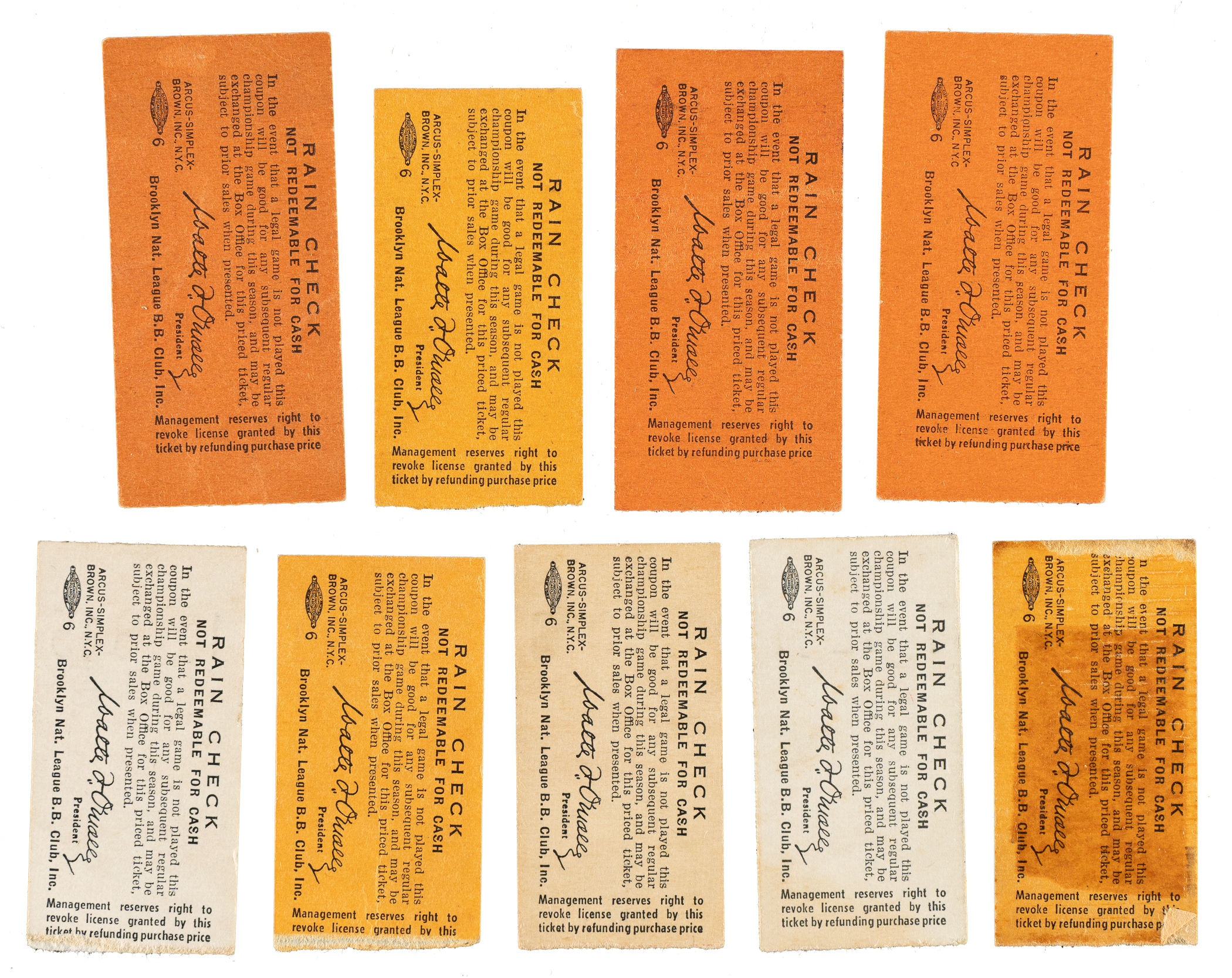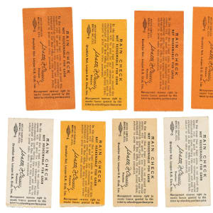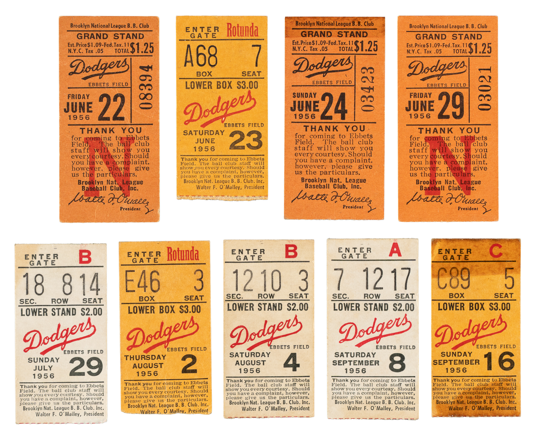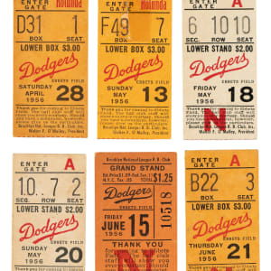 Collection of 15 regular-season ticket stubs from the 1956 Brooklyn Dodgers season. Jackie Robinson appeared in all of the games listed in this group. Also included are games in which home runs were hit by Roy Campanella, Frank Robinson, and Duke Snider. All stubs feature the date printed on the front, which is provided in the composite below. This collection consists of the following home games: April 28 vs. Pirates, May 13 vs. Giants, May 18 vs. Reds, May 20 vs. Cubs, June 15 vs. Braves, June 21 vs. Cardinals, June 22 vs. Reds, June 23 vs. Reds, June 24 vs. Reds, June 29 vs. Phillies, July 29 vs. Cubs, August 2 vs. Braves, August 4 vs. Cardinals, September 8 vs. Giants, and September 16 vs. Reds. The stubs, which vary in size, range from Poor to Vg condition. Total: 15 ticket stubs.